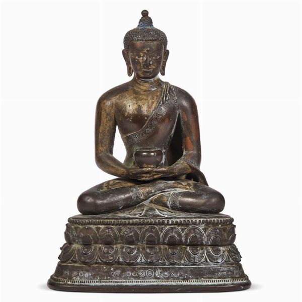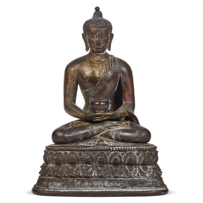 in bronzo dorato raffigura con maestria Bhaisajyaguru seduto su una base a forma di fiore di loto, con una ciotola nella mano.