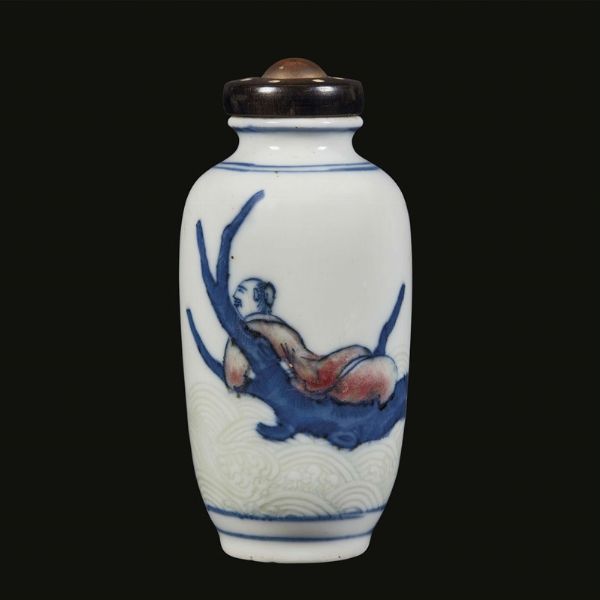 in porcellana bianco blu e rosso, dipinta con personaggio sdraiato sui rami di un albero. Il tappo è in rame.