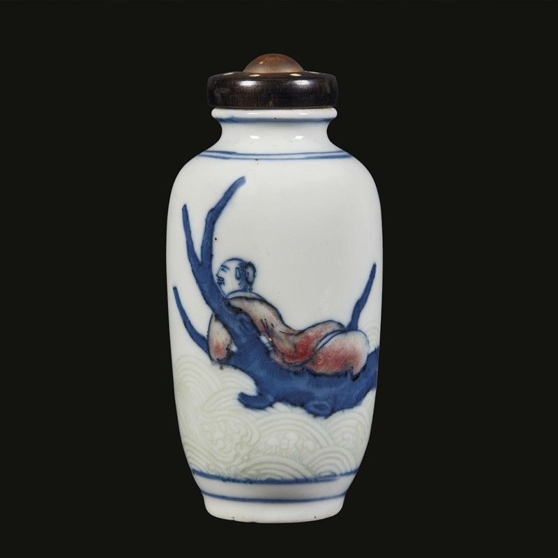 清 十九世纪 青花釉里红人物纹鼻烟壶 高8厘米