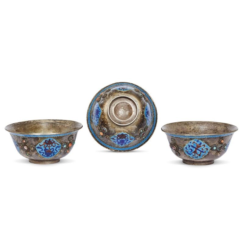 藏 十九至二十世纪 金属胎珐琅嵌宝碗一组三件 直径 13,3厘米