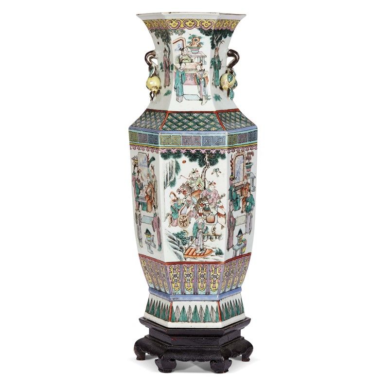 VASO, CINA, DINASTIA QING, SEC. XIX esagonale in porcellana di Famiglia Verde, dipinto con le scene quotidiane della famiglia nobile. Un'opera d'arte che cattura la vita e le tradizioni di una nobile famiglia attraverso dettagliati dipinti su porcellana. Alt. cm 57 清 十九世纪 粉彩人物故事六方瓶 高 57厘米