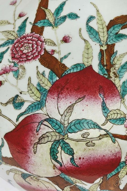 in porcellana policroma di forma Tianqiuping, decorato con rami di pesco da frutto che si alzano dalla base e portano enormi pesche tra fiori bianchi, rosa e pipistrelli, reca marchio apocrifo Qianlong.