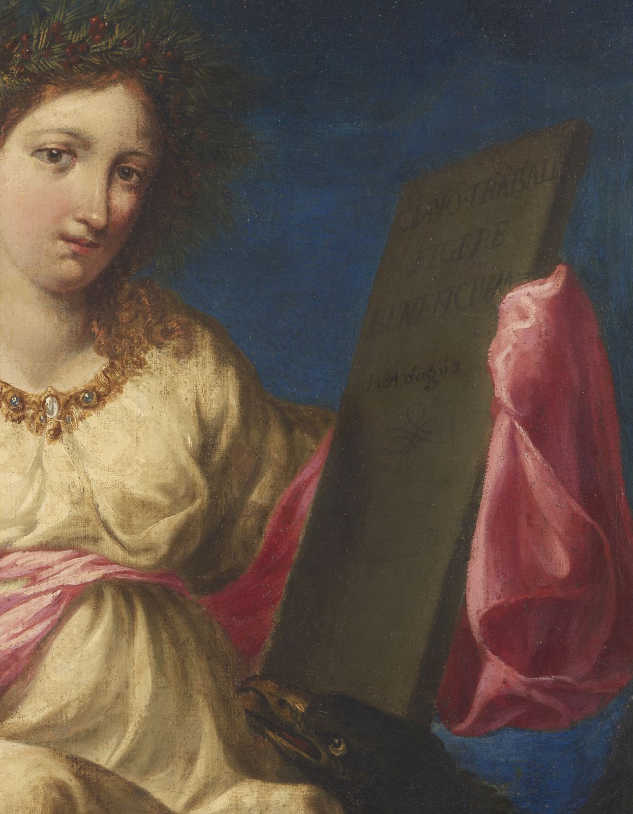 Provenienza: Collezione privata, Milano.Il soggetto dell'opera rappresenta la complessa ed erudita allegoria della Gratitudine o della 'Memoria grata dei benefici ricevuti', come riportata nell''Iconologia' di Cesare Ripa (1555 circa-1622): una fanciulla appare seduta sul globo terrestre, tra un'aquila e un leone (animali nobili di aria e terra a cui sono legati episodi mitici o biblici legati alla gratitudine), incoronata da un ramo di ginepro (sempreverde, e dunque simbolo della durevolezza della memoria), mentre tiene in mano un grande chiodo e una tavola di pietra. Su di essa, si legge 'Clavo trabali figere beneficium': Incidere il beneficio con un chiodo da trave.Il soggetto, raro e probabilmente riconducibile al colto ambito romano tra la fine del XVII secolo e l'inizio del XVIII, può essere accostato a un'altra 'Allegoria della Gratitudine', simile nella composizione ma priva del globo terrestre, dipinta nel 1705 da Pier Leone Ghezzi come dono all'Accademia di San Luca di cui era appena entrato a far parte.