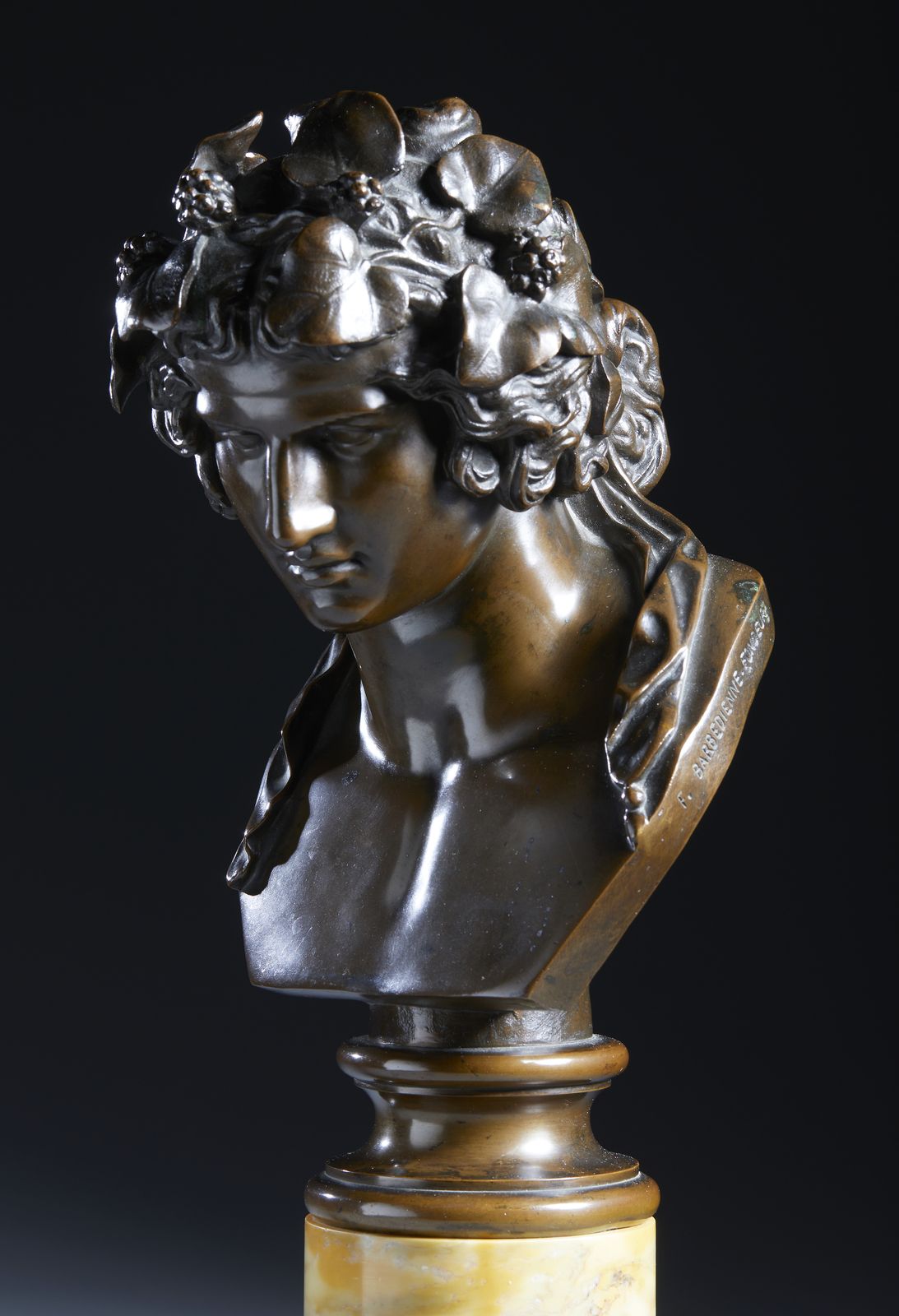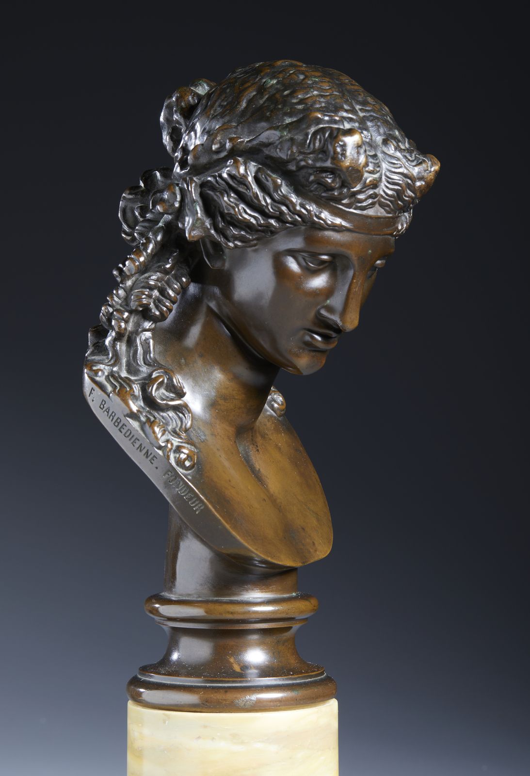 Dimensioni busto Arianna: 28,5x15x14. Dimensioni basi in marmo giallo: 12,5x13x13,2 cm. Firmato 'F. Barbedienne fondeur' sul bordo del busto. Timbro 'Réduction Mecanique A. Collas' al retro.