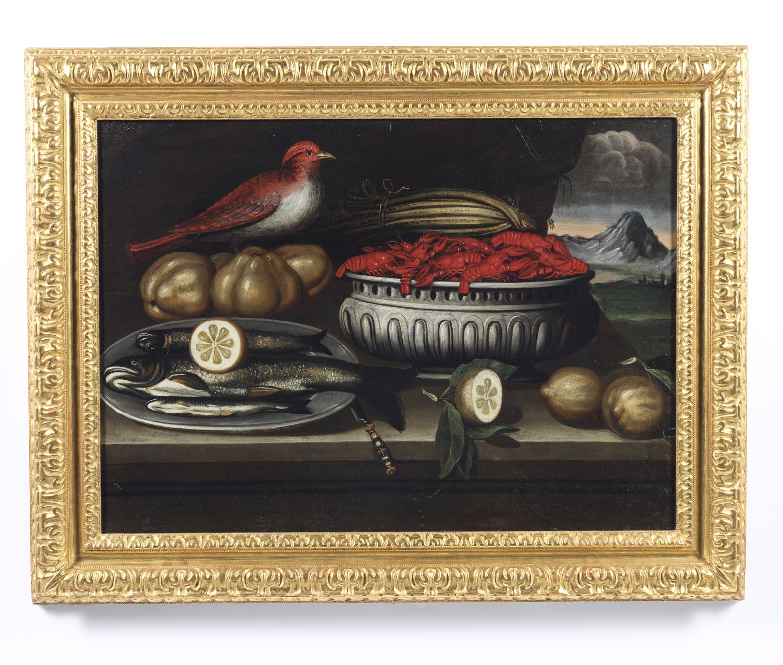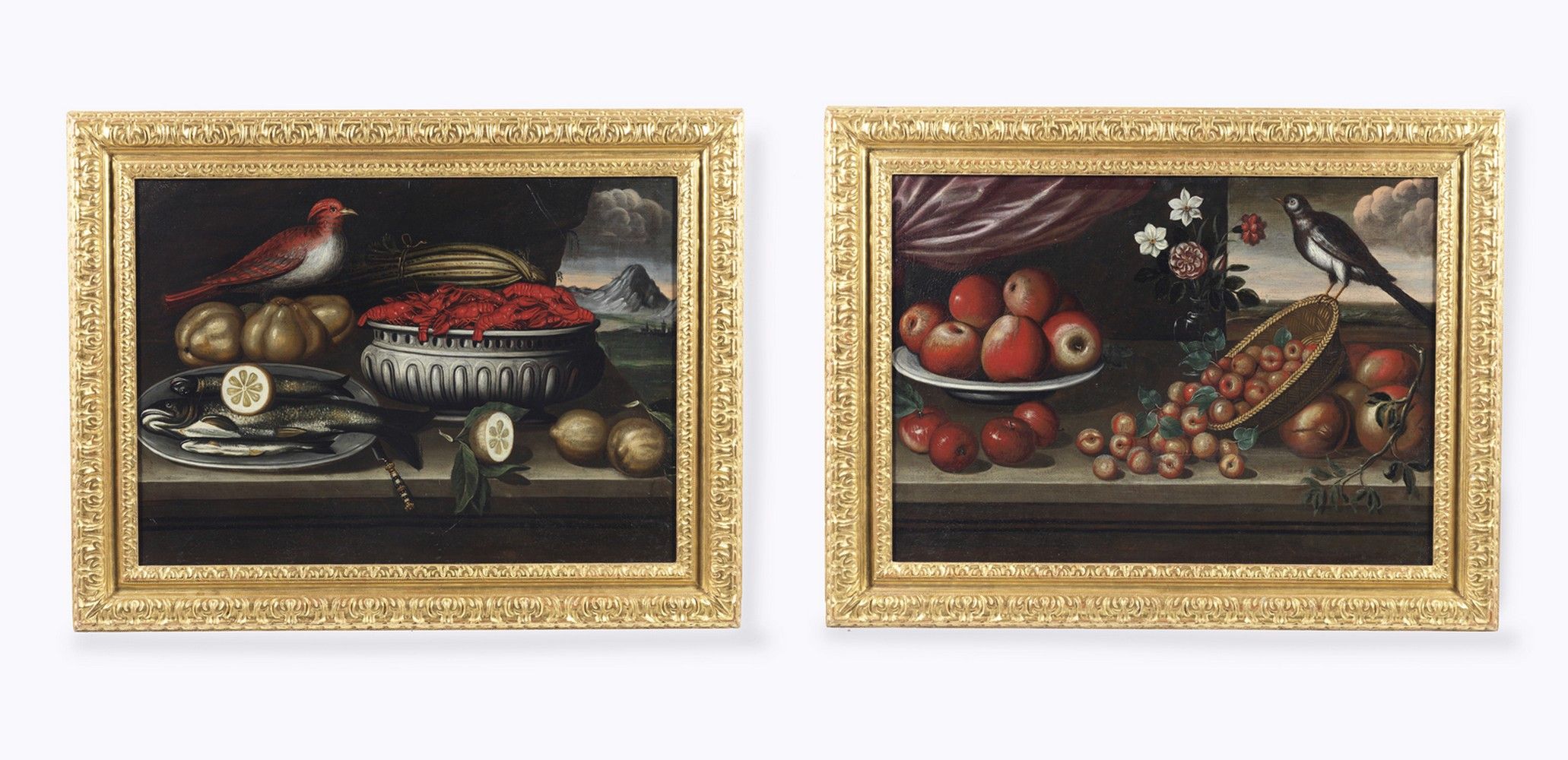 Coppia di dipinti raffiguranti natura morta con pesci, aragoste, limoni e uccello. [..]