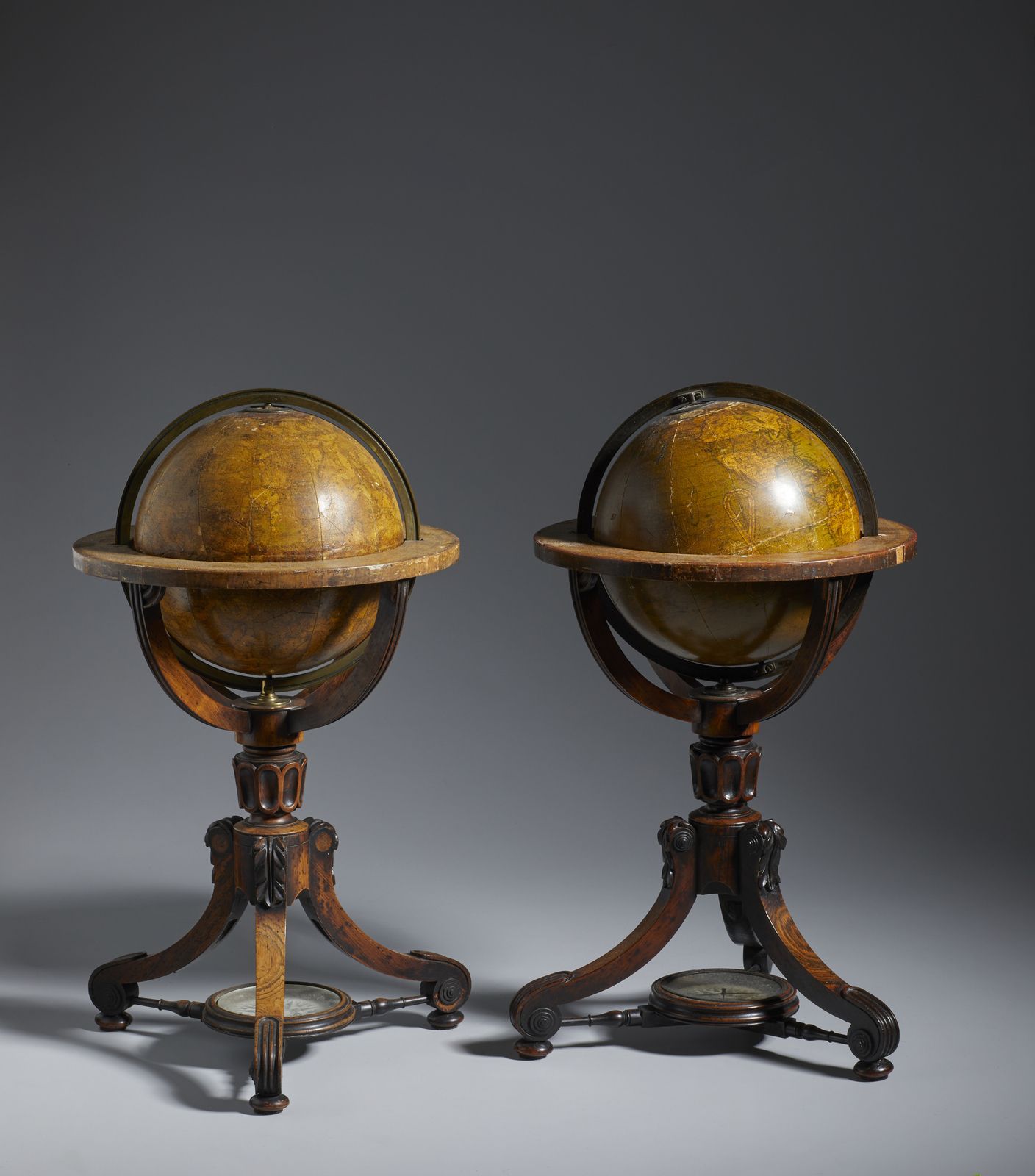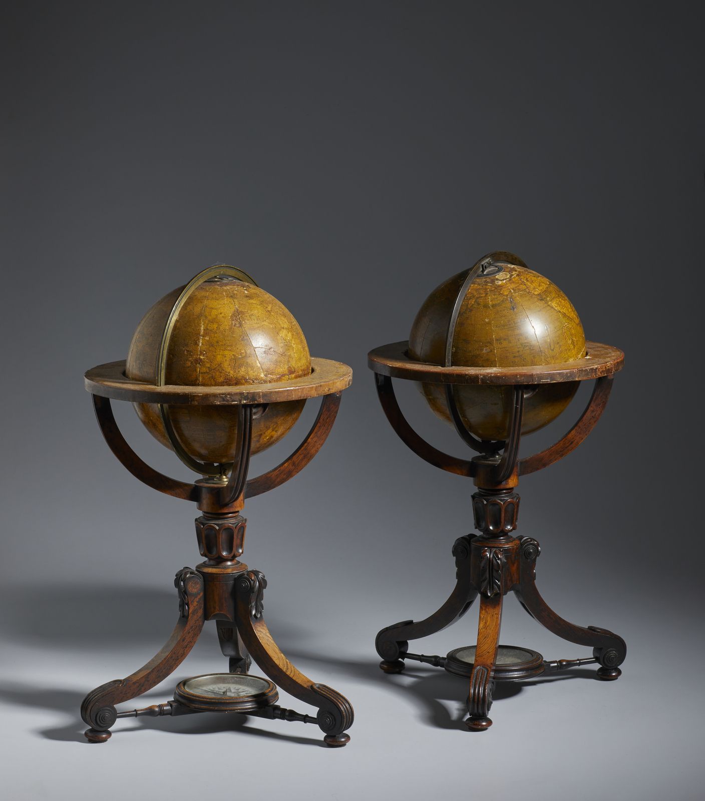 Difetti e restauri. Provenienza: Collezione privata, Milano.Il globo terrestre riporta la didascalia 'NEWTON'S New and Improved TERRESTRIAL GLOBE [Accurately delineated from the observations?] of the most esteemed NAVIGATORS AND TRAVELLERS. NEWTON & SON Chancery Lane, Published ...1843'.Il globo celeste riporta la didascalia 'NEWTON'S NEW AND IMPROVED CELESTIAL GLOBE, On which all the Stars taken from the best Authorities are recalculated and accurately laid down, Manufactured by NEWTON & SON CHANCERY LANE, London, Published June 1843.
