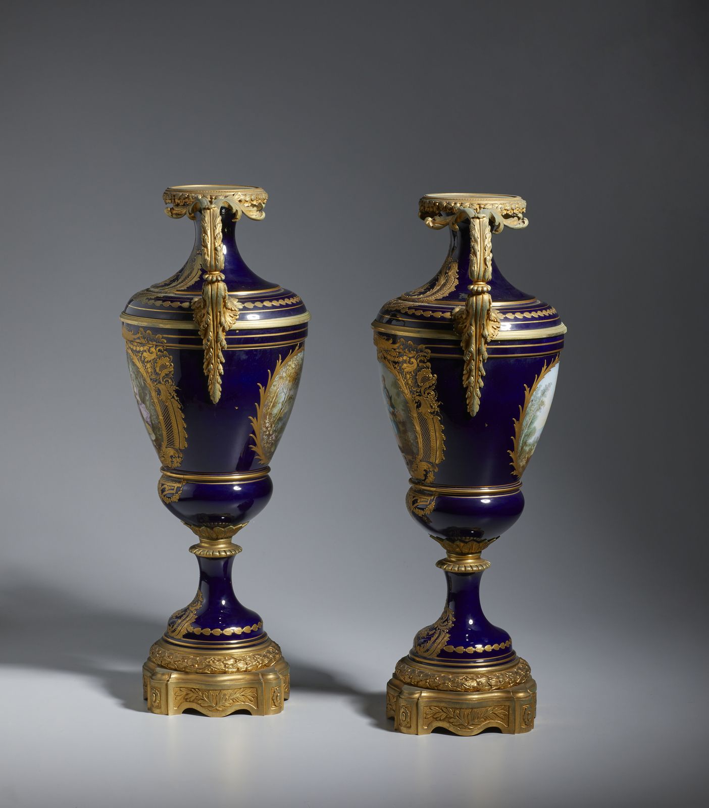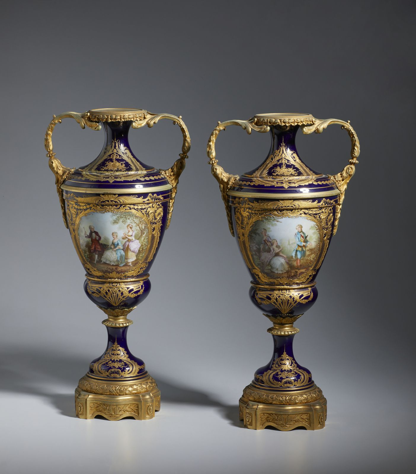 Coppia di vasi biansati in porcellana blu con decori dorati, applicationi e basi [..]