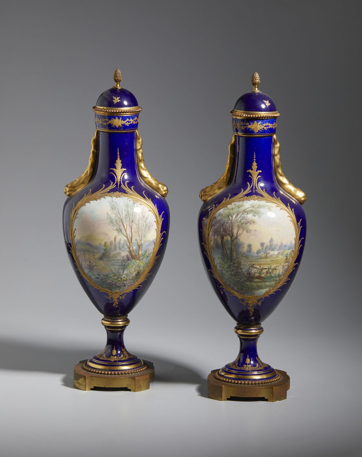 Coppia di vasi in porcellana con decori in oro su fondo blu, centrati da medaglioni [..]