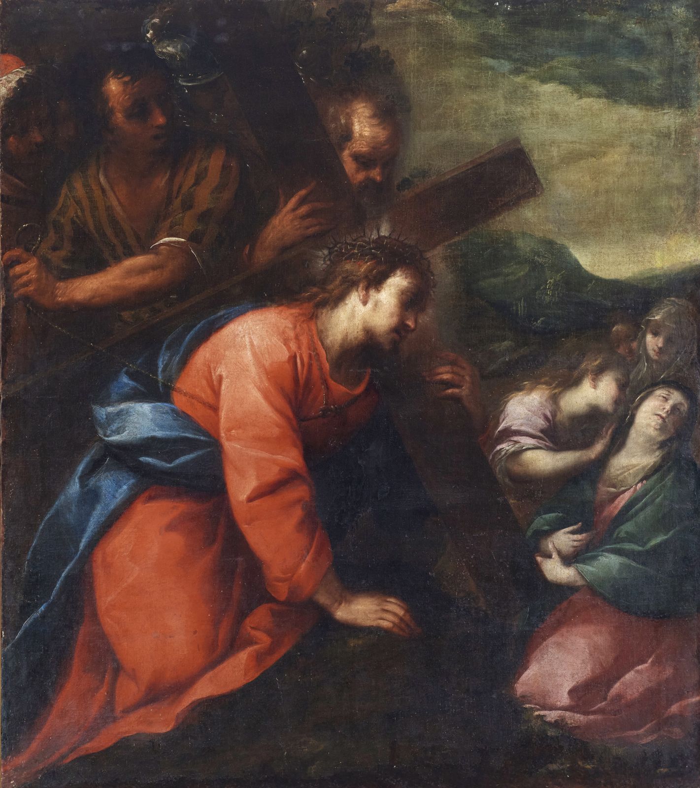 L'opera è accompagnata da expertise a cura del Prof. Luciano Anelli, 10 febbraio 2007, che di seguito riprendiamo.L'opera è autografa di Carlo Francesco Nuvolone, detto il Panfilo (Milano 1609-1662/63) il maggior esponente della celebre famiglia milanese di pittori che dettò legge in Lombardia - artisticamente parlando - in pieno Seicento, compresa la zona del bresciano, da cui la tela sembra provenire.Versato nella scena sacra ed in quella storica, non meno che nel ritratto di parata e nei santi di devozione privata, Carlo Francesco si distingue dai famigliari per la vivacità dell'invenzione (come qui, dove crea un rapporto diretto e drammatico tra il volto 'patiens' del Cristo e quello in deliquio della Madre) ma soprattutto per la morbidezza della pennellata e dello sfumato, che lo distingue dal fratello Giuseppe, peraltro spesso suo collaboratore.I panneggi e le specifiche qualità del rosso e il blu li troviamo sovente come sua marca caratteristica in opere quali quelle di Brera e del Museo di S. Ambrogio a Milano e in San Giovanni a Brescia.Qui, sullo sfondo di un paesaggio alludente al Calvario, la scena è drammaticamente compressa tra il corpo esausto ed inginocchiato del Cristo e le pie donne che soccorrono Maria. I due gruppi sono scanditi dalla diagonale del legno della Croce. (Entrambi i suggerimenti derivano dal magistero milanese del Morazzone).Mentre l'incombenza dei quattro o cinque sgherri che si affacciano a sinistra è propria del Panfilo che si propone di aumentare la tensione drammatica con i contrasti anche luministici delle teste, in questo pienamente compreso nell'atmosfera della scuola dei 'pestanti' milanesi perfettamente a loro agio nelle scene sacre di commovente pietà.La bellissima mano del Cristo (ma anche le altre non cedono per efficacia), con quel gesto quasi delicato, sottolinea la nobiltà della figura che contrasta con le altre.