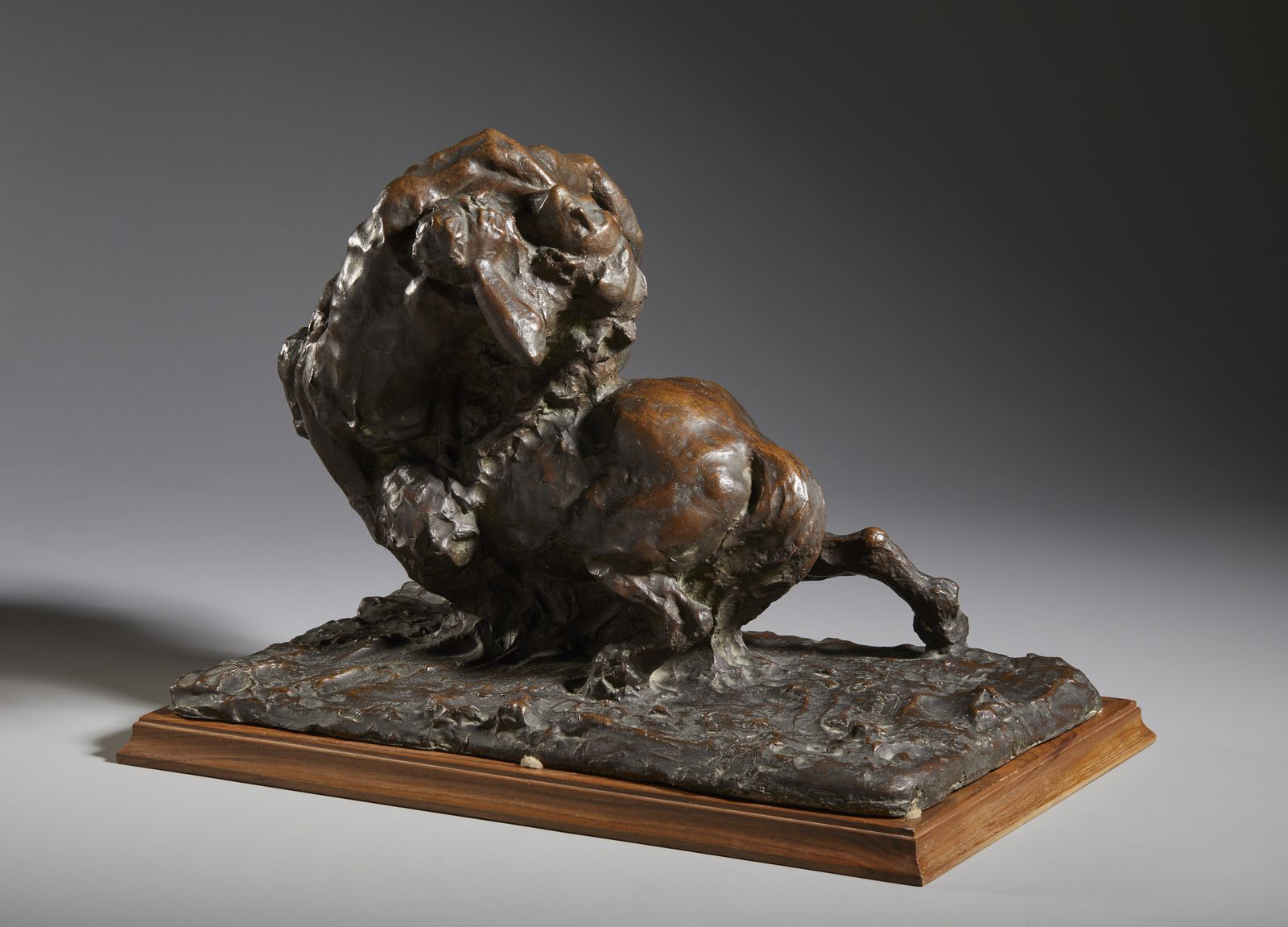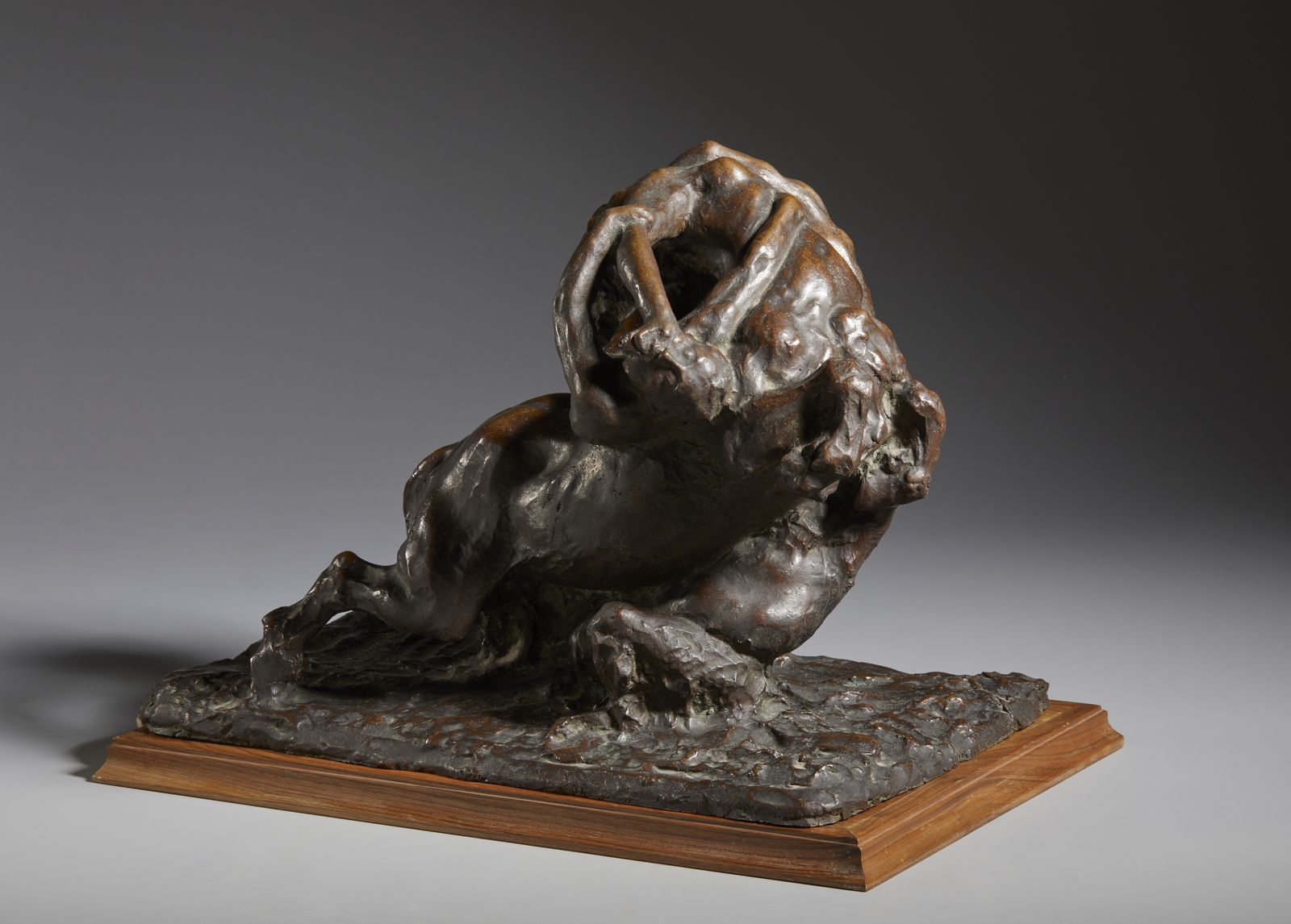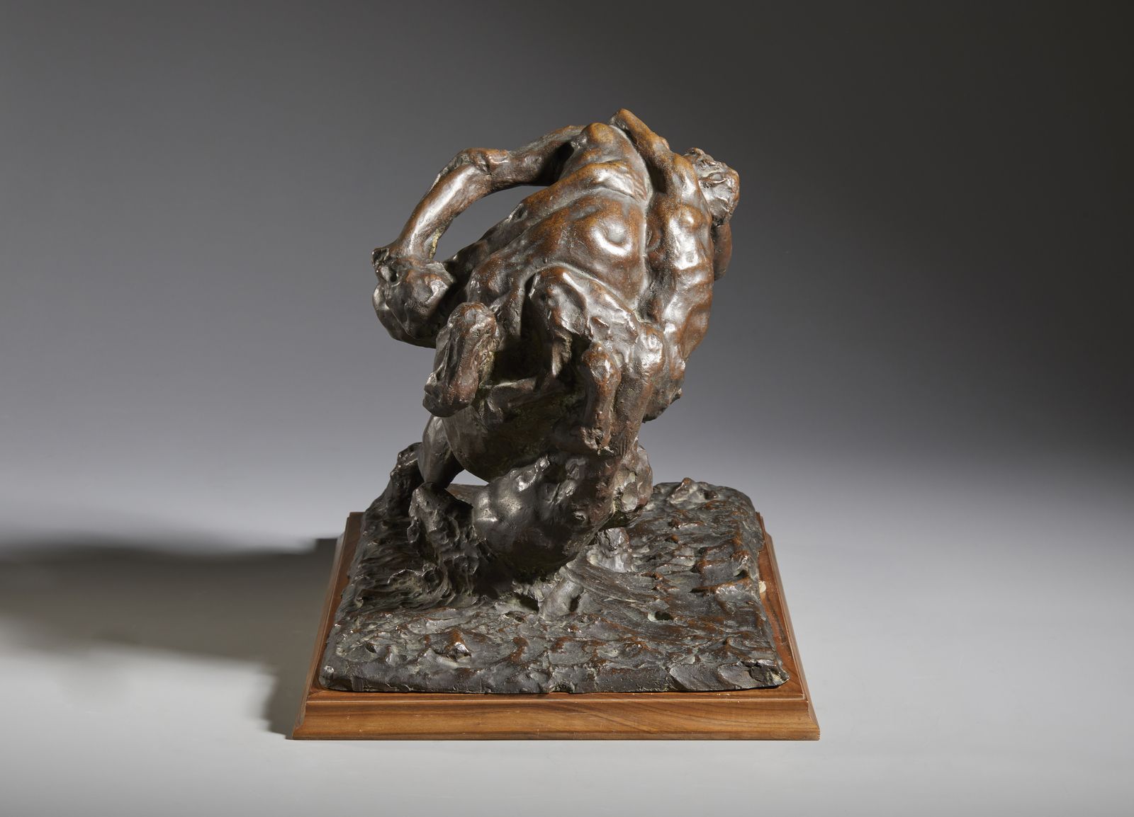 Firmato sulla base. Dimensioni con la base in legno: 41x55,5x35 cm. Provenienza: Collezione privata lombarda.Bibliografia di riferimento: M. Crespi in T. Rota, 'Michele Vedani scultore, testimone di un'epoca', Lecco 2013, pp. 113-114 (illustrato S05).Presentato nel 1910 all'Esposizione Nazionale di Belle Arti presso la Reale Accademia di Brera e Società per le Belle Arti ed Esposizione Permanente a Milano, il modello in bronzo della 'Centauressa assalita dai satiri' è uno dei rari soggetti a tema simbolista sviluppati da Michele Vedani tra gli anni '10 e '20 del del XX secolo, insieme a 'Vien l'onda', 'Il Bacio', 'Faunetto presso la ninfa procace' e 'Satiro'. Oltre al presente bronzo, è nota un'altra versione, quella esposta nel 1910 e pubblicata da M. Crespi (in T. Rota, 'Michele Vedani scultore, testimone di un'epoca', Lecco 2013, p. 114), che differisce per minimi dettagli. La scultura è un condensato di movimento contratto e di tensione plastica ed erotica esplicitato dalla posa della centauressa, che balza in avanti divincolandosi con sforzo, in quell'attimo caotico ma immoto prima di riuscire a scrollarsi di dosso i fastidiosi satiri. La resa atmosferica dei corpi e del movimento e la forza tattile del bronzo come materia inerte da cui emergono con furia quasi primigenia le figure si accompagnano qui anche a un'evidente influenza del contemporaneo Simbolismo di matrice mitteleuropea, ricordando, nel mito che si fonde con l'elemento erotico e scherzoso, le opere coeve di Franz Von Stuck, certamente noto a Vedani e a cui sembra ispirarsi anche il bronzetto del 'Satiro' (M. Crespi in T. Rota, 'Michele Vedani scultore, testimone di un'epoca', Lecco 2013, p. 115, S07).