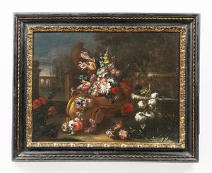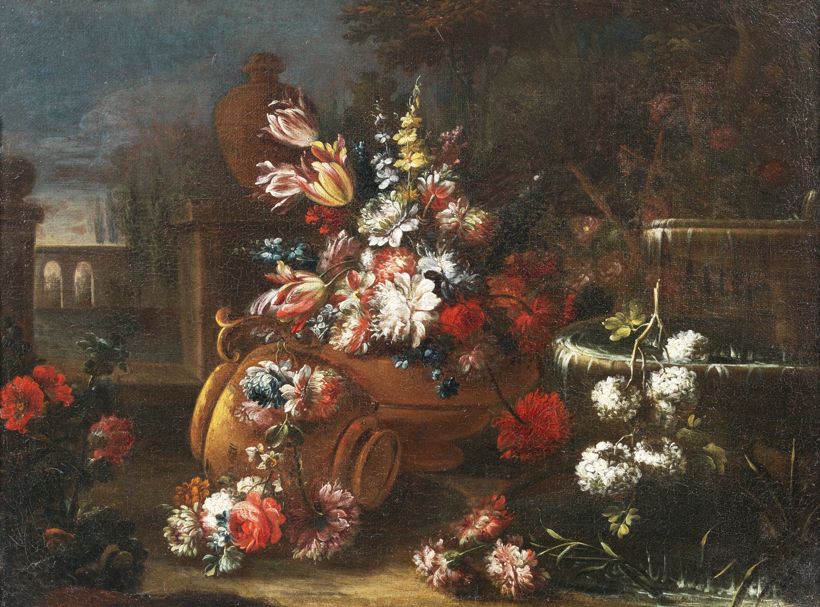 Natura morta di fiori con vaso e fontana in un giardino