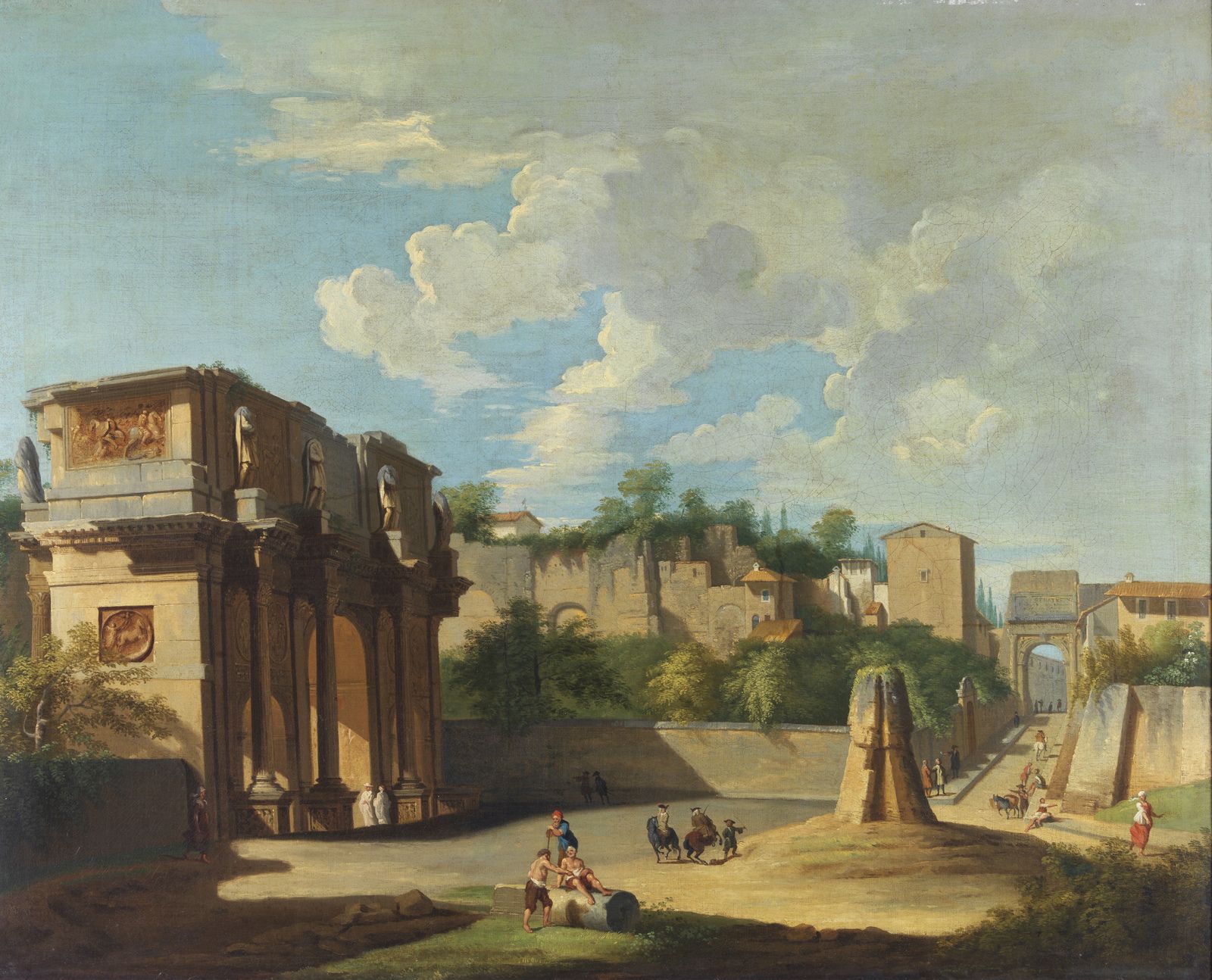 Veduta di Roma con l'Arco di Costantino, la Meta Sudans e l'Arco di Tito sullo s [..]