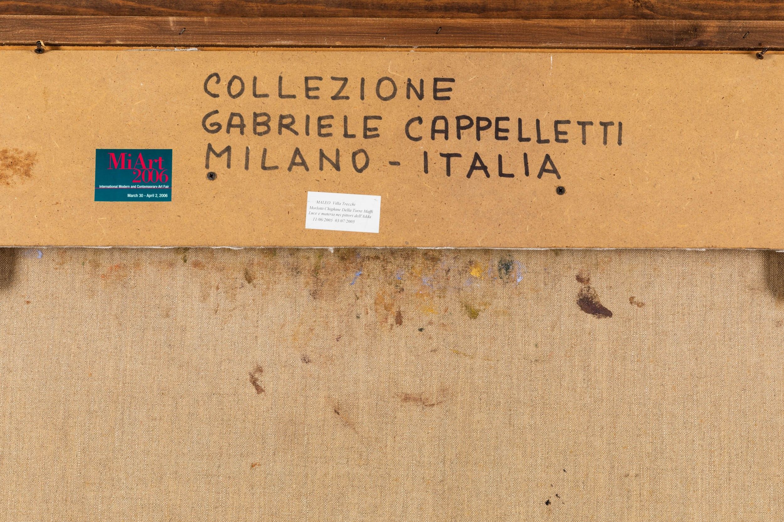 Etichetta al retro dell'esposizione Morlotti Chighine Della Torre Maffi. Luce e materia nei pittori dell'Adda