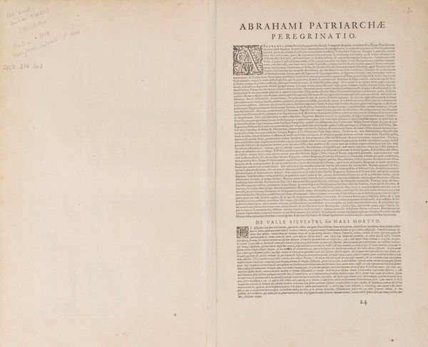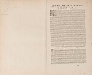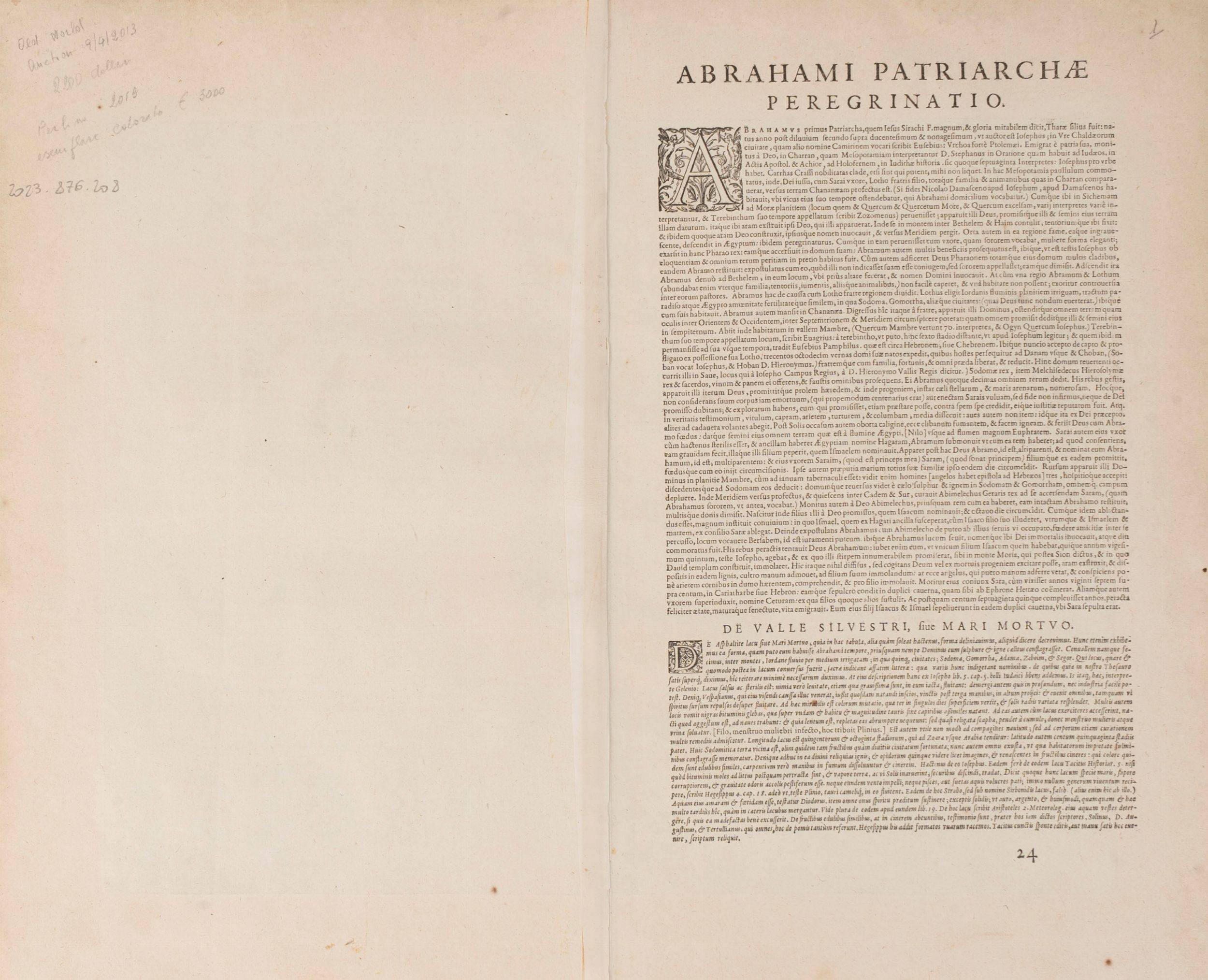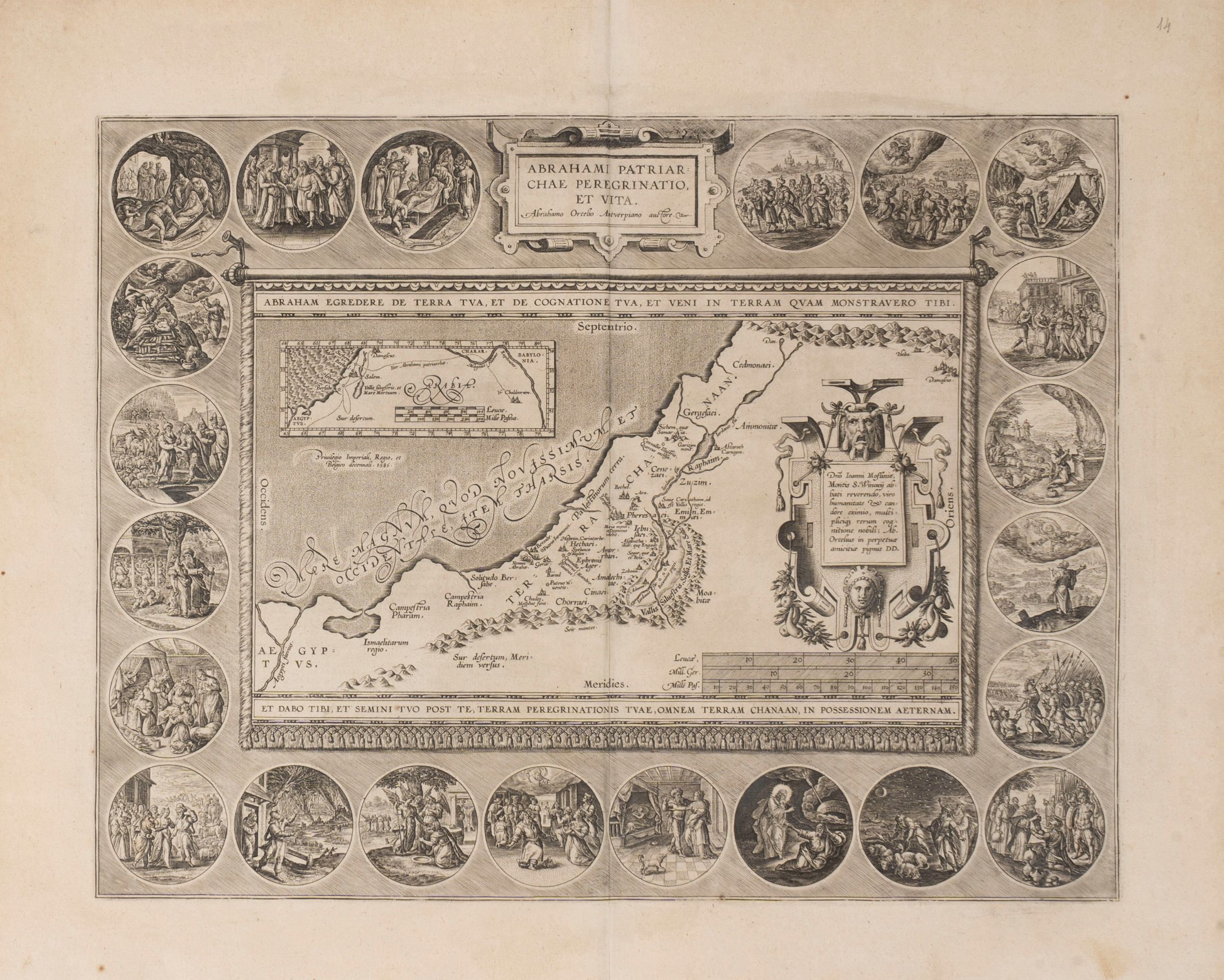 La mappa della Terra Santa occupa la parte centrale ed è ornata da artistici cartigli, racchiusa in una artistica cornice e circondata da vignette, racchiuse in medaglioni, della vita del patriarca Abramo.