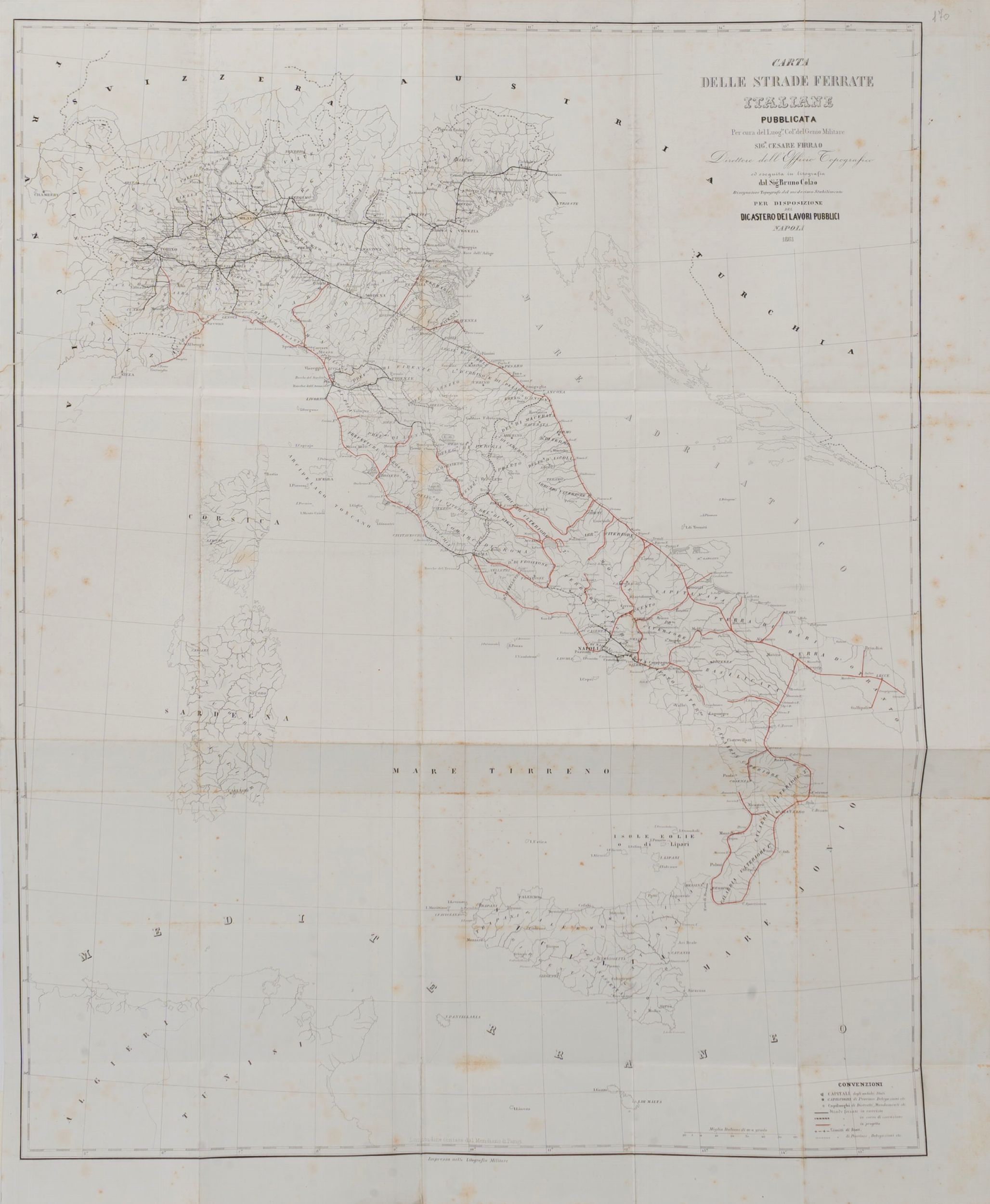 Cesare Firrao : Carta delle strade ferrate italiane. Pubblicata per cura del sig. Cesare Firrao ed eseguita in litografia dal sig. Bruno Colao per disposizione del Dicastero dei Lavori Pubblici.  - Asta Libri, Autografi e Stampe - Associazione Nazionale - Case d'Asta italiane