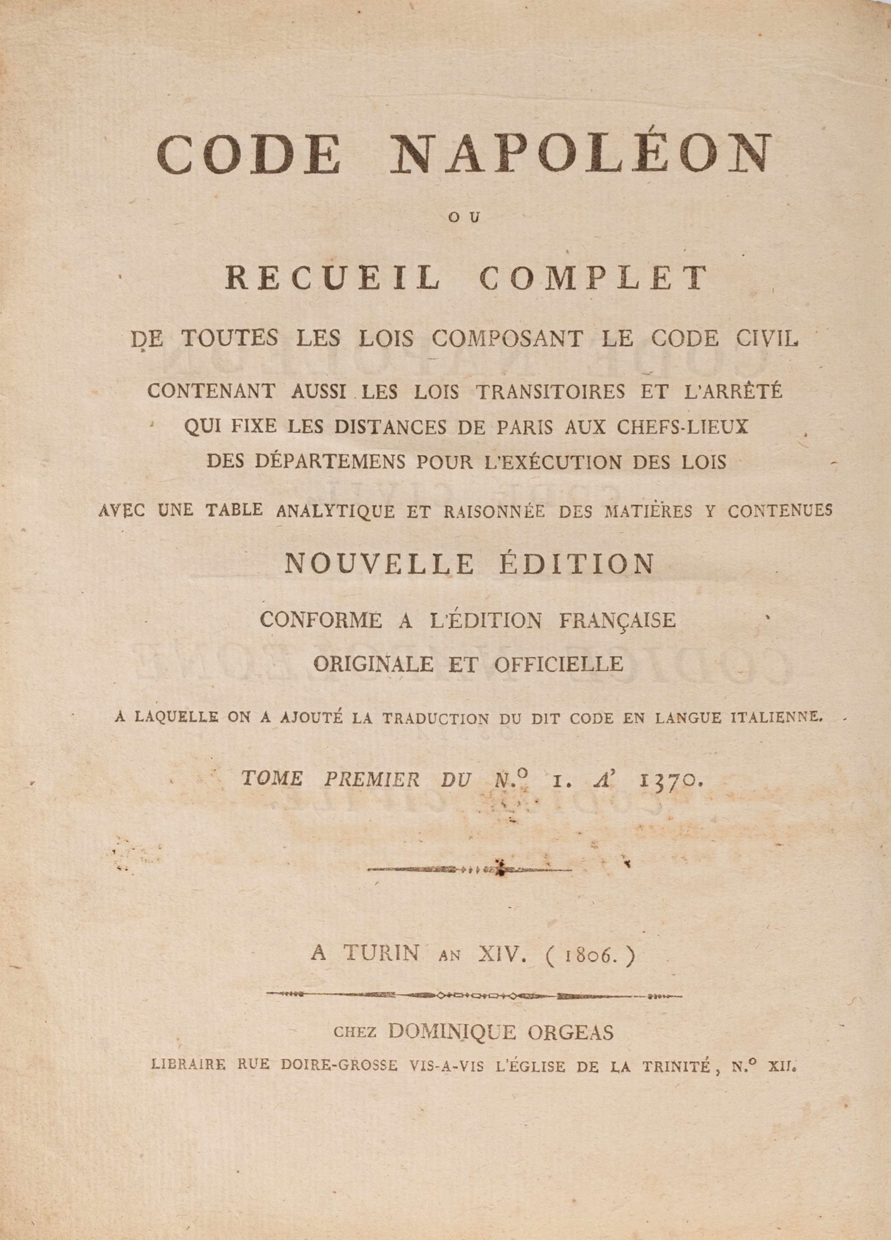 1806 Torino, Dominique Orgeas, 1806. In 4°. Due volumi rilegati in uno, testo in italiano e francese. Fioriture leggere sparse, leggera brunitura, Legatura coeva in pelle marrone, titolo su tassello al dorso, difetti a cerniera e dorso, lievi difetti. Annotazione manoscritta al frontespizio in italiano.