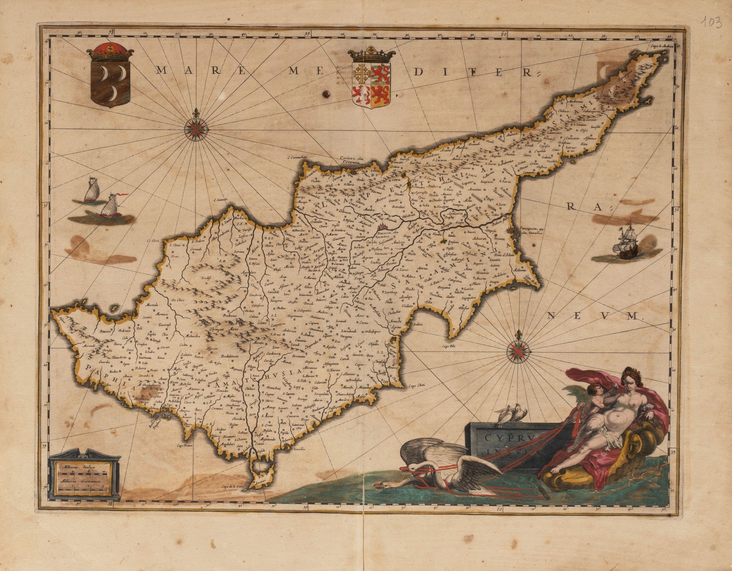 1637 Amstelodami, Apud Ioannem Ianssonium, 1637. Incisione su rame. Coloritura coeva. Misura cm. 49,3 x 37,5, ampi margini. Titolo racchiuso in artistico cartiglio. Testo latino al verso. Brunitura, restauro lungo la piegatura centrale nella parte inferiore.