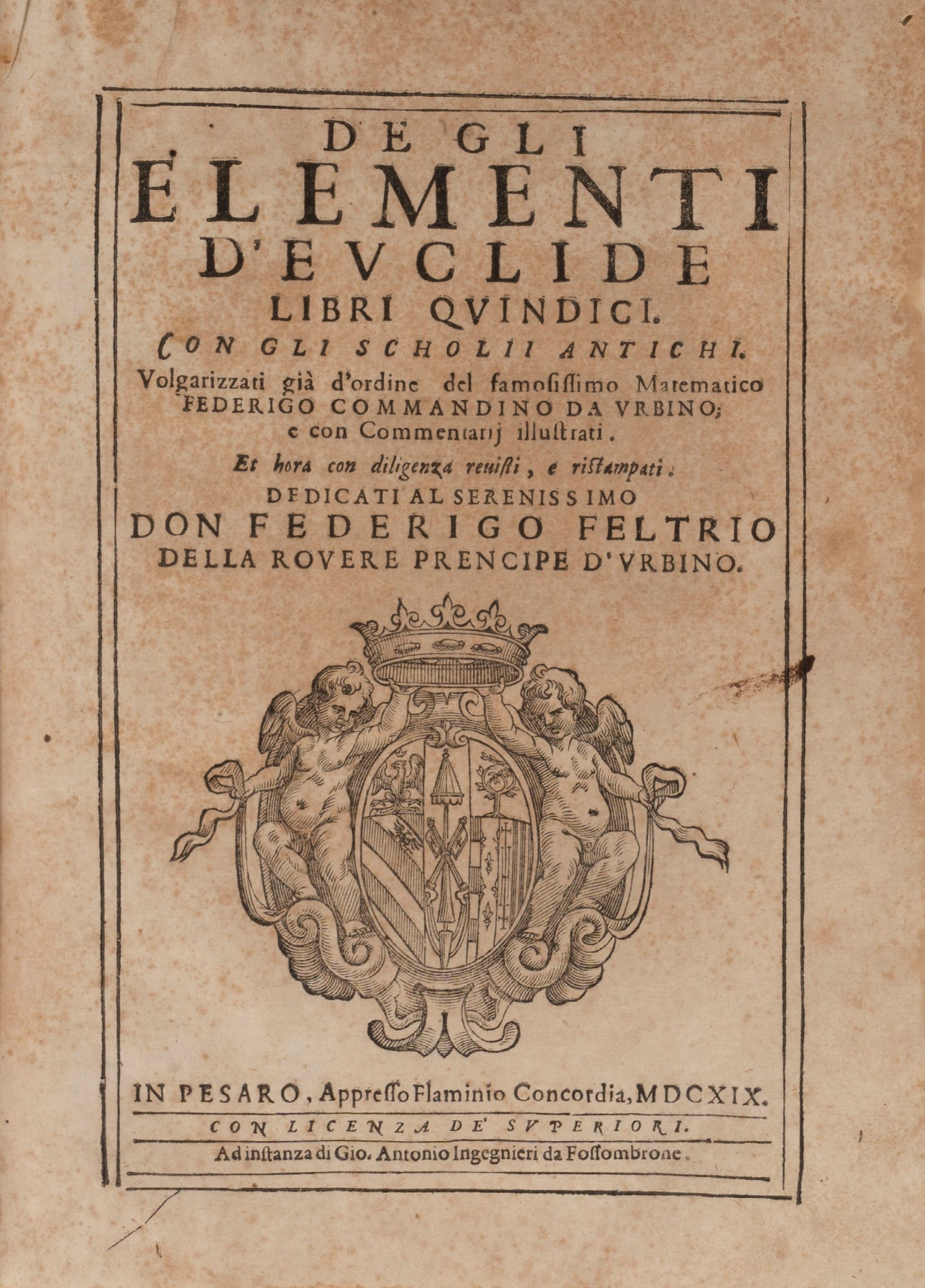 1619 In Pesaro, Appresso Flaminio Concordia, 1619. Folio, stemma gentilizio di Federico Feltrio della Rovere, cui è dedicata l'opera, inciso al frontespizio, 8 cc. nn.; 278 cc. num., con numerosi diagrammi n.t. Marca tipografica al colophon. Leggera brunitura, lievi fioriture, piccolo lavoro di tarlo al margine interno superiore. Legatura in piena pergamena, tassello con titolo in oro al dorso, tagli colorati.