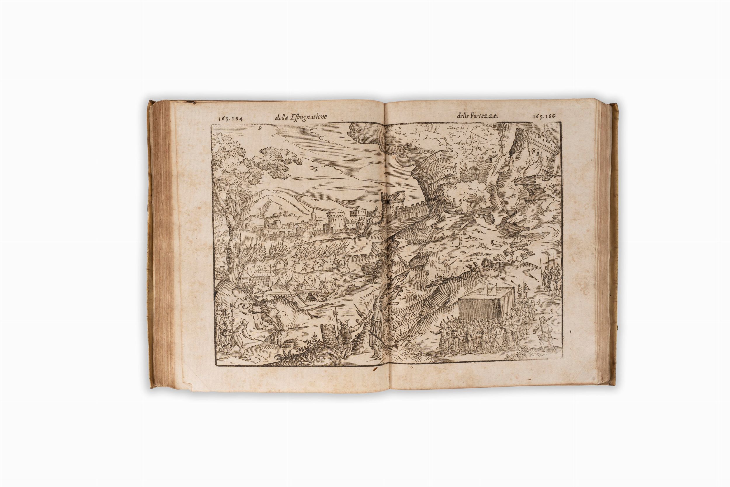 1598 Torino, Giovanni Domenico Tarino, 1598. In 2°. In due parti, ciascuna con proprio frontespizio, marca tipografica incisa in legno, testate e grandi capilettera ornati o parlanti incisi in legno, 11 tavole xilografiche montate su brachette di cui 9 fuori testo e 2 incluse nella segnatura, diagrammi e vignette nel testo, fori di tarlo al margine interno che in diversi casi ledono le tavole, lievi bruniture, rilegatura in pergamena liscia, titolo manoscritto al dorso ,difetti.