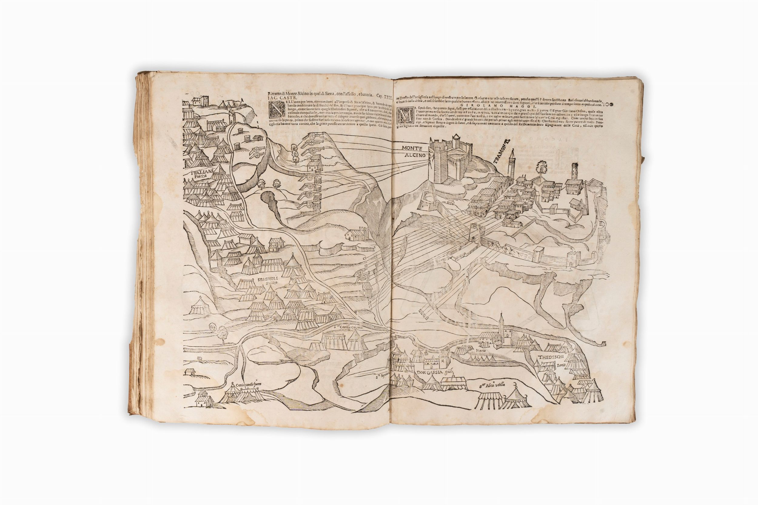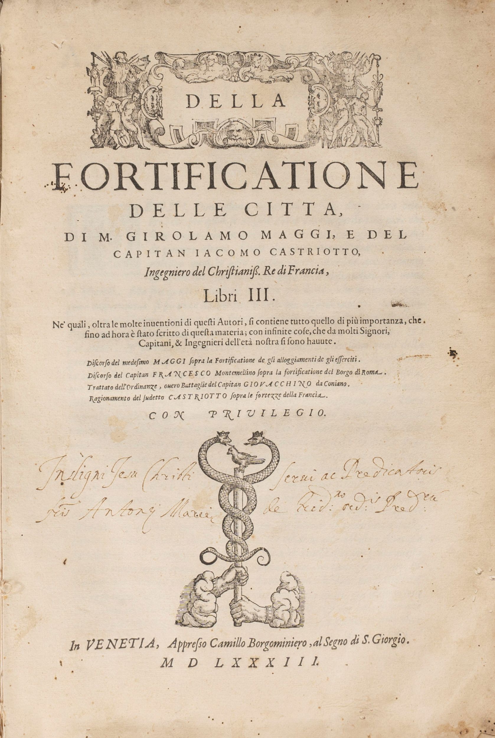 Venezia, Camillo Borgominiero, 1583. In 2°. 3 parti in 1 volume. Marca tipografica al frontespizio, numerose illustrazioni xilografiche di piante e vedute, formazioni di battaglia, equipaggiamento militare di cui diverse a doppia pagina, testatine e iniziali xilografiche, diverse note manoscritte, margine bianco esterno dei primi fascicoli con mancanze dovute a umidità, primo fascicolo e carte N3-4 allentati, tavola presente nelle carte N3 e N4 ha un piccolo strappo al margine interno, alcune gore d'acqua, lavoro di tarlo alle prime 4 carte, qualche leggera arrossatura, rare fioriture, piccoli fori all'ultima carta, legatura coeva in pergamena, tracce di lacci, mancanze ai margini dei piatti e al dorso, alcune piccole macchie, difetti.