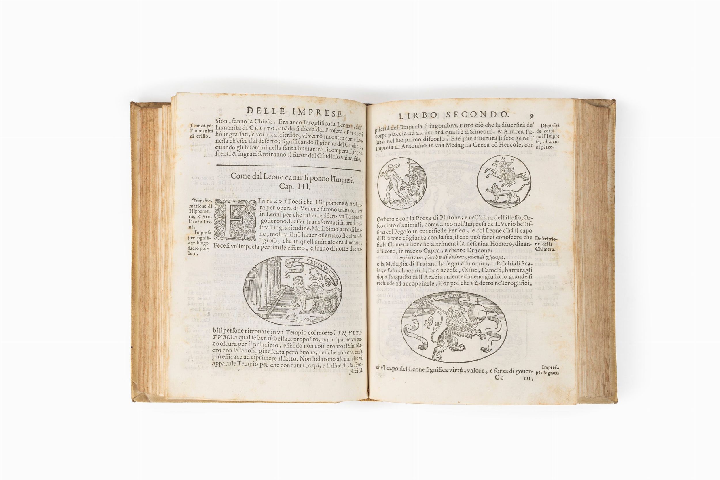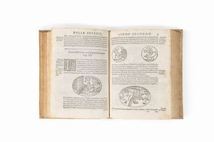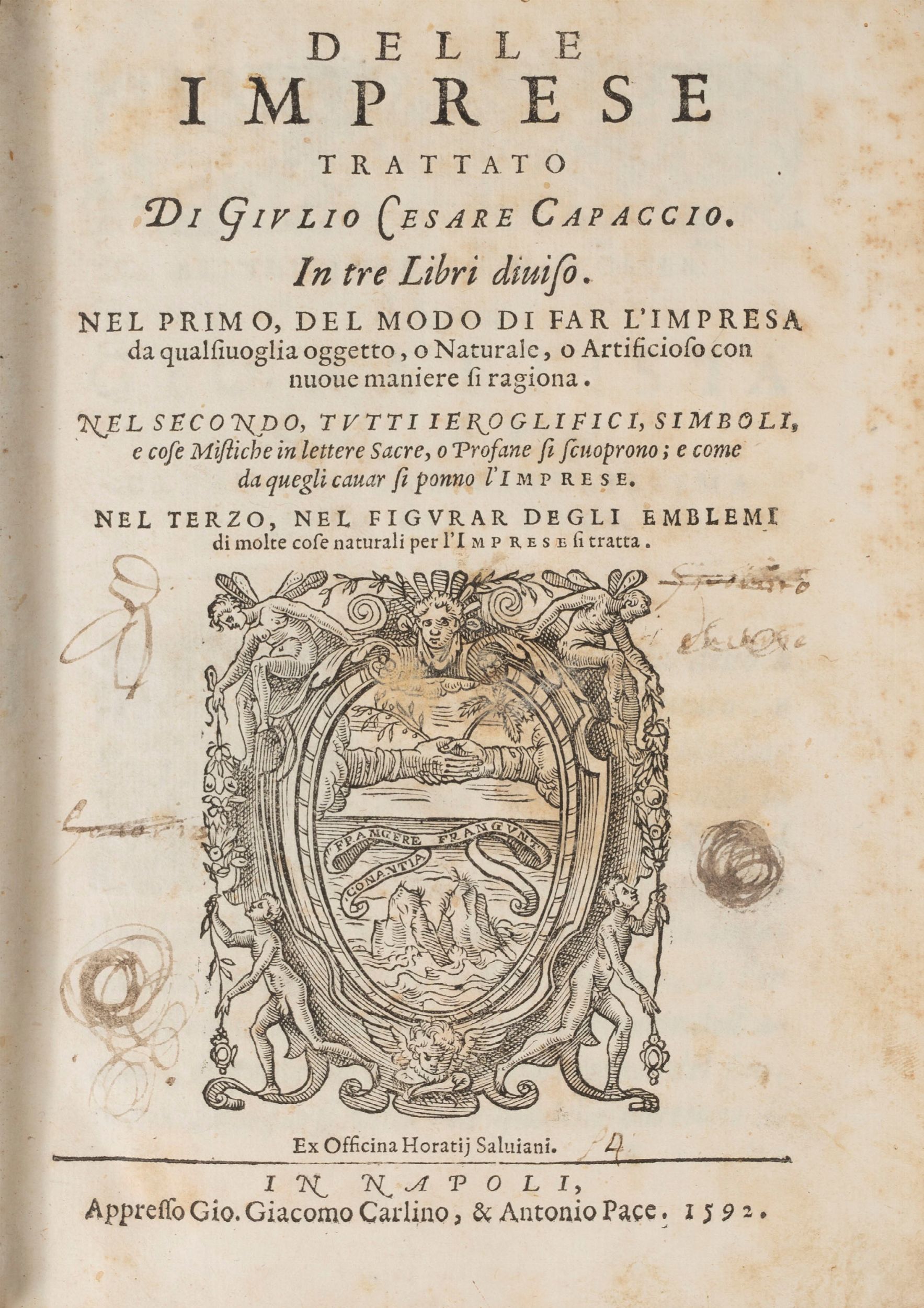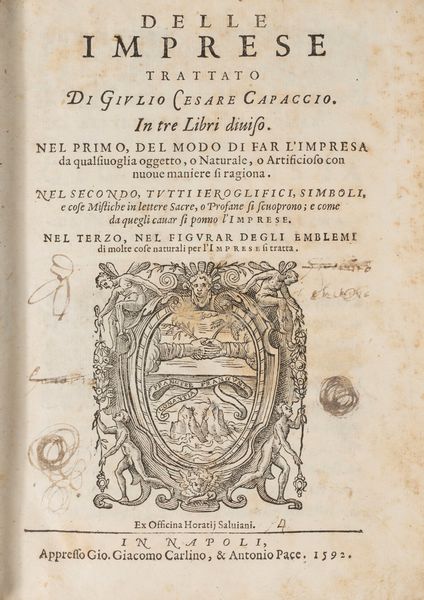1592 In Napoli, Ex Officina Horatji Salviani, Appresso Gio. Giacomo Carlino, & Antonio Pace, 1592. 4°, grande marca tipografica al frontespizio, 32 cc. nn. - 84 - 148 - 60 cc. num., con 300 illustrazioni incise su rame n.t. Lievi fioriture. Legatura coeva in pergamena molle. Ex libris al frontespizio. L'opera, dedicata al letterato Giovan Battista Crispo, è divisa in tre parti: Nella prima parte si tratta di come far l'impresa, nella seconda dei geroglifici, simboli e cose mistiche, nella terza di figurar degli emblemi di molte cose naturali. Cfr. Cicognara: Sono in questo volume 300 piccole tavole intagliate in legno con molto buon garbo e le illustrazioni esauriscono la materia con ordine e chiarezza”. Manzi, Annali di Orazio Salviani 166: uno dei libri più belli del Salviani.