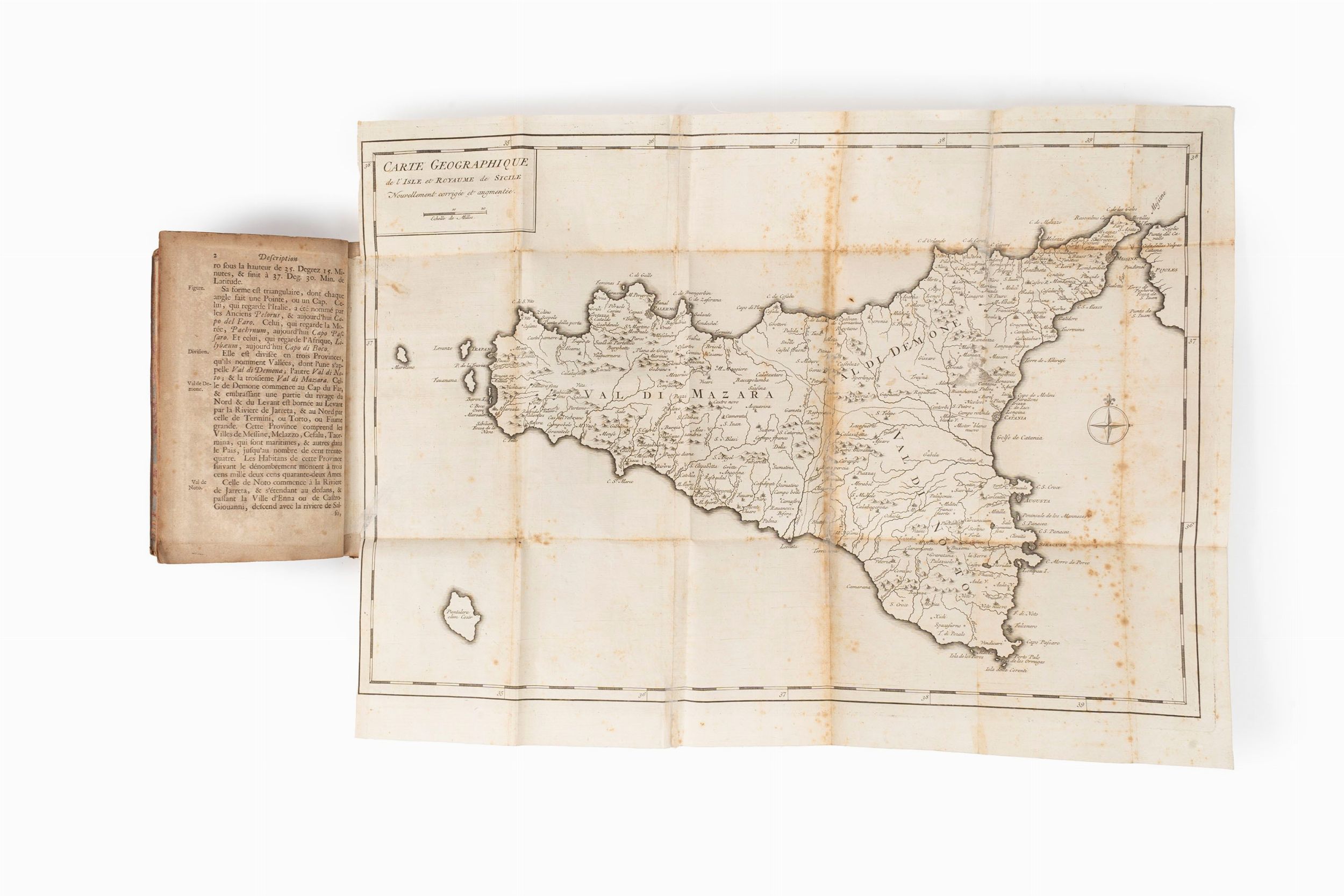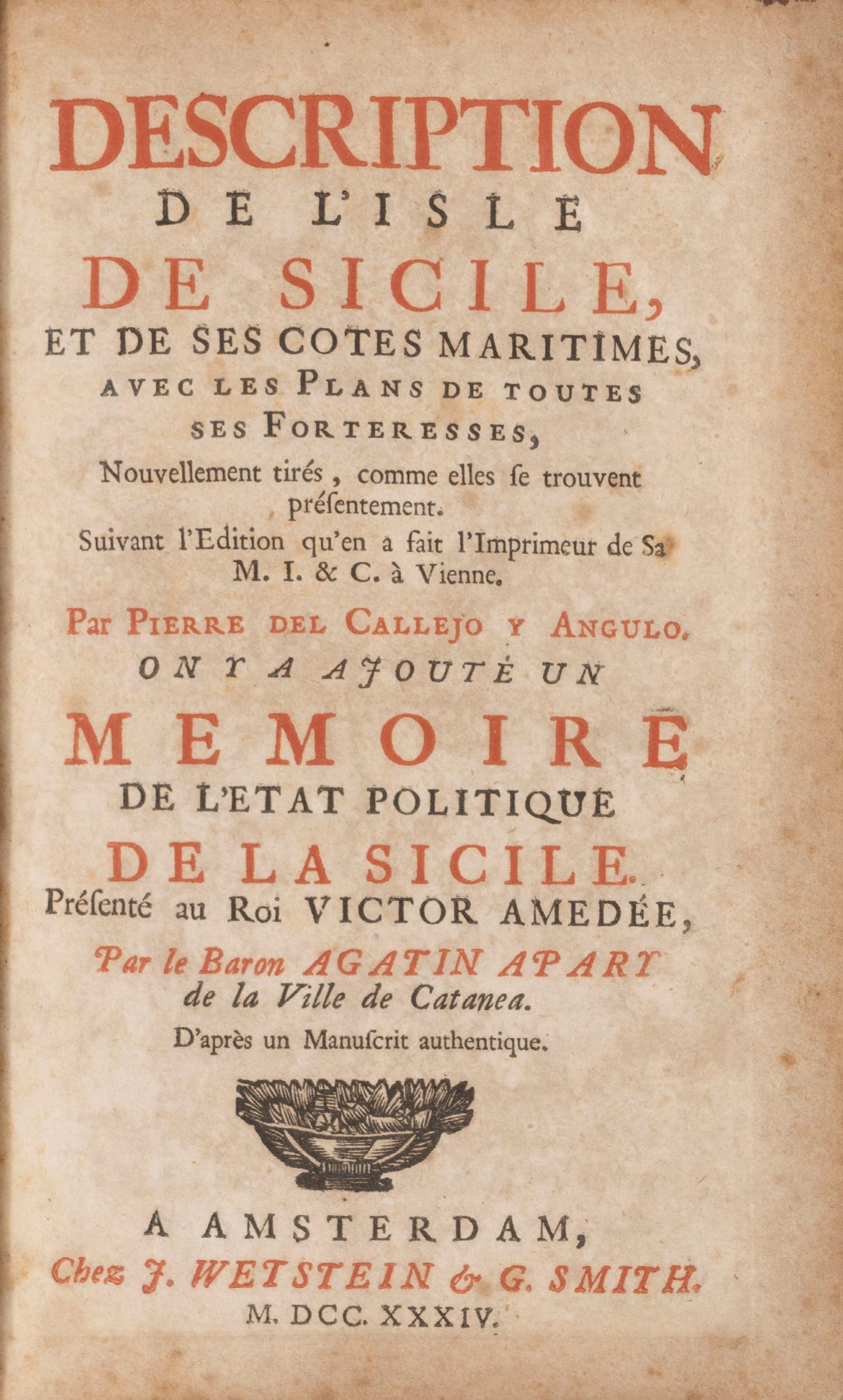 1734 A Amsterdam, chez J. Wetstein & G. Smith, 1734. 8vo (cm. 19,4), 2 cc. nn., 86 pp. con due grandi carte della Sicilia e 15 piante topografiche, per lo più ripiegate, delle città siciliane. Il tutto inciso su rame. Leggera brunitura, alcuni restauri. Legatura coeva in piena pelle (stanca) dorso a sei cordoni con titolo e decorazioni in oro, tagli colorati.