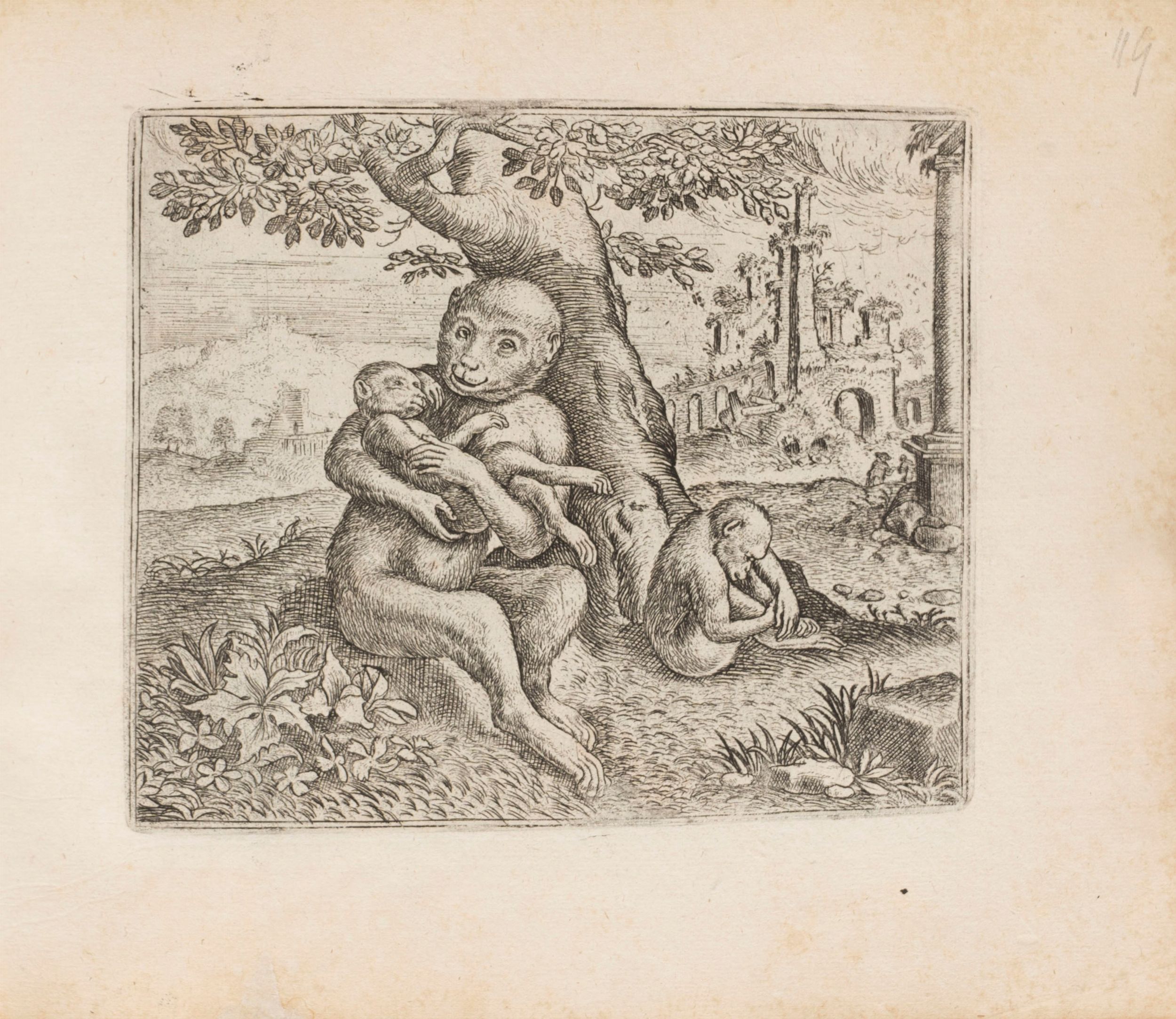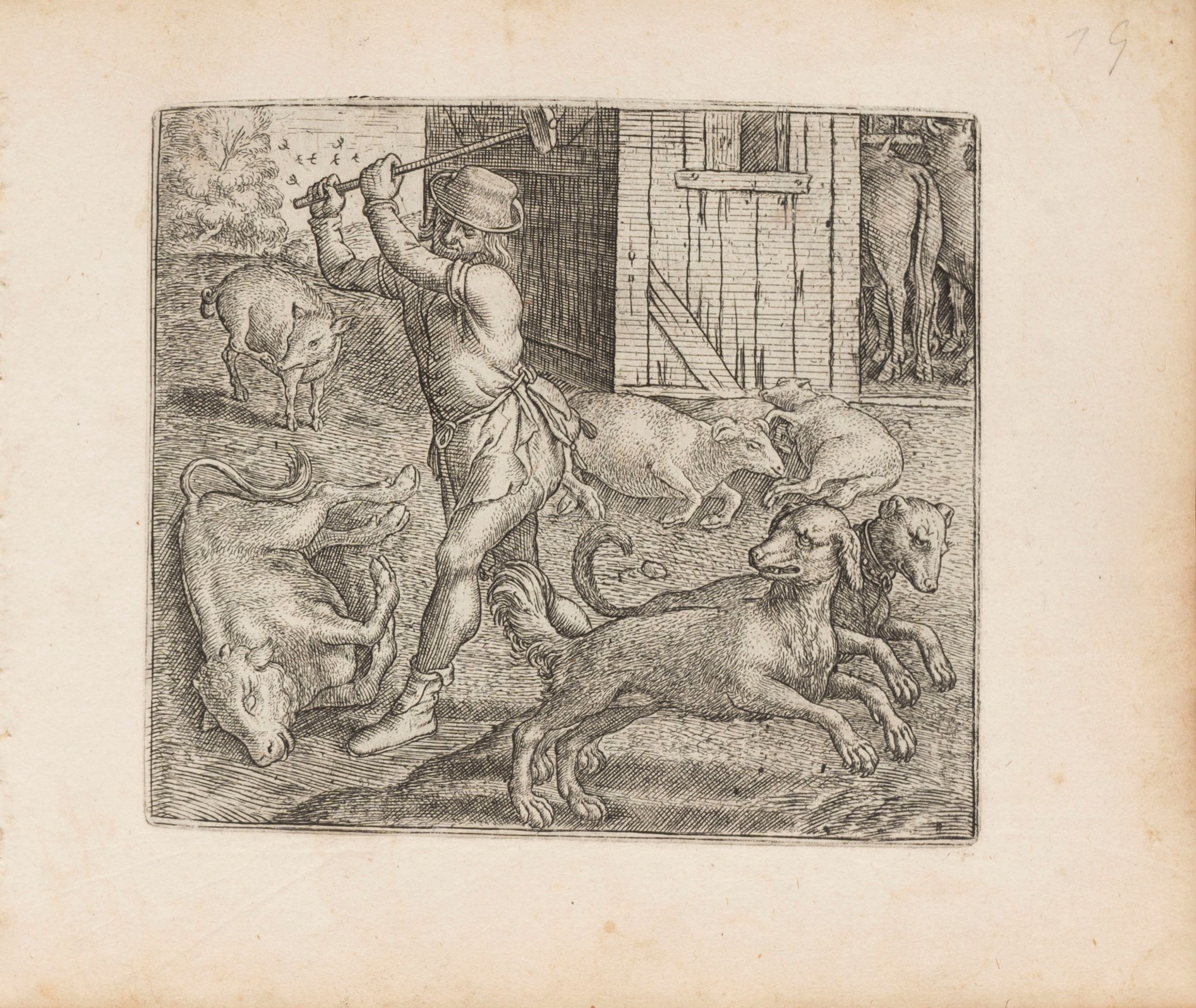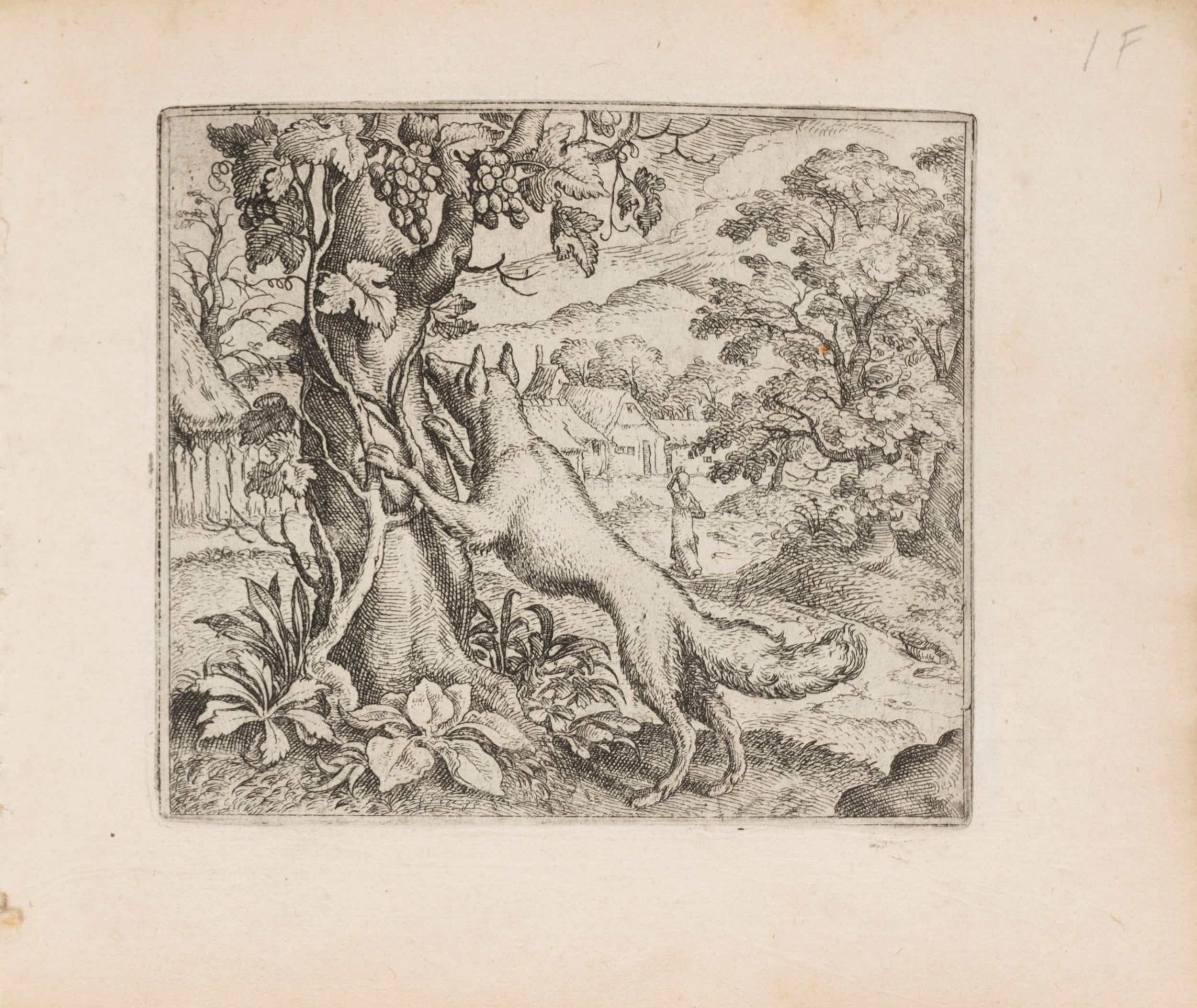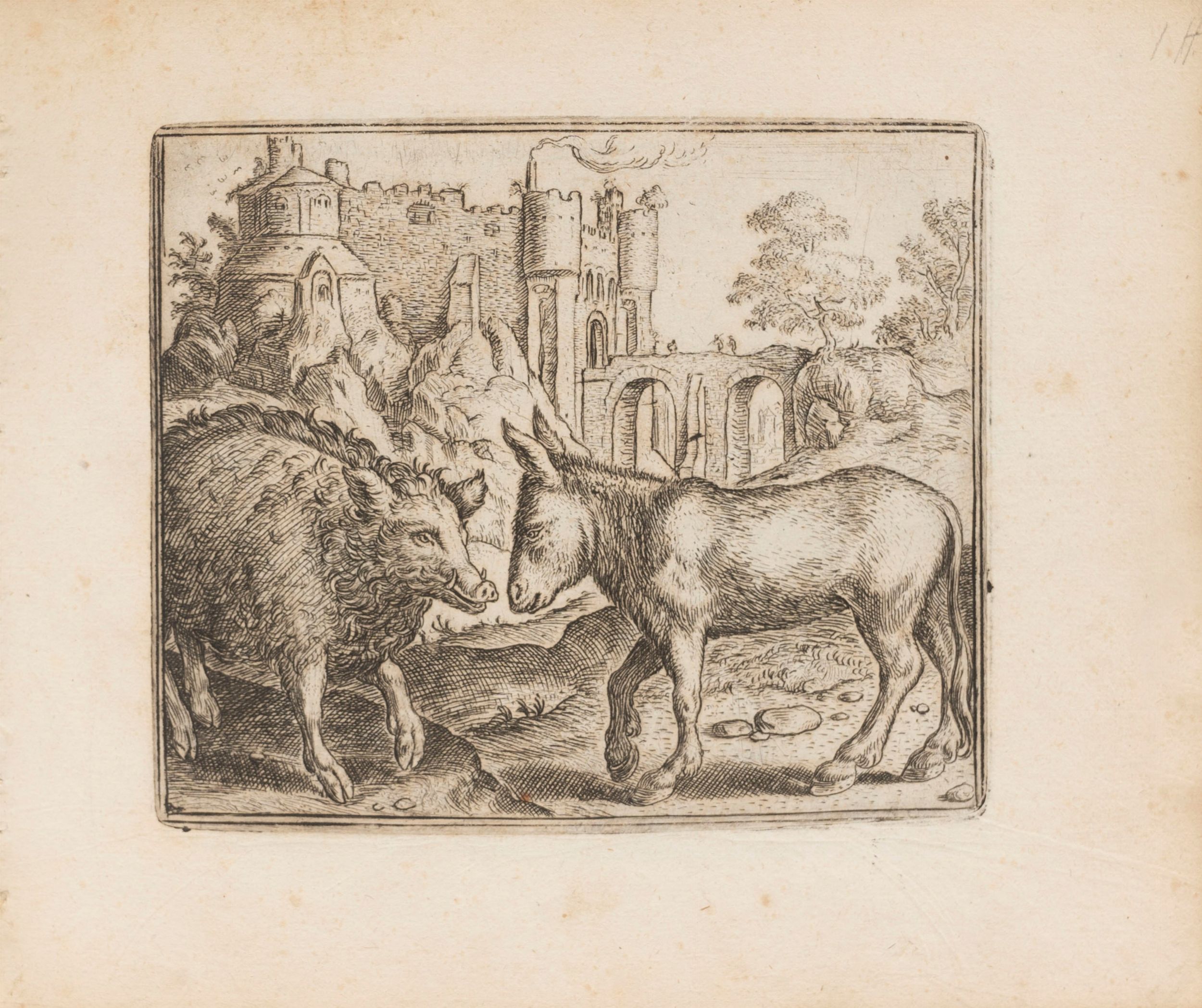 1578 Antwerp, Gerard Smits for Philippe Galle, 1578 [dopo il 20 settembre]. In 4° oblungo, 148 x 176 mm. Frontespizio inciso con animali in 8 piccoli tondi, pannello centrale raffigurante un parlamento di animali su un palcoscenico di fronte a un pubblico di uomini e donne, 122 (su 125) tavole emblematiche finemente incise misura media 112 x 94 mm. opera di Marcus Gheeraerts il vecchio, il volume contiene SOLO LE TAVOLE senza i testi, lievi fioriture marginali, legatura coeva in pergamena floscia con titolo al dorso Fables d'Esope [inesatto].