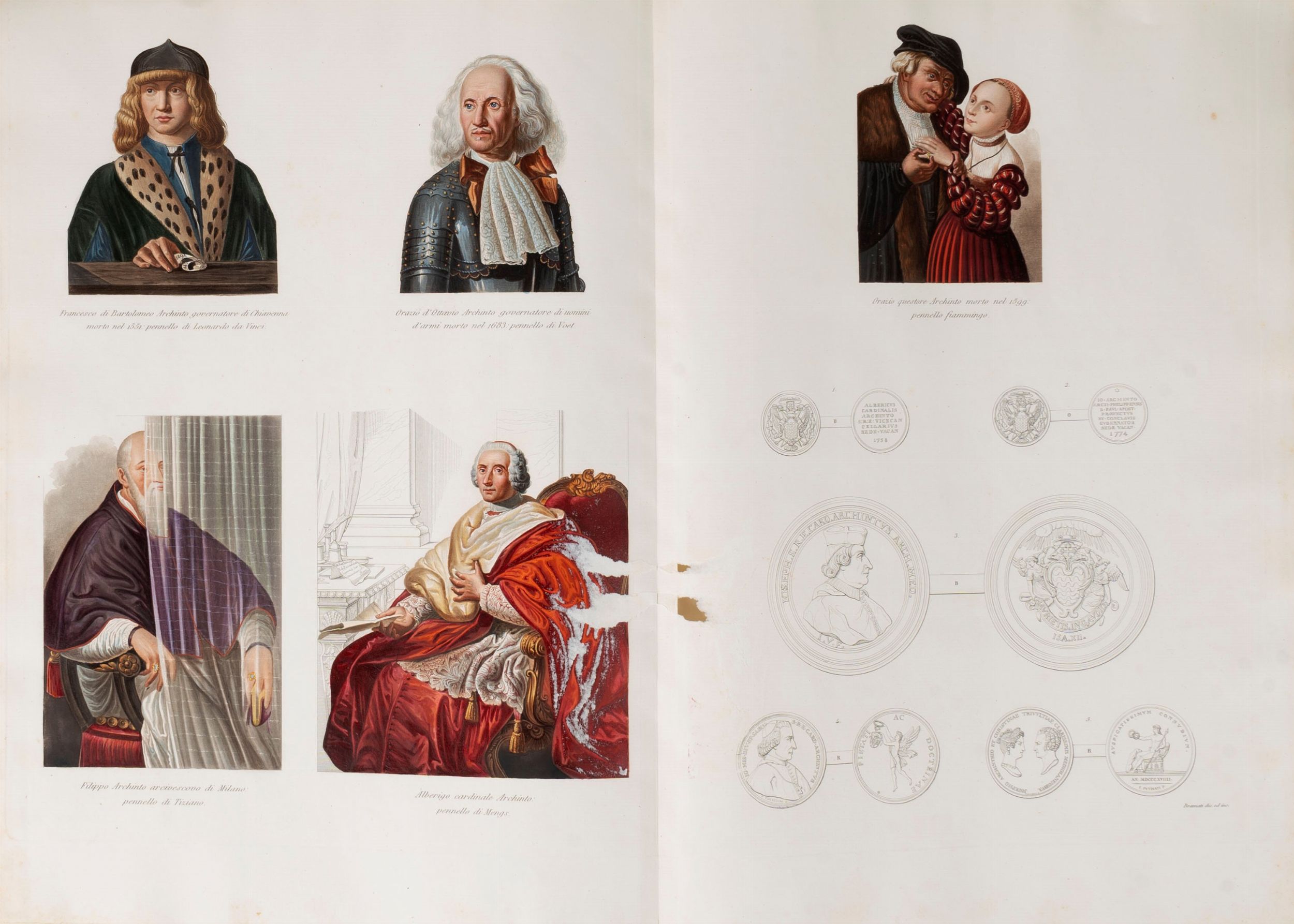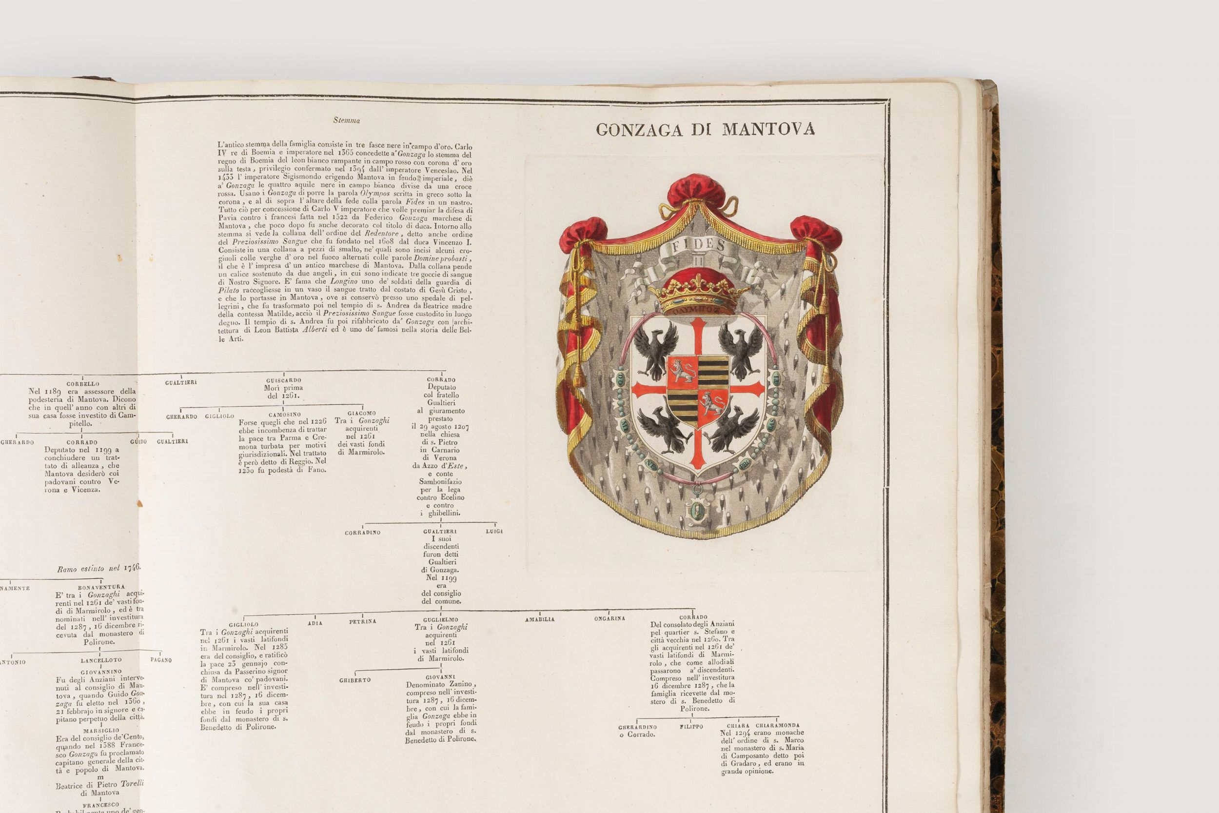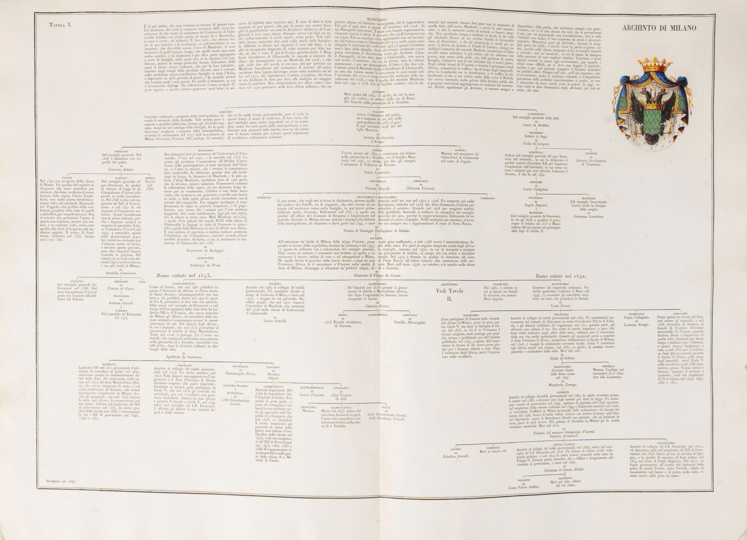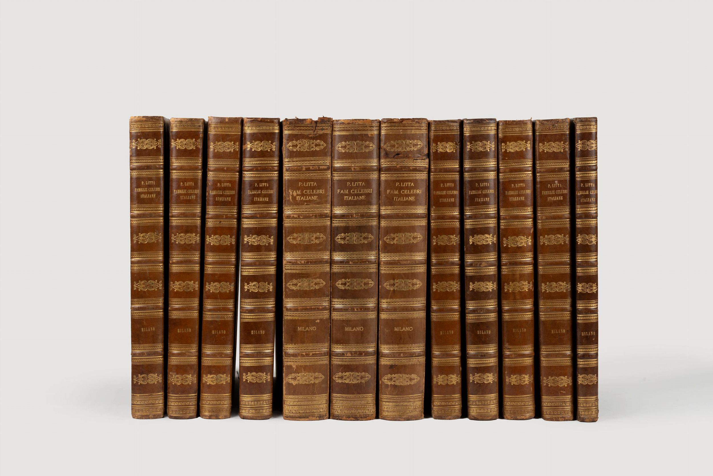 1819 Famiglie celebri di Italia. Milano, Paolo Emilio Giusti, Torino, Luciano Basadonna e Giulio Ferrario, 1819-[1885]. In 2°. (340 x 450 mm). In 12 volumi. Stemmi incisi in rame e colorati da mano coeva, numerose incisioni in rame a piena pagina e nel testo, di cui molte colorate, vedute di città, paesaggi, monumenti, monete e medaglia, carte geografiche incise all'acquaforte e all'acquatinta(lievi bruniture su poche carte, sporadiche macchie e fioriture, qualche piccolo difetto, 2 carte aggiunte da altra edizione). Legatura coeva in mezza pelle, fregi in oro sul dorso.
