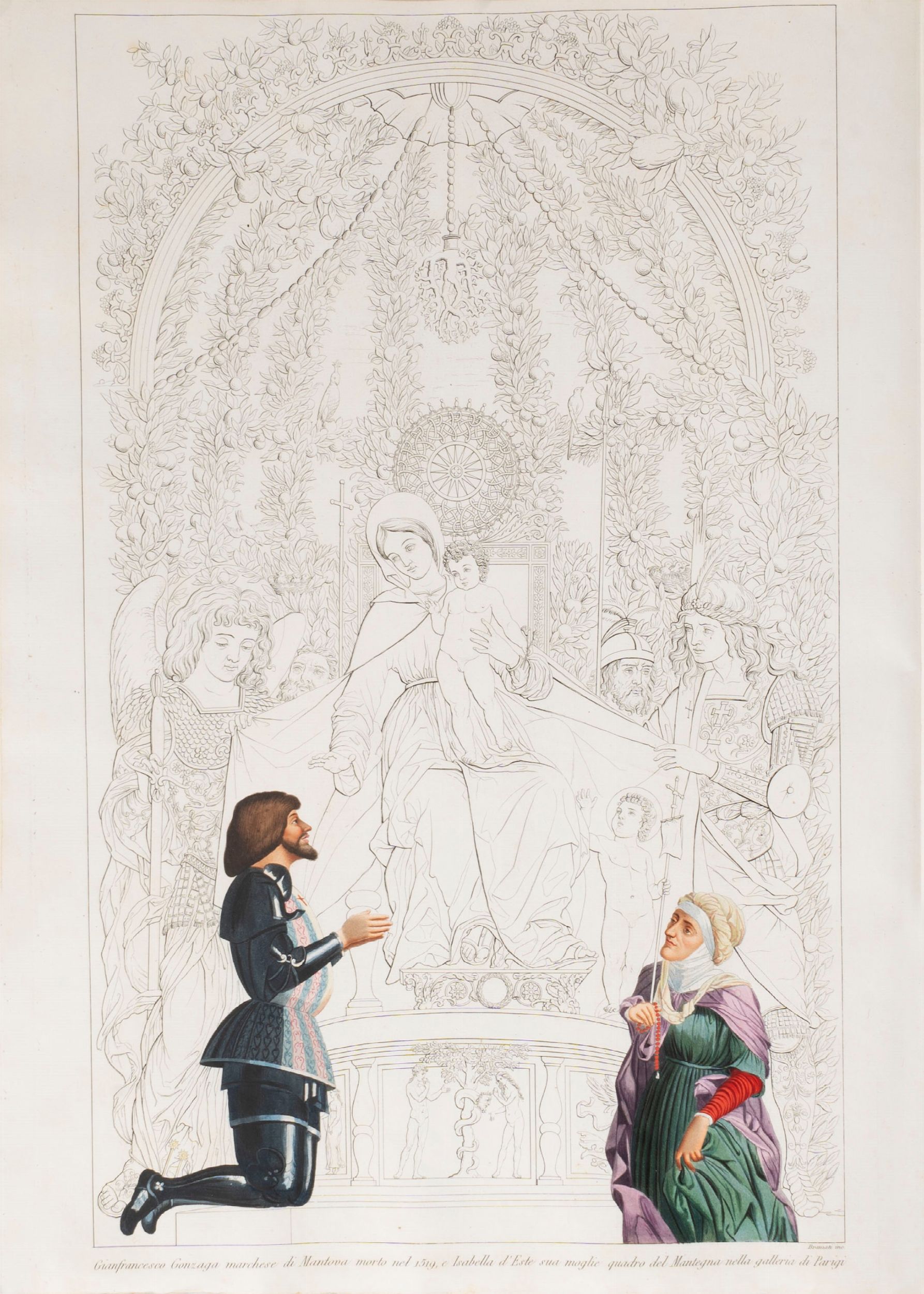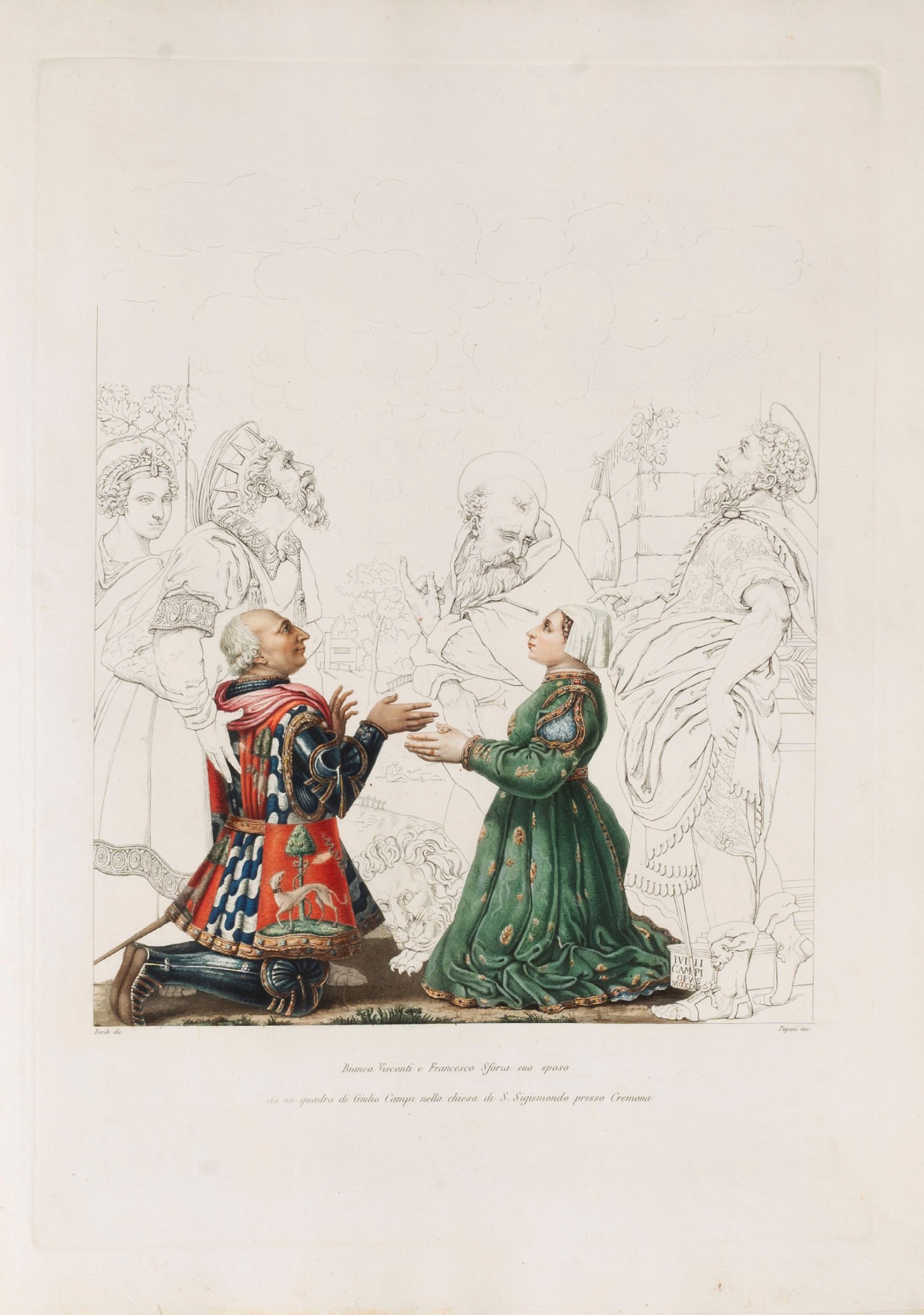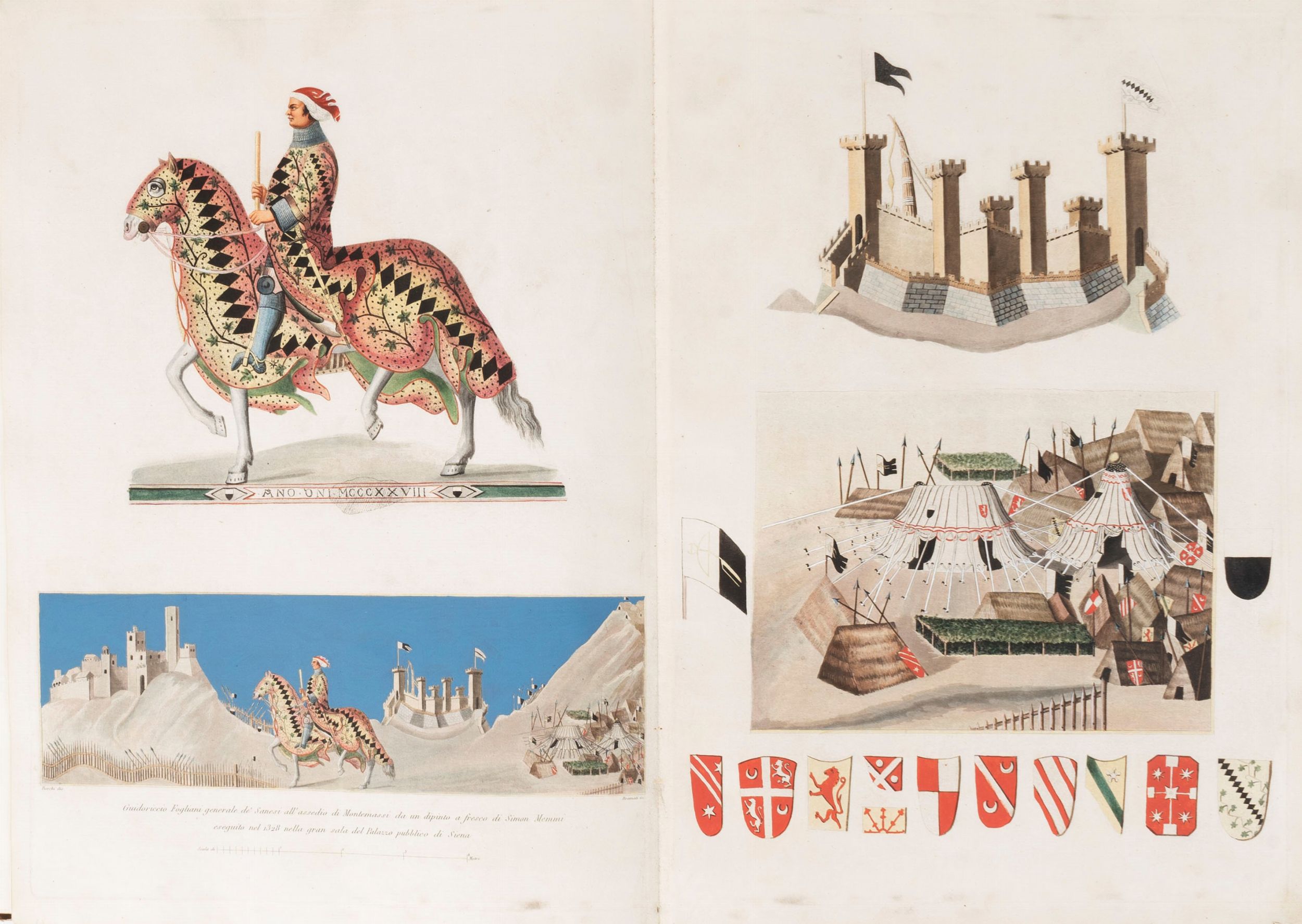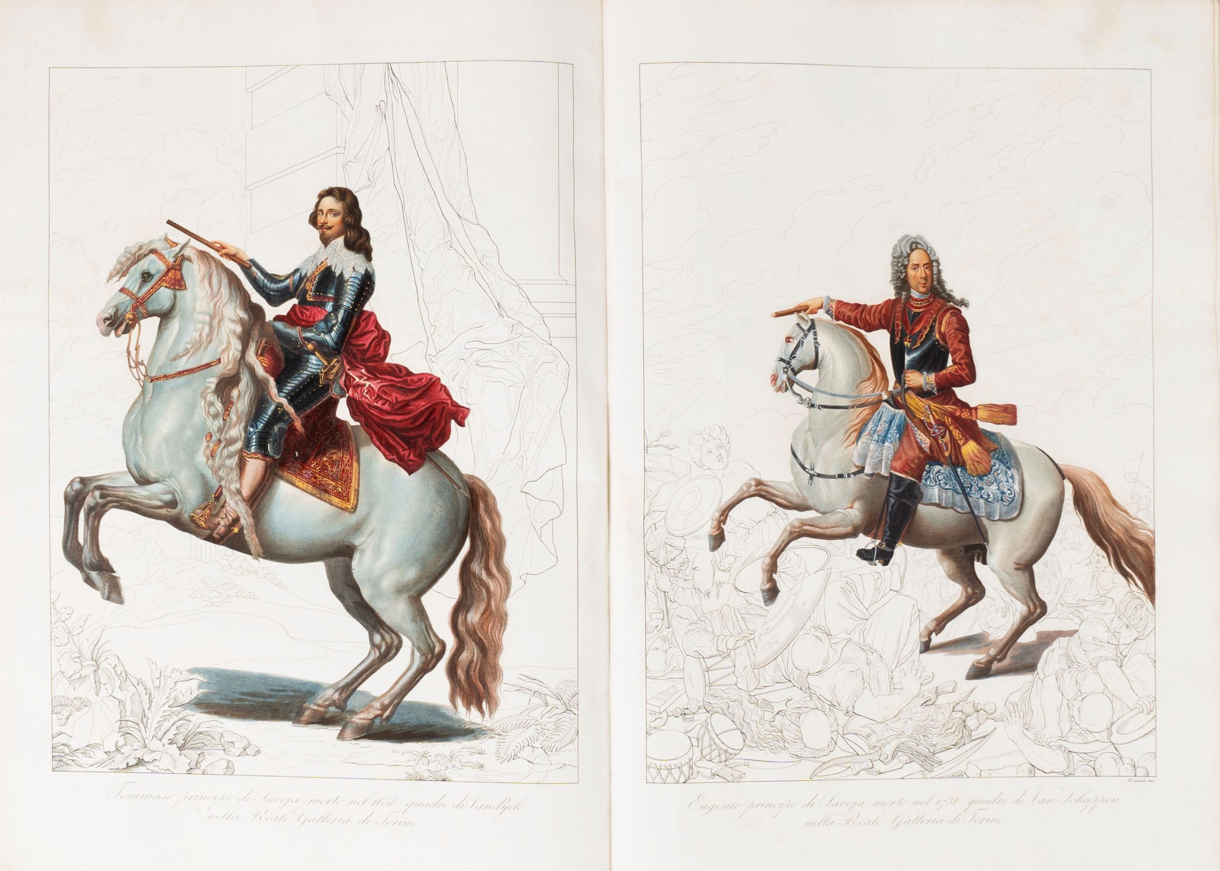 1819 Famiglie celebri di Italia. Milano, Paolo Emilio Giusti, Torino, Luciano Basadonna e Giulio Ferrario, 1819-[1885]. In 2°. (340 x 450 mm). In 12 volumi. Stemmi incisi in rame e colorati da mano coeva, numerose incisioni in rame a piena pagina e nel testo, di cui molte colorate, vedute di città, paesaggi, monumenti, monete e medaglia, carte geografiche incise all'acquaforte e all'acquatinta(lievi bruniture su poche carte, sporadiche macchie e fioriture, qualche piccolo difetto, 2 carte aggiunte da altra edizione). Legatura coeva in mezza pelle, fregi in oro sul dorso.
