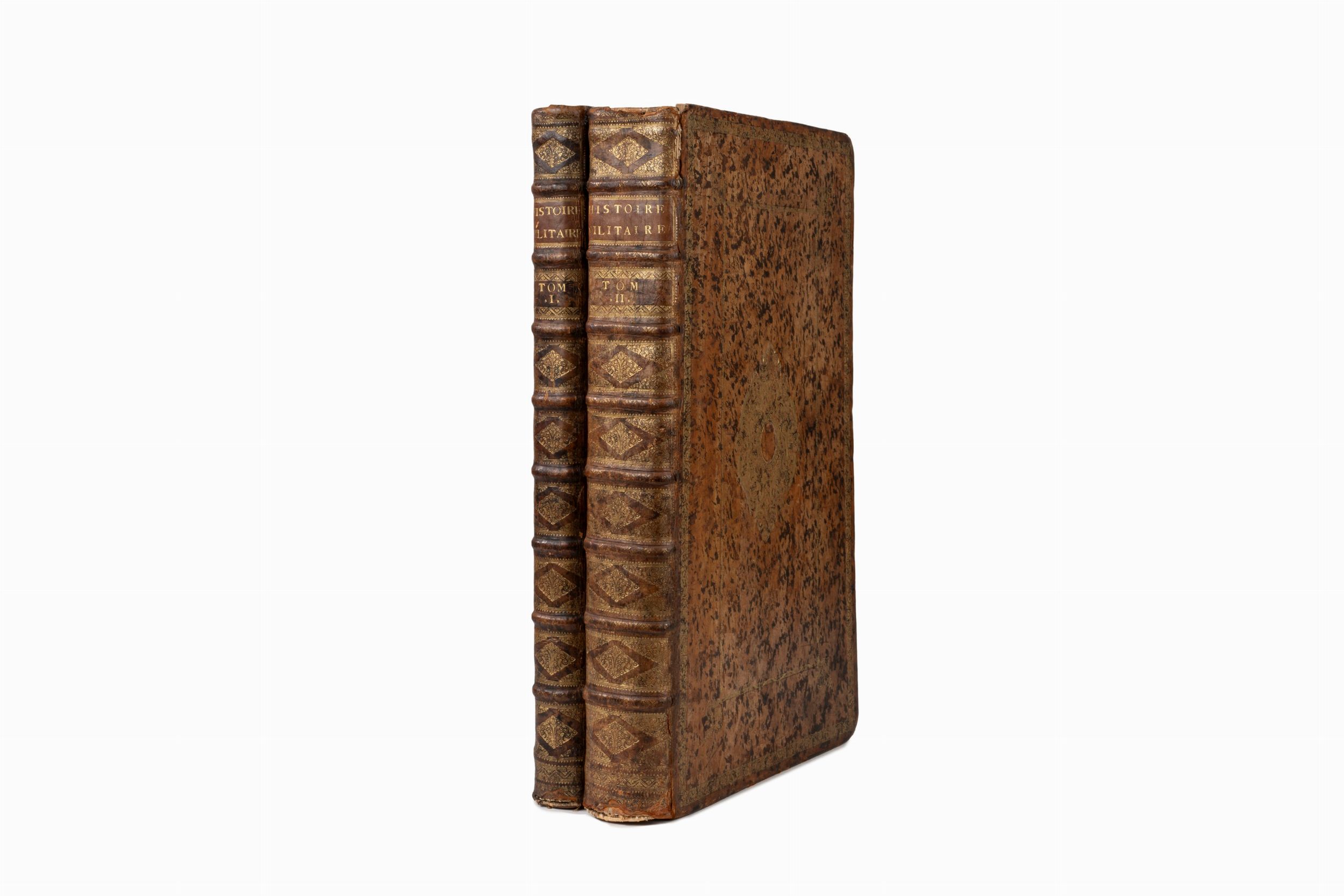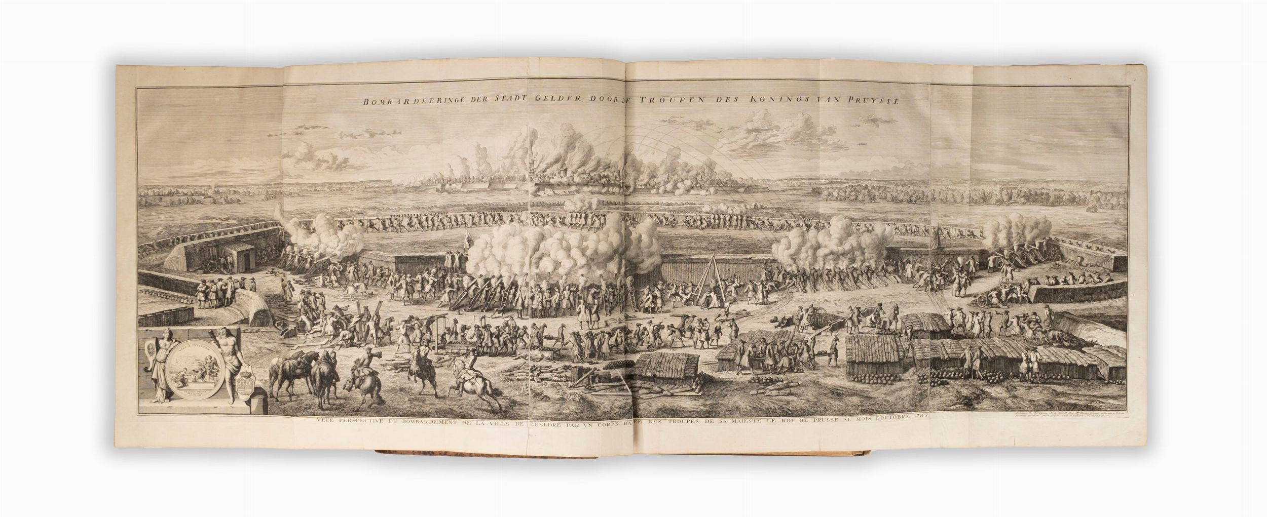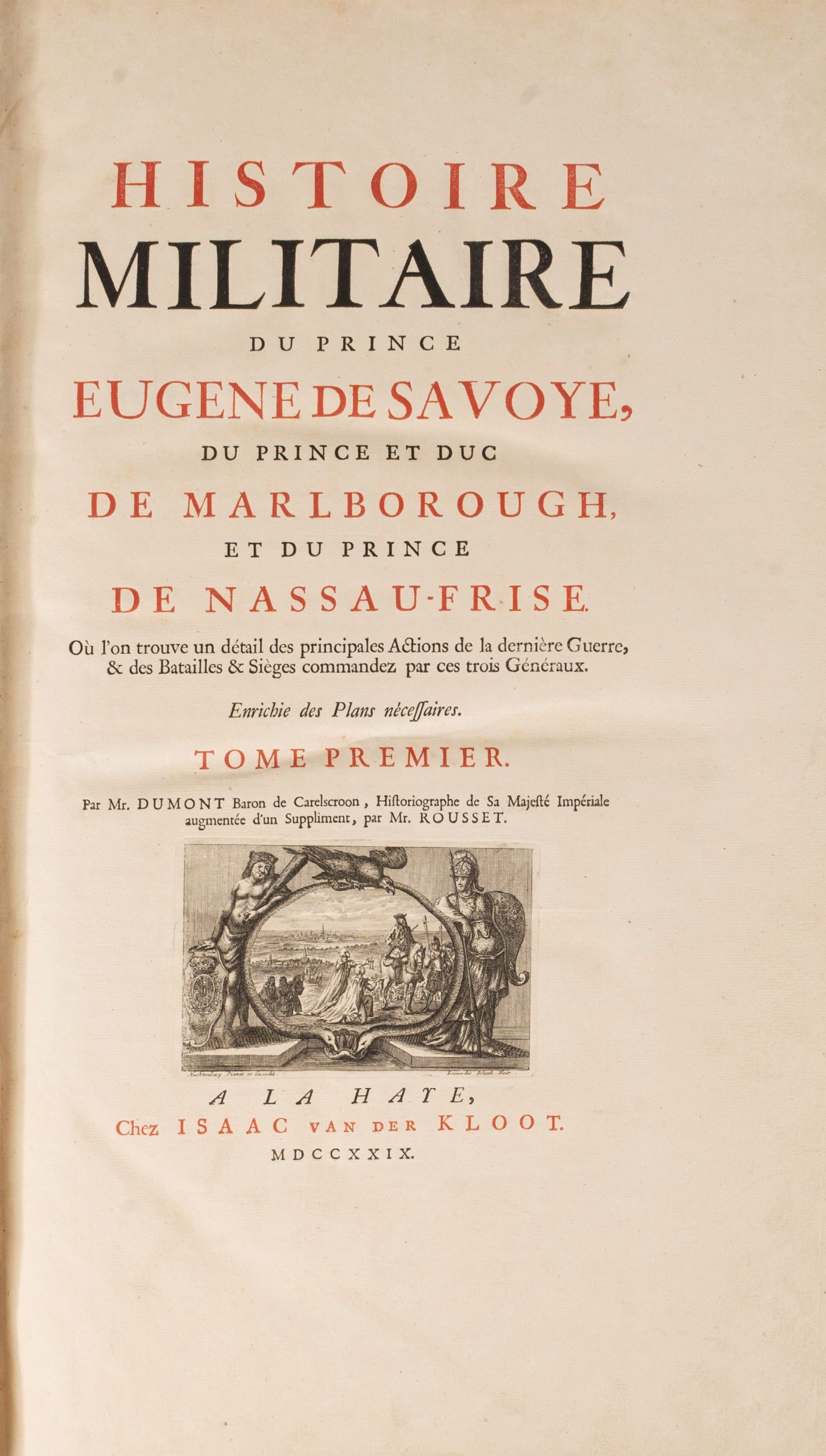 1729 The Hague [L'Aja], Isaac van der Kloot, 1729. In 2°. 2 voll. 530 x 320 mm. Frontespizio a vignetta per ogni volume stampato in rosso e nero, ritratto allegorico inciso a doppia pagina di Eugenio, principe di Savoia, un grande panorama inciso ripiegabile su 3 fogli del bombardamento di Geldern, 9 carte geografiche ripiegabili a doppia pagina su 2 fogli, 73 carte geografiche, piante e vedute di scene di battaglia a doppia pagina, di cui 12 di Jan Huchtenburgh e una a piena pagina, per un totale di 86 tavole, 10 vignette incise di piani di battaglia, 10 iniziali istoriate incise, qualche raro strappo alla piegatura interna delle carte molto grandi senza comunque perdita di testo, lievissime fioriture altrimenti esemplare immacolato, splendida legatura in vitello spugnato con raffinate decorazioni in oro ai piatti e al dorso, difetti alle cuffie.