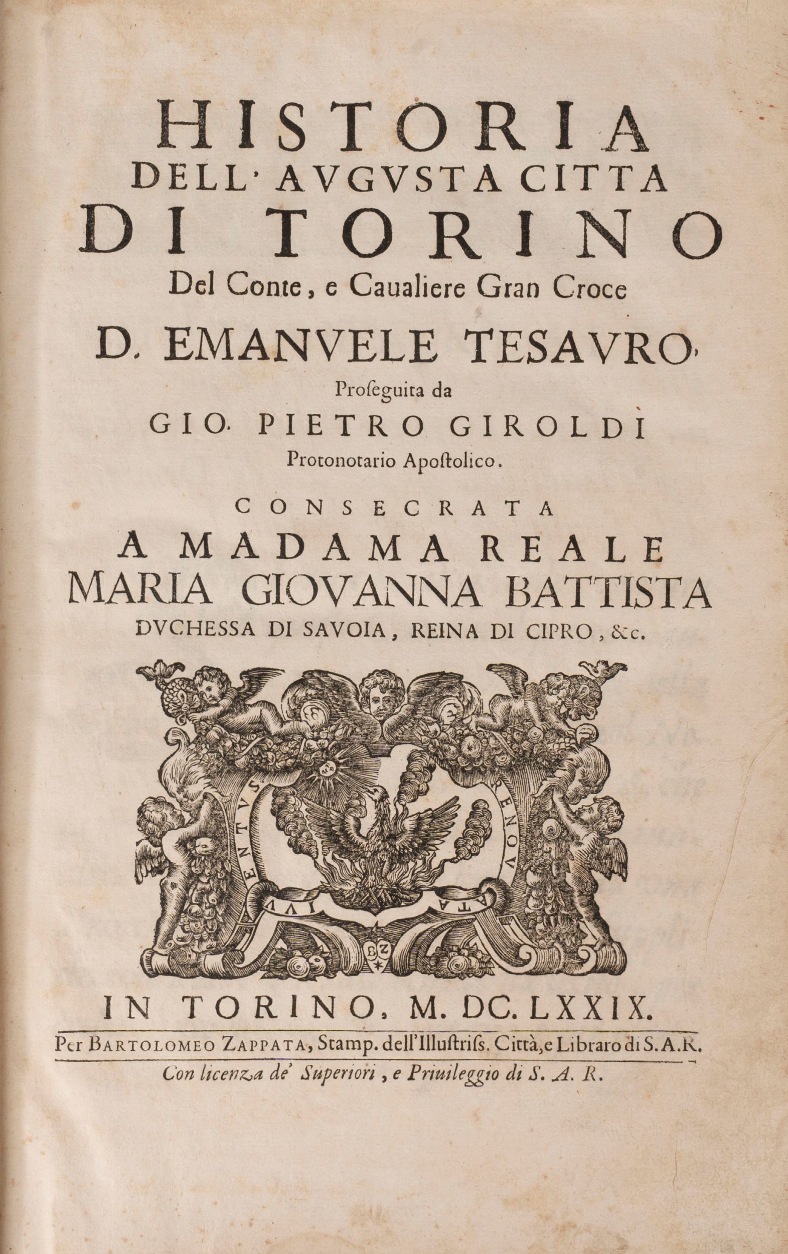 1679 Antiporte con figure allegoriche incise in rame da Tasniere su disegno di Piola su entrambi i volumi, marca tipografica incisa su legno ai frontespizi, e ripetuta in fine a volume I, capilettera e fregi xilografici, lievi aloni marginali, qualche fioritura, legatura coeva in vitello marrone , al dorso comparti con titolo e fregi impressi in oro, mancanze e graffi.