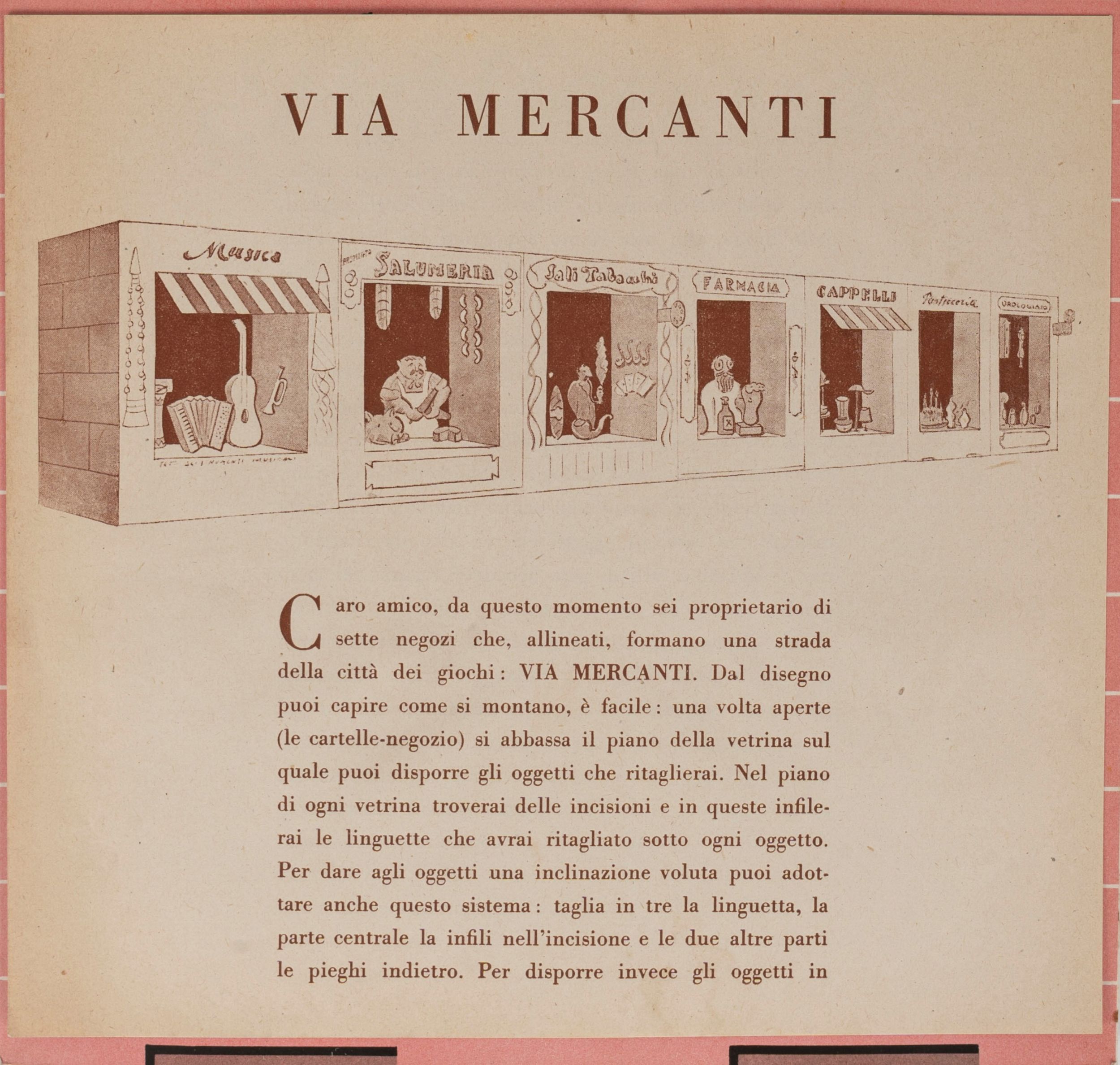 Milano, Casa editrice Gentile, 1940. Composto di 7 cartelline, ciascuna contenente 2 fogli in cartoncino, con elementi di ritaglio, il fronte delle cartelline è fustellato per consentire l'esposizione degli elementi ritagliati in vetrina, conservato il foglio di presentazione dell' editore.