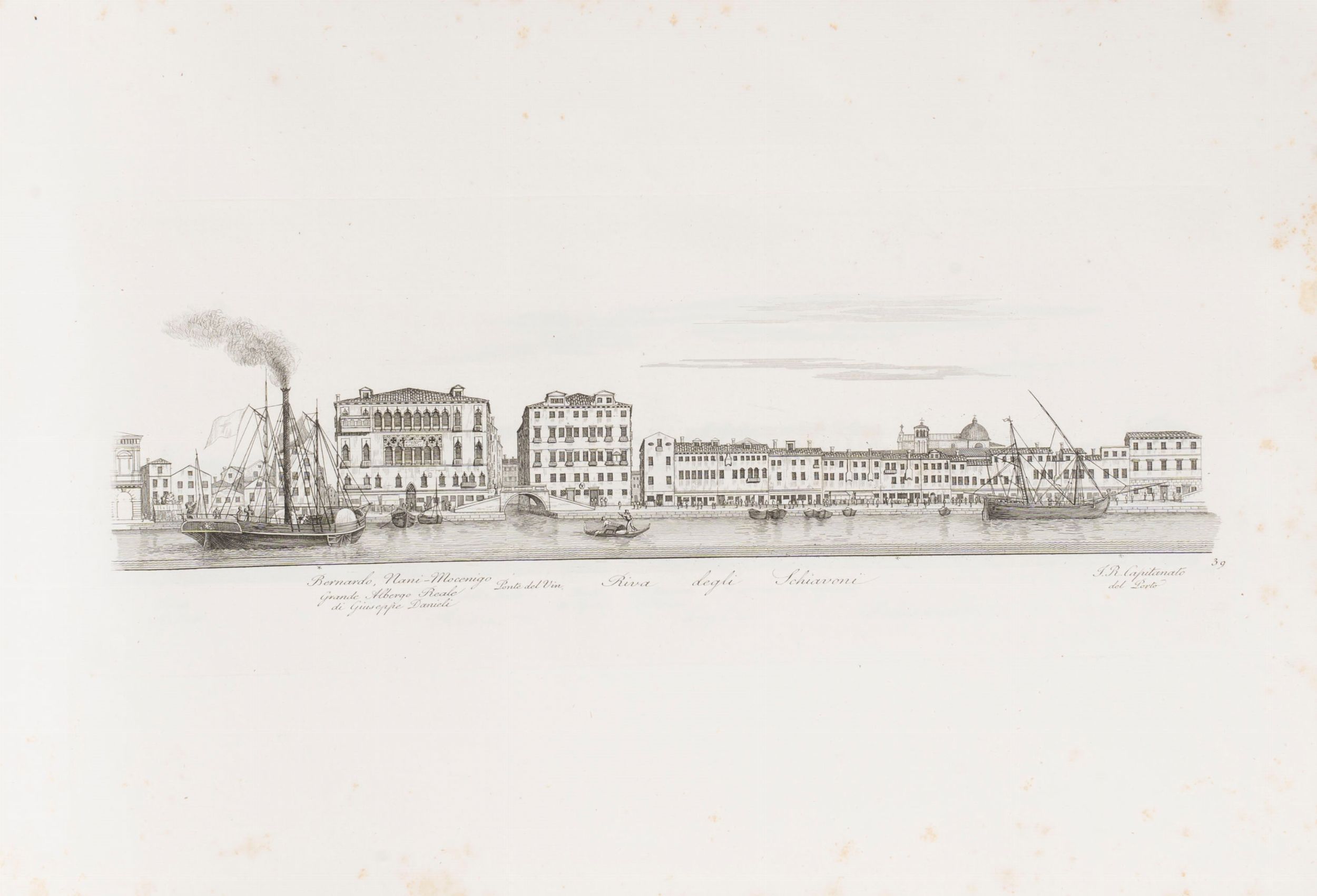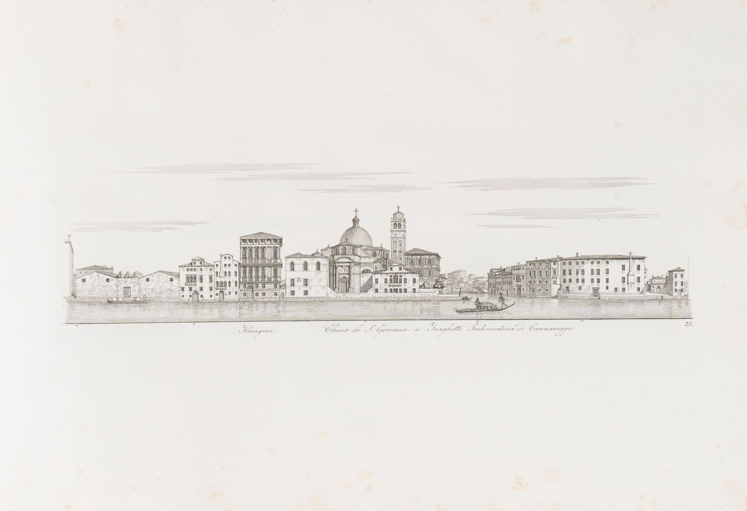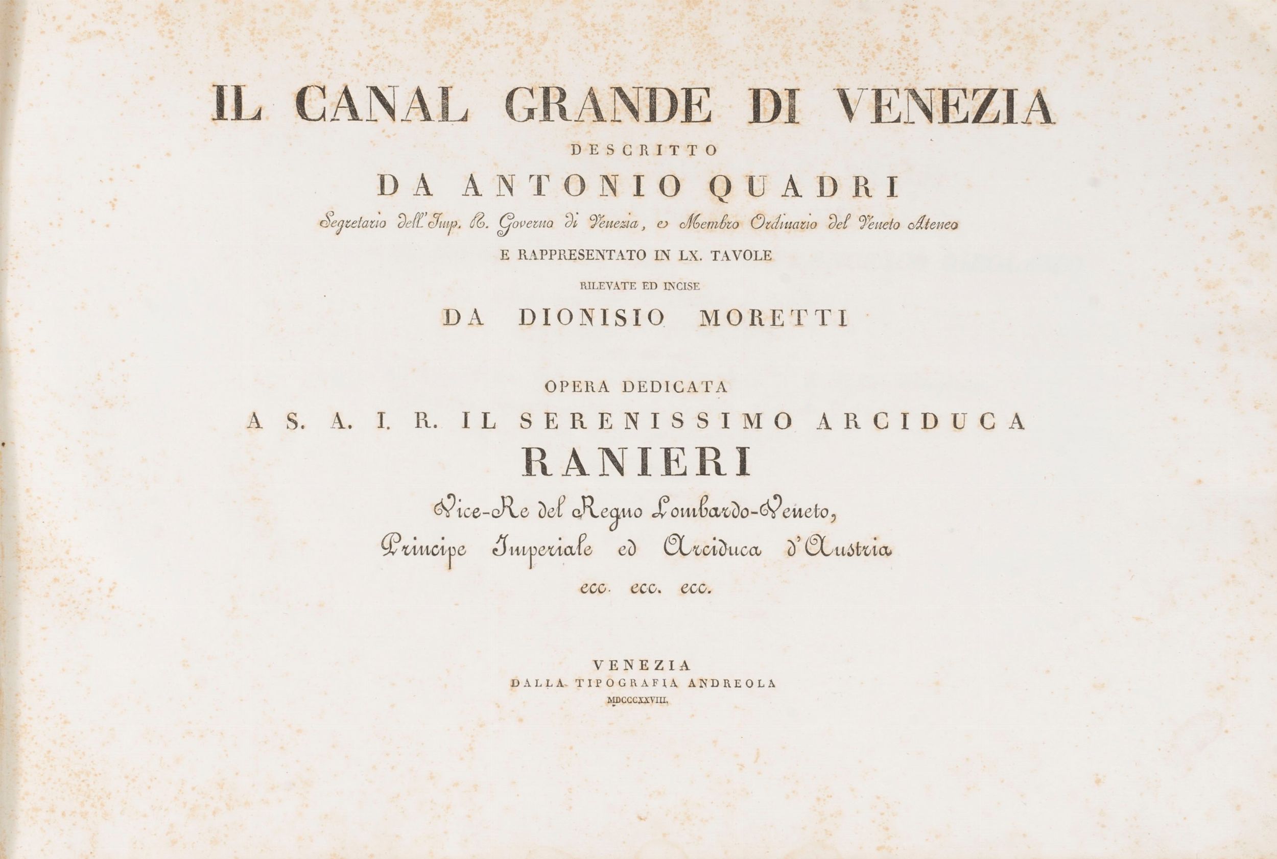 1828 Venezia, Tipografia Andreola, 1828. In 2° oblungo. Frontespizio, dedica all'Arciduca Ranieri, testo descrittivo, tavola con il Corso del Canal Grande, 47 tavole incise in rame numerate che descrivono l'intero panorama del Canal Grande di Venezia, lievi fioriture, piccolo strappo senza perdita al margine superiore bianco della tav. 25, legatura coeva in chagrin verde e marrone, tassello rosso con titolo in oro al piatto anteriore, qualche piccola macchia e spellatura, lievi difetti.