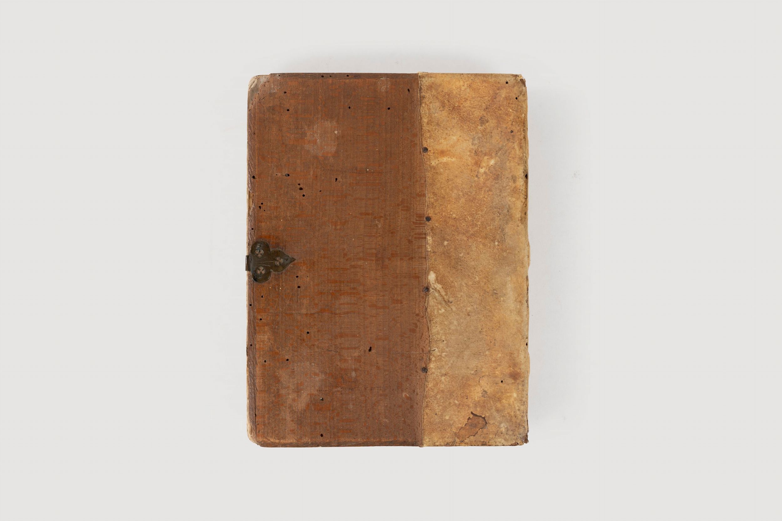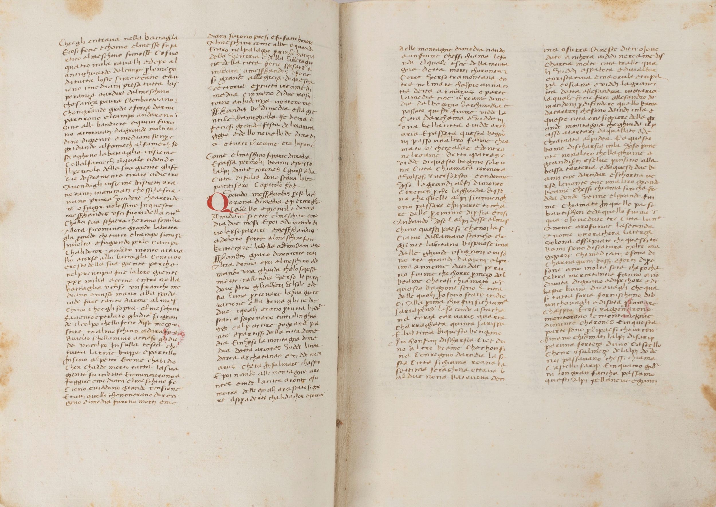 1440 Codice cartaceo di 290 x 221 mm. databile alla prima metà del sec.XV, cc.142 (manca la c.99), numerazione antica, corsiva influenzata da elementi goticheggianti, disposta su due colonne, strutturato in 16 fascicoli, bruniture alle prime carte, marginali aloni, legatura coeva in mezza pergamena e assi di cipresso, mancanze al dorso, tracce di fermagli, entro box moderno in tela grigia con titolo su tassello di pelle rossa.