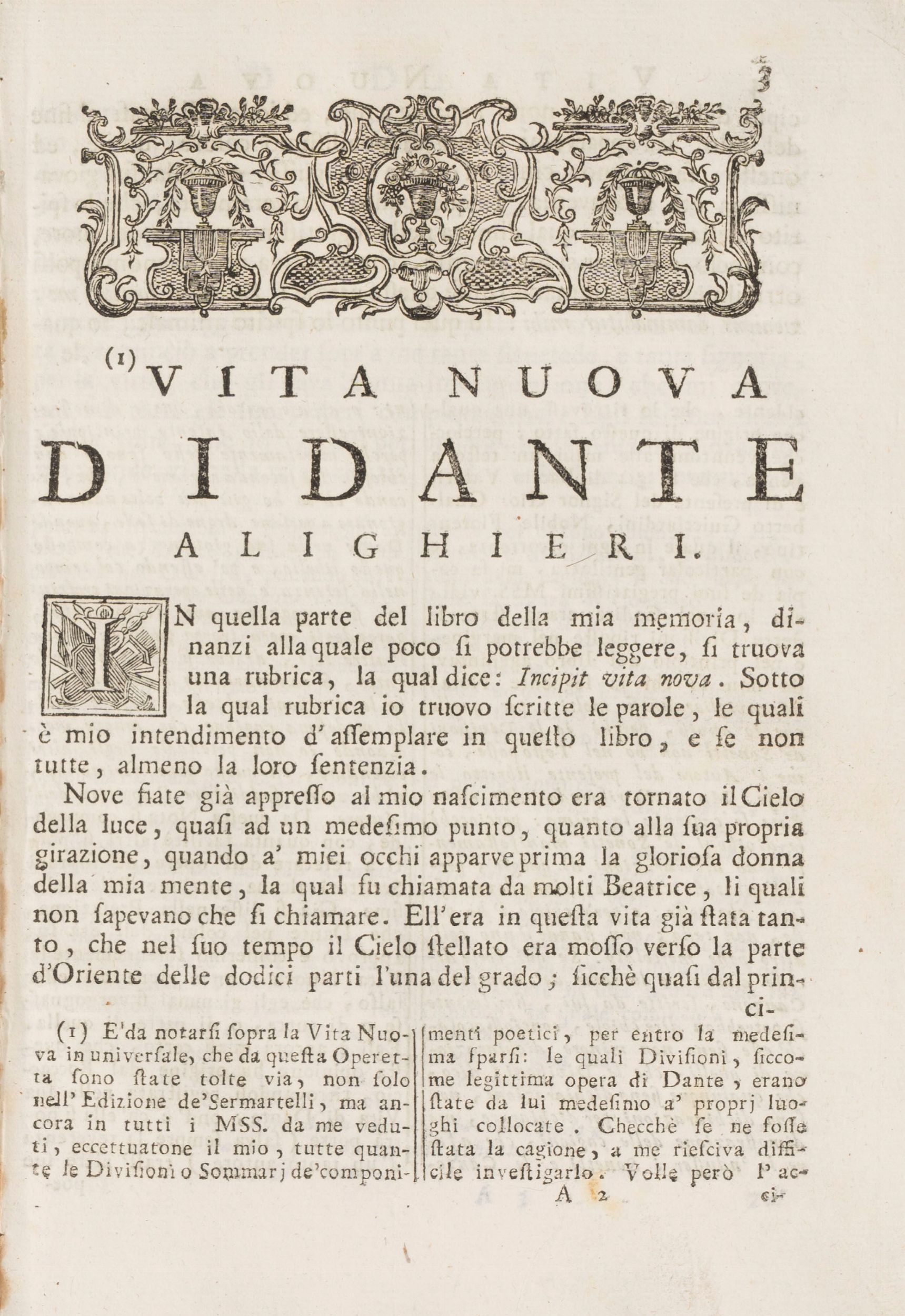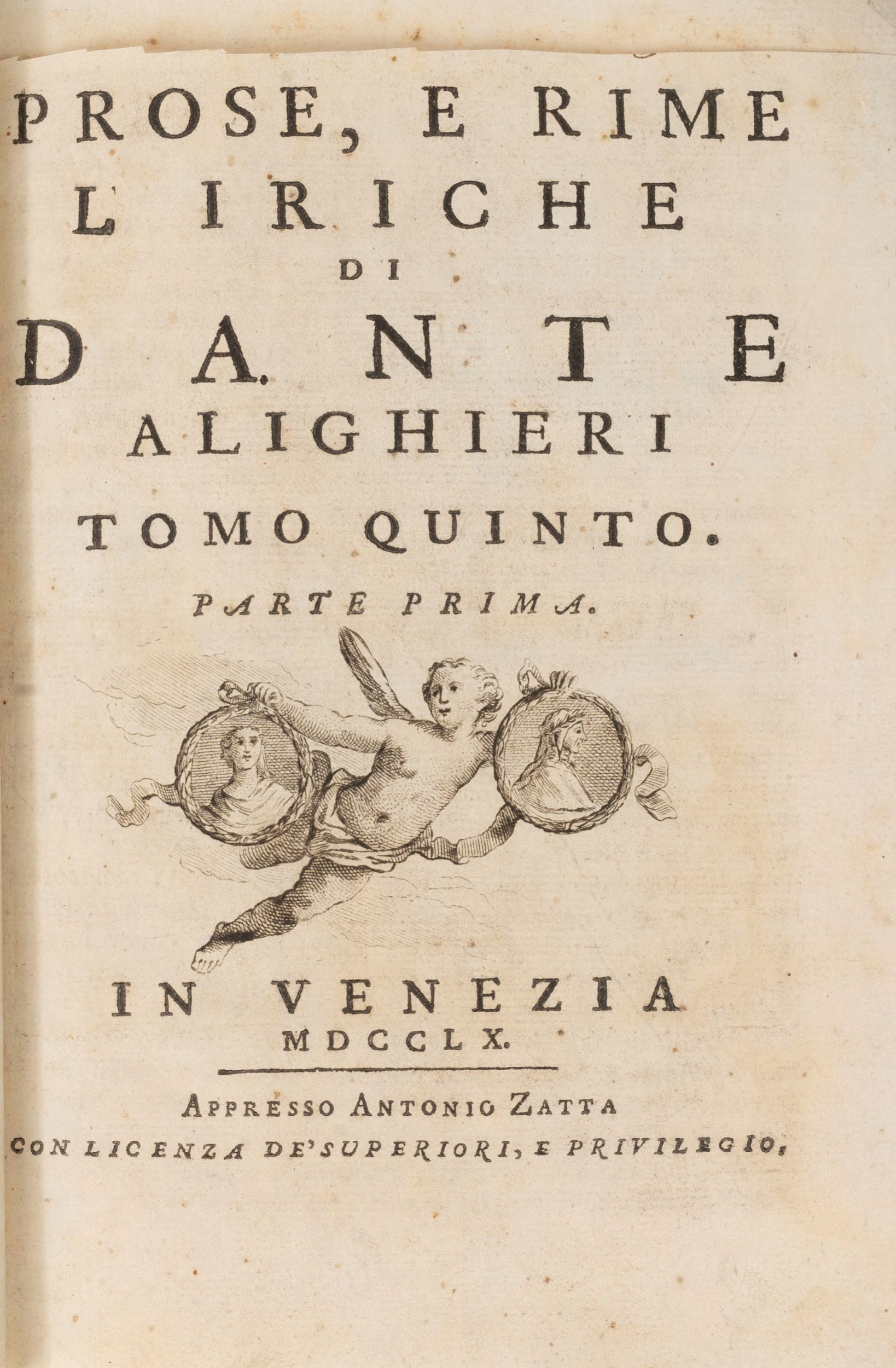 1760 Venezia, Antonio Zatta, 1760. In 8°. 7 parti in 5 voll. Antiporta con ritratto dell'autore inciso in rame e frontespizio in rosso e nero al primo volume, con 2 incisioni in rame, 1 tavola di albero genealogico ripiegata, testatine xilografiche in principio di ciascuna cantica, rare e lievi fioriture, qualche lieve brunitura, legatura coeva in pelle, impressioni in oro ai piatti, titolo entro tassello al dorso, alcune mancanze, difetti.