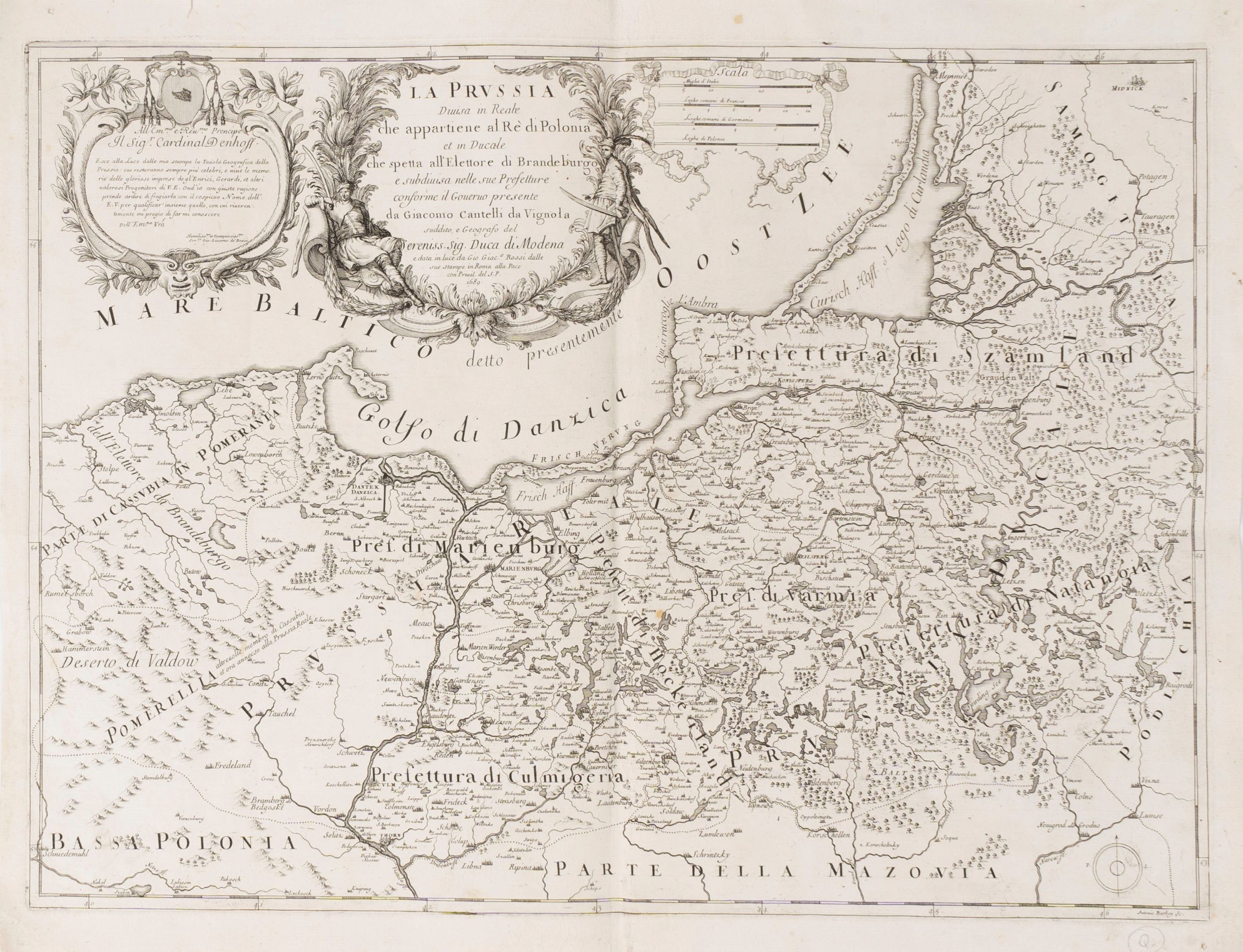 1689 Roma, Gio. Giacomo Rossi, 1689. Incisione su rame tratta da Mercurio Geografico overo Guida Geografica in tutte le parti del Mondo. Misura 57,5 x 43 più margini. La carta è ornata da un artistico cartiglio.