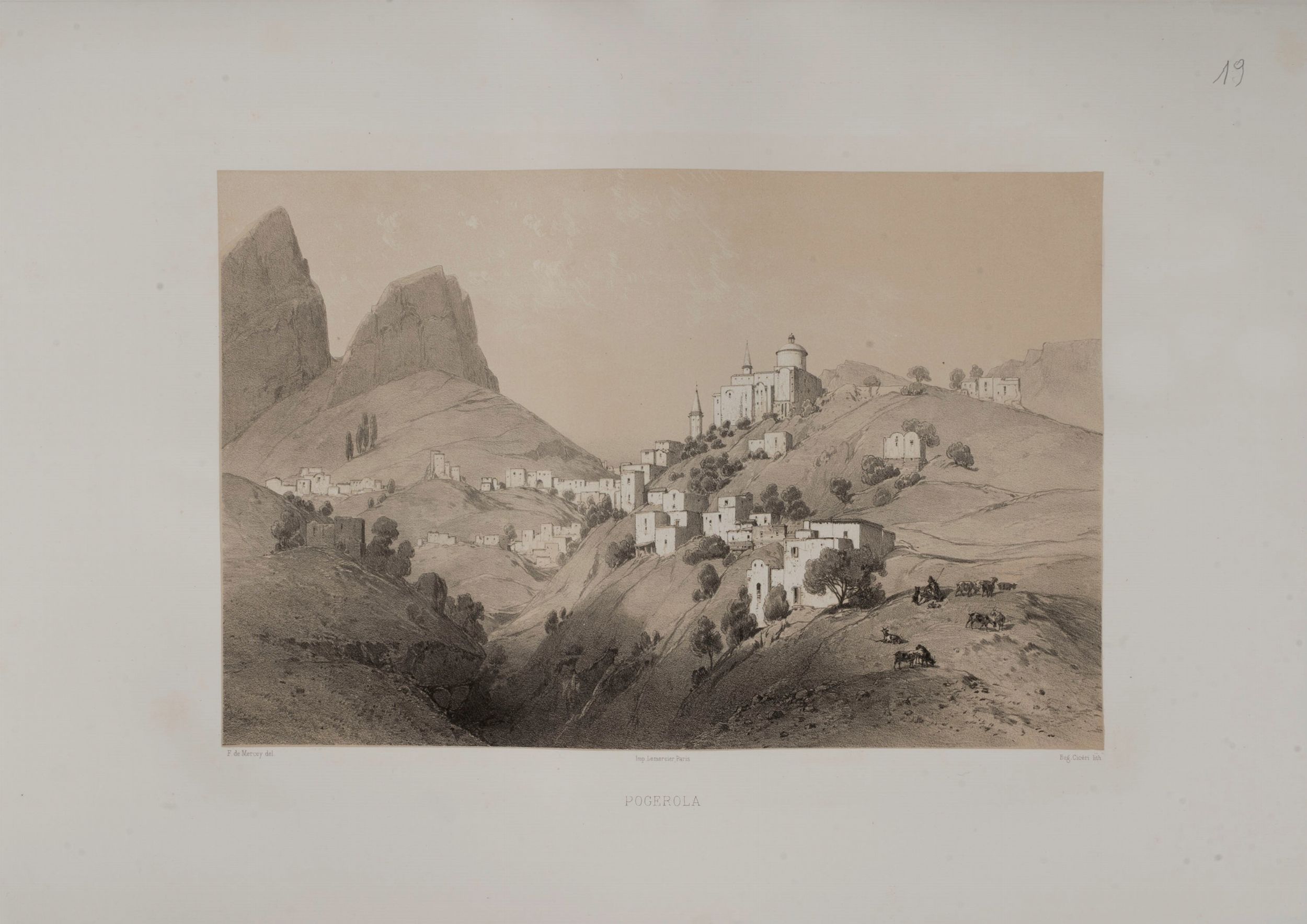 Parigi, “Imprimerie Lemercier”, 1858. In Folio, 24 tavole litografate a due tinte da Eugčne Ciceri su soggetto di F. De Mercey: 1) Murailles de Rome. 2) Lac d'Albano. 3) Nemi. 4) Lariccia (numerata). 5) Environs de Lariccia. 6) Spolette. 7) Incisa. 8) Vue de Naples prise de mole. 9) Mergelline (Naples). 10) Nisida. 11) La Cava. 12) Vietri. 13) Chemin de Vietri a Salerne. 14) Salerne. 15) Salerne (altra veduta). 16) Environs de Salerne. 17) Amalfi. 18) Couvent de Capucine a Amalfi. 19) Pogerola. 20) Caprée 21) Caprče (altra veduta). 22) Caprče (Veduta del Monte Solaro. 23) Ana - Caprče. 24) Le Palais Ducal a Venise. Legatura coeva mz. pelle, titolo e fregi in oro al dorso e al piatto.