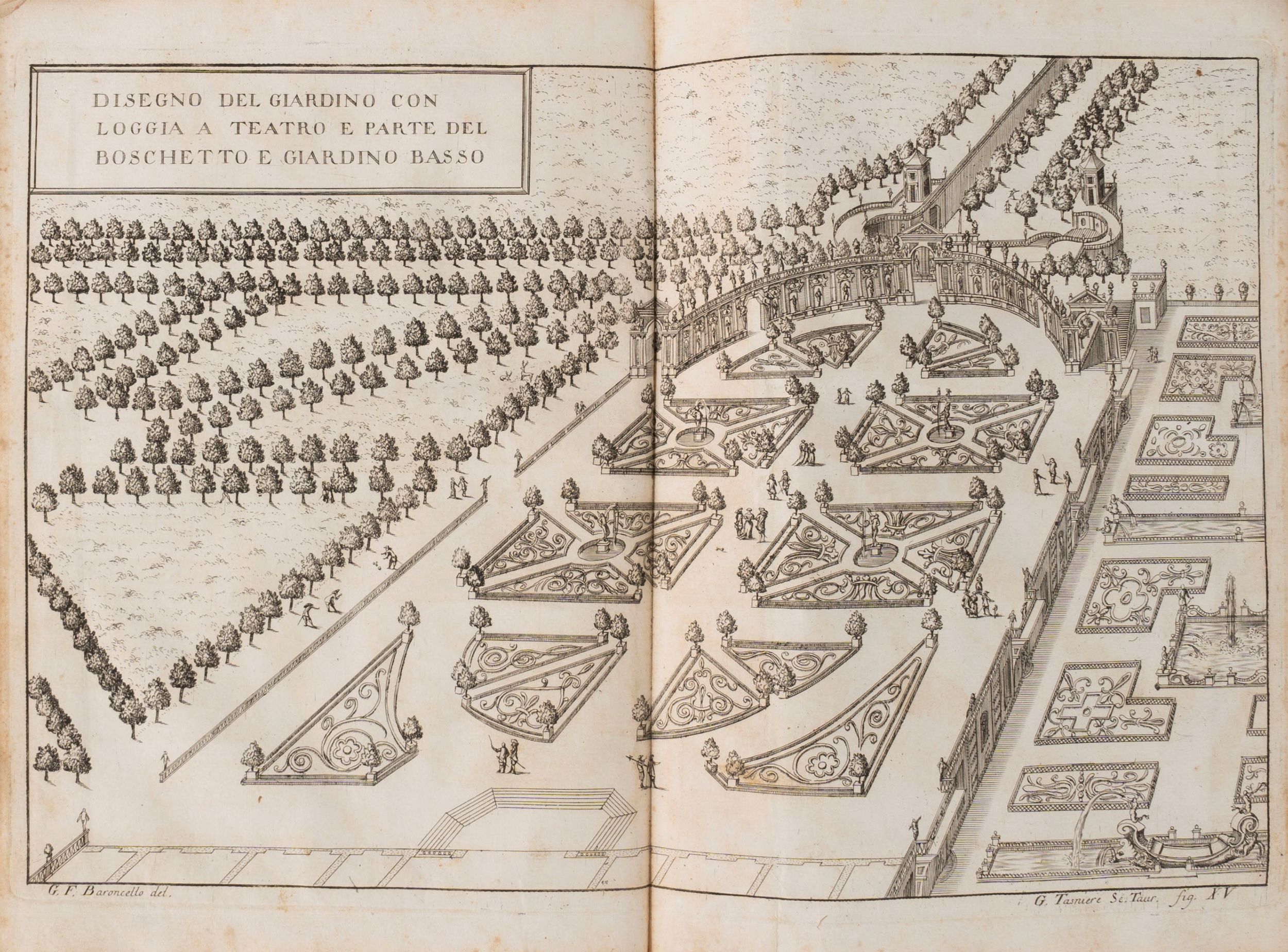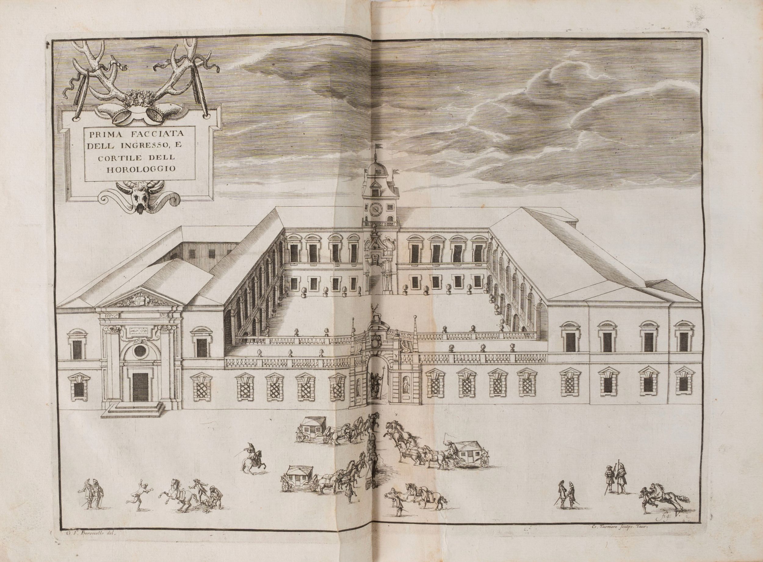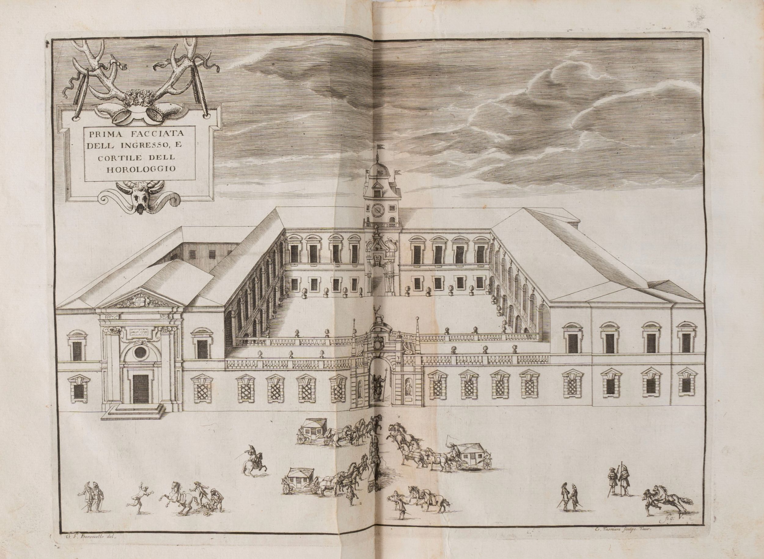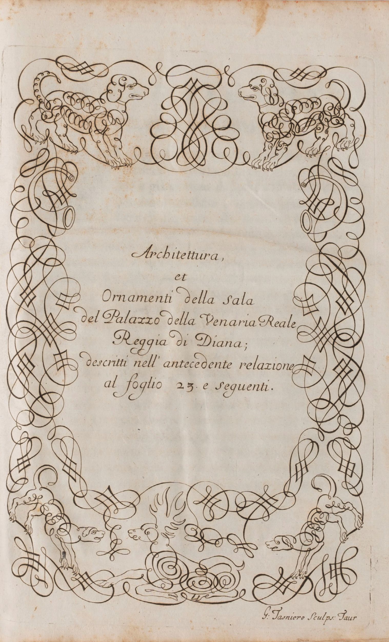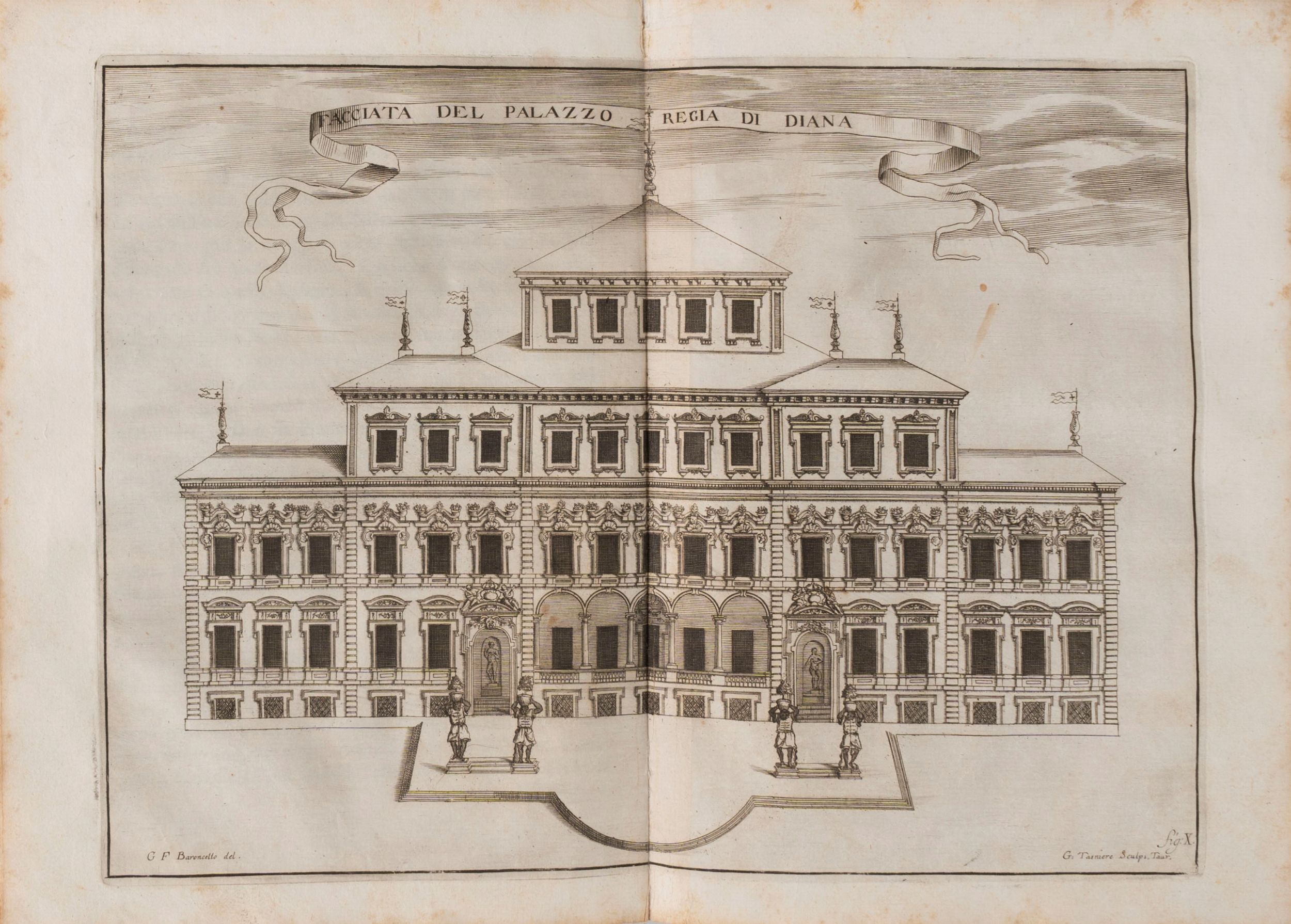 1674 Torino, Bartolomeo Zapatta, 1674. In 2°. Antiporta figurata riccamente disegnata da Baroncello e incisa da Tasniere, sonetto alla Duchessa di Savoia, Maria Giovanna, ritratto della medesima ad opera del Sacchetti, frontespizio calligrafico inciso dal Tasniere, 30 tavole fuori testo di cui molte ripiegate, altro titolo calligrafico per gli Ornamenti, 32 tavole fuori testo anche ripiegate, rinforzi e restauri ad alcuni margini o pieghe delle tavole, piccoli strappetti, legatura coeva in vitello spugnato, dorso a sei nervi, tagli a spruzzo rossi.