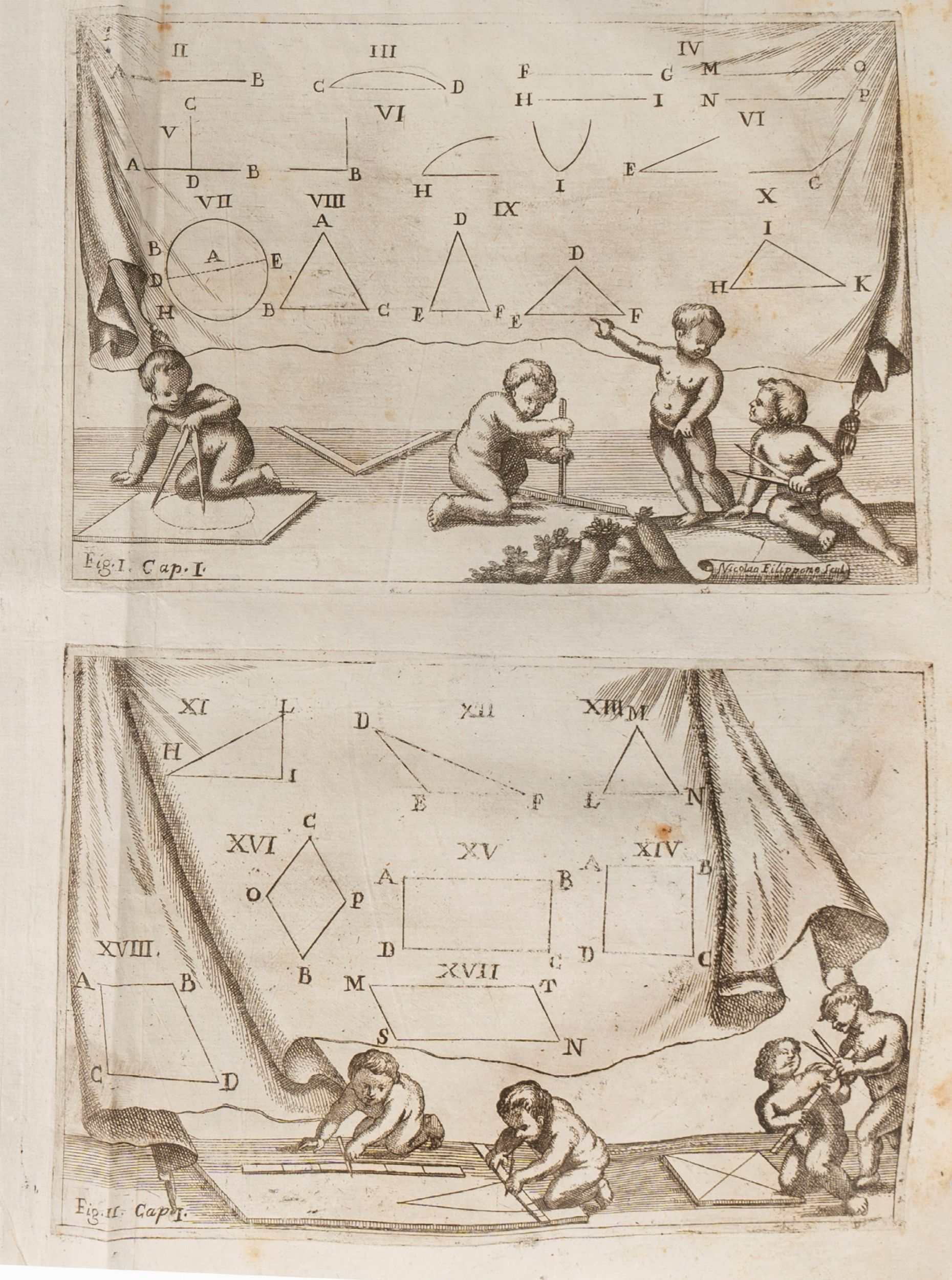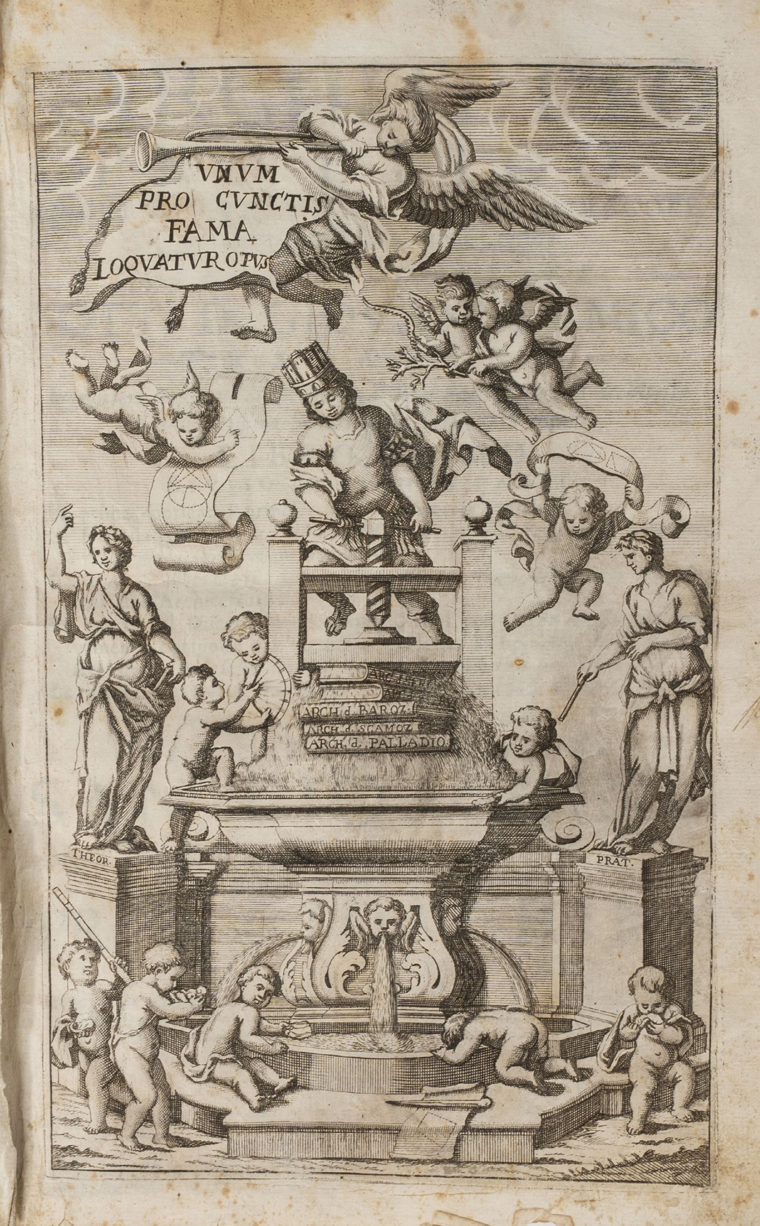Palermo, nella stamperia di Gio. Battista Aiccardo, 1726. In 2°. Solo il I volume. Antiporta allegorica raffigurante un grande torchio sotto il quale vengono impressi volumi dell’opera, attorniato da putti alati, angeli, cherubini, statue, il tutto ai lati di una fontana centrale, alla seconda carta grande effigie del patriarca Gioachino, alla terza carta ritratto in ovale del Conte Gioachino Fernandez Portocarrero, dedicatario dell’opera, 62 incisioni nel testo e fuori testo, alcune ripiegate, inclusi una serie di ritratti dei più celebri architetti da Vitruvio a Barozzi da Vignola, fioriture, lievi arrossature, qualche marginale strappetto ad alcune tavole e carte, piccola mancanza all'antiporta, carte di guardia con annotazioni e disegni manoscritti, legatura coeva in pergamena, piatto anteriore parzialmente staccato, difetti. Firma di appartenenza dell'architetto catanese Carmelo Sciuto Patti (1829 – 1898) alla carta di guardia e del padre, Salvatore Sciuto Borzì al contropiatto posteriore.