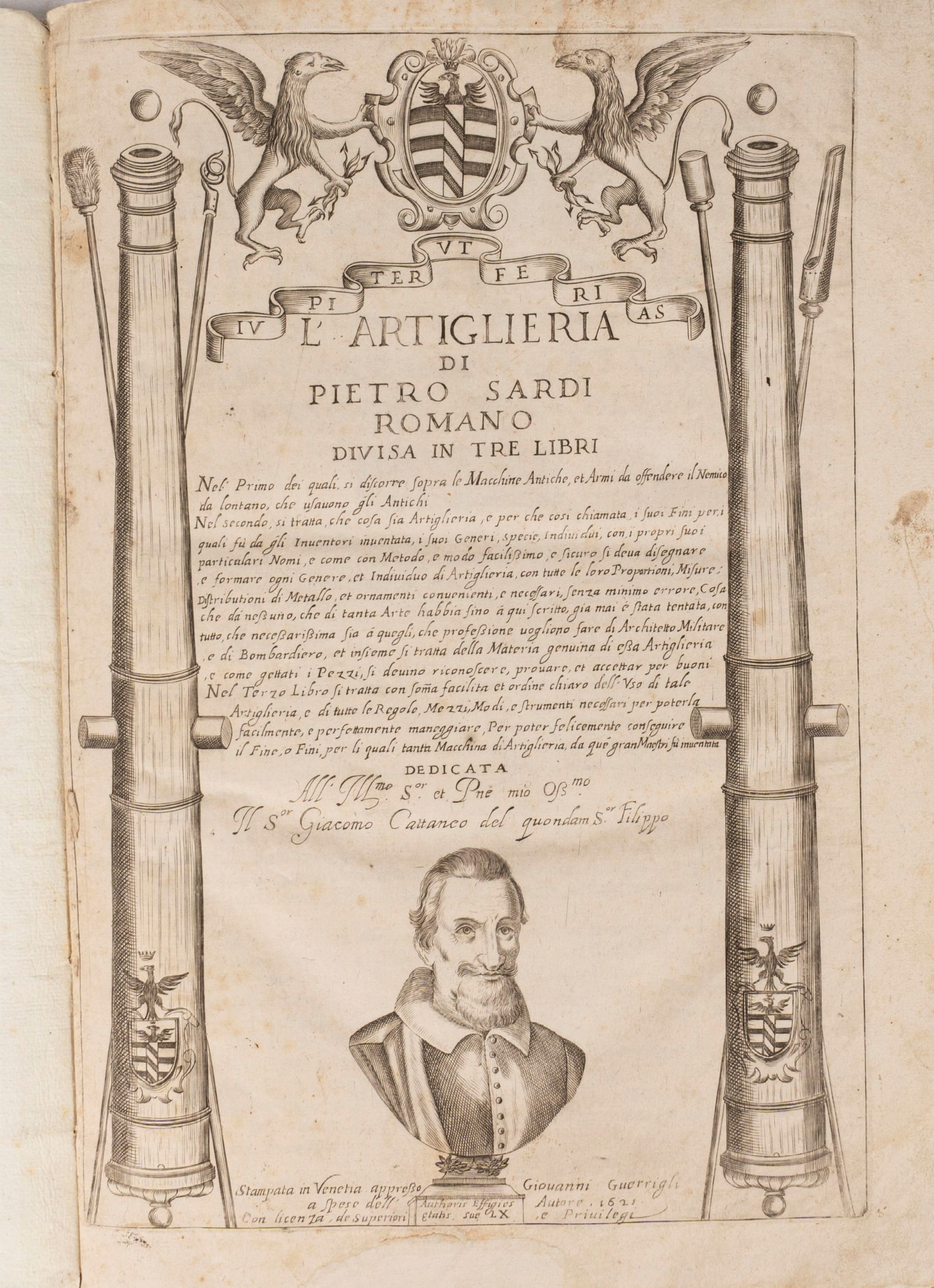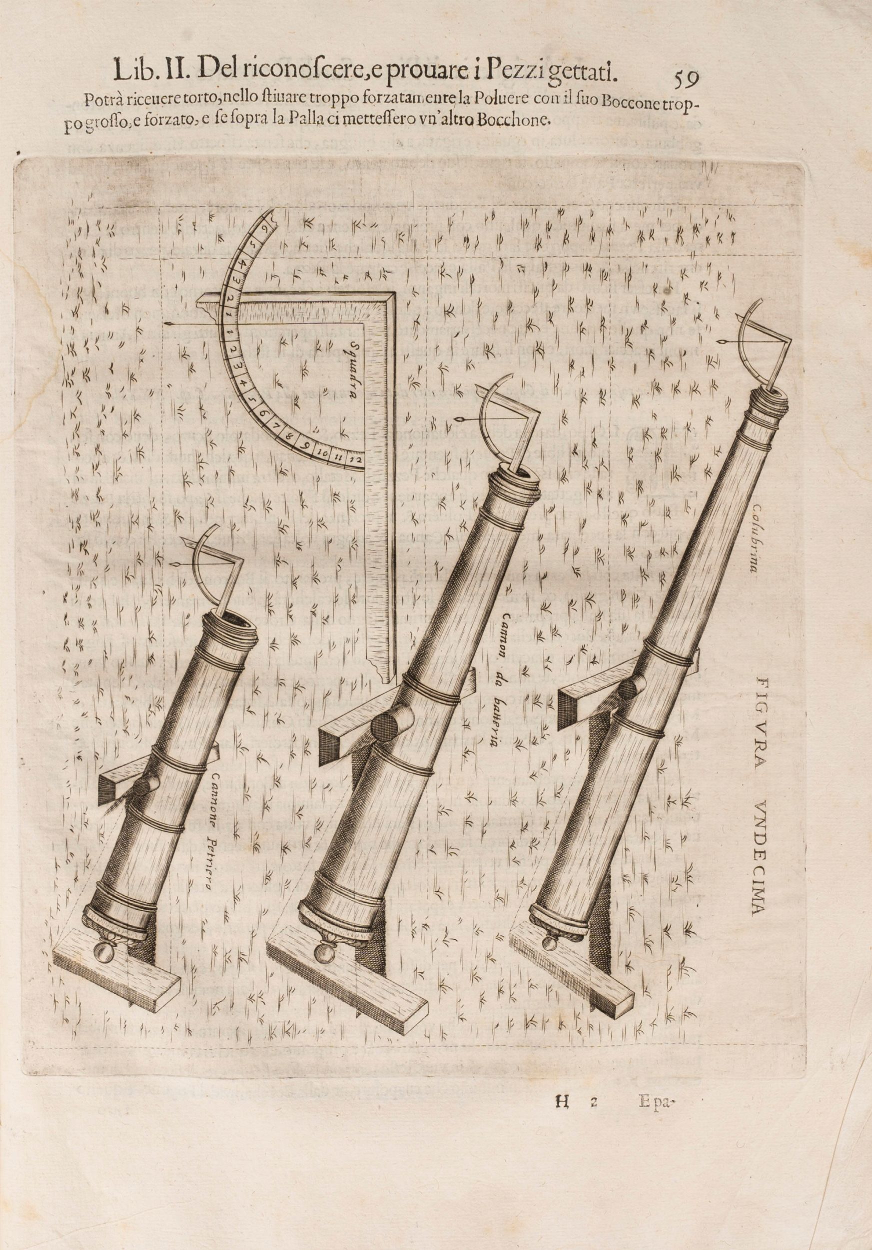 Venezia, Giovanni Guerrigli, 1621. In 2°. Ritratto dell'autore al frontespizio, racchiuso ai lati da due cannoni e sovrastato dallo stemma di Giacomo Cattaneo, dedicatario dell'opera, capilettera e finalini xilografici, 27 incisioni di cui 13 a piena pagina raffiguranti pezzi di artiglieria assemblati e in spaccato, munizionamenti e geometrie di tiro, lievi fioriture, qualche lieve arrossatura e piccola macchia, leggero alone al margine di alcune carte, legatura coeva in cartonato, lievi difetti.