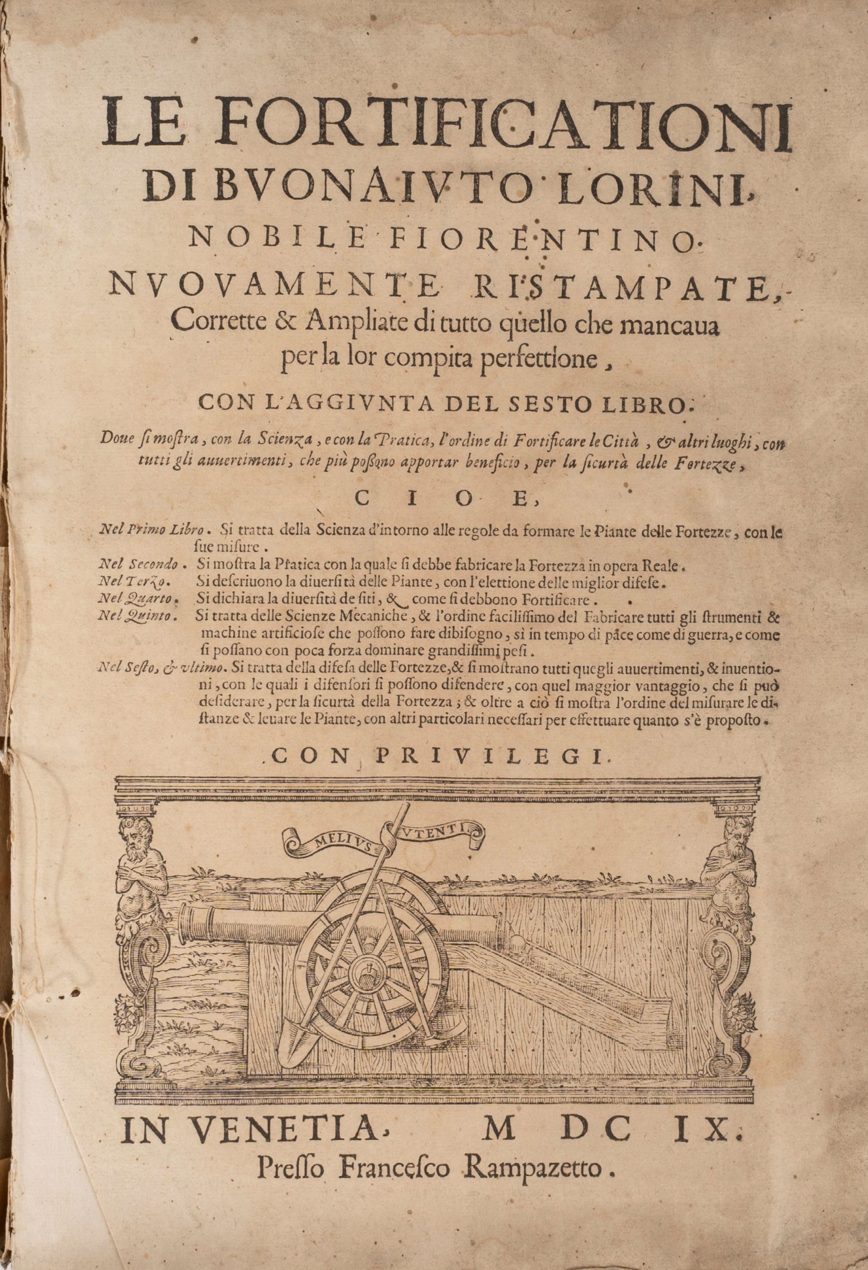 1609 Venezia, Rampazetto, 1609. In 2°. Vignetta xilografica al frontespizio, ritratto dell'autore inciso in rame da Kilian al verso della carta a6, xilografie nel testo raffiguranti piante di fortificazioni, disegni dei particolari architettonici, schemi di attacco e difesa, strumenti di lavoro, il libro VI con frontespizio autonomo, lieve brunitura, rare fioriture, lavoro di tarlo al margine interno dei primi fascicoli, fascicolo B staccato, margini di pp. 92-93 con lievi difetti, legatura coeva in pergamena, dorso a 4 nervi con titolo manoscritto, piccola mancanza al dorso, lievi difetti.