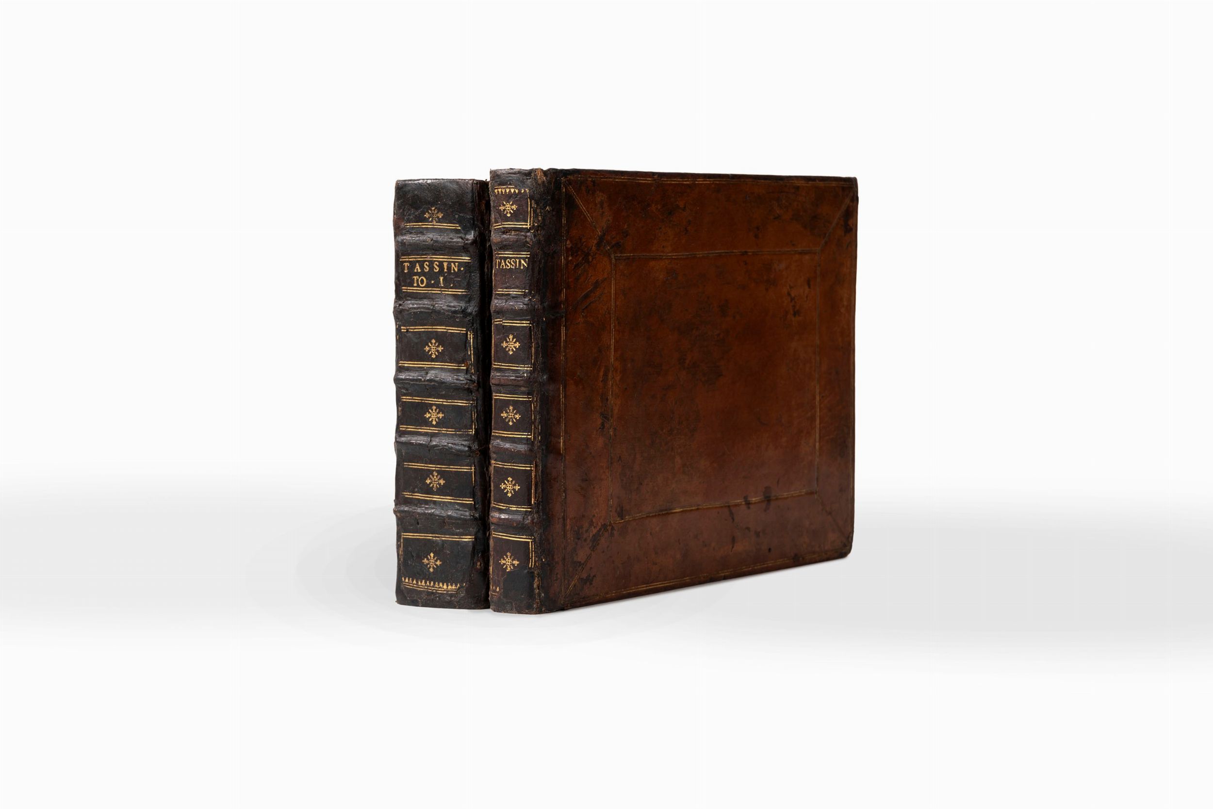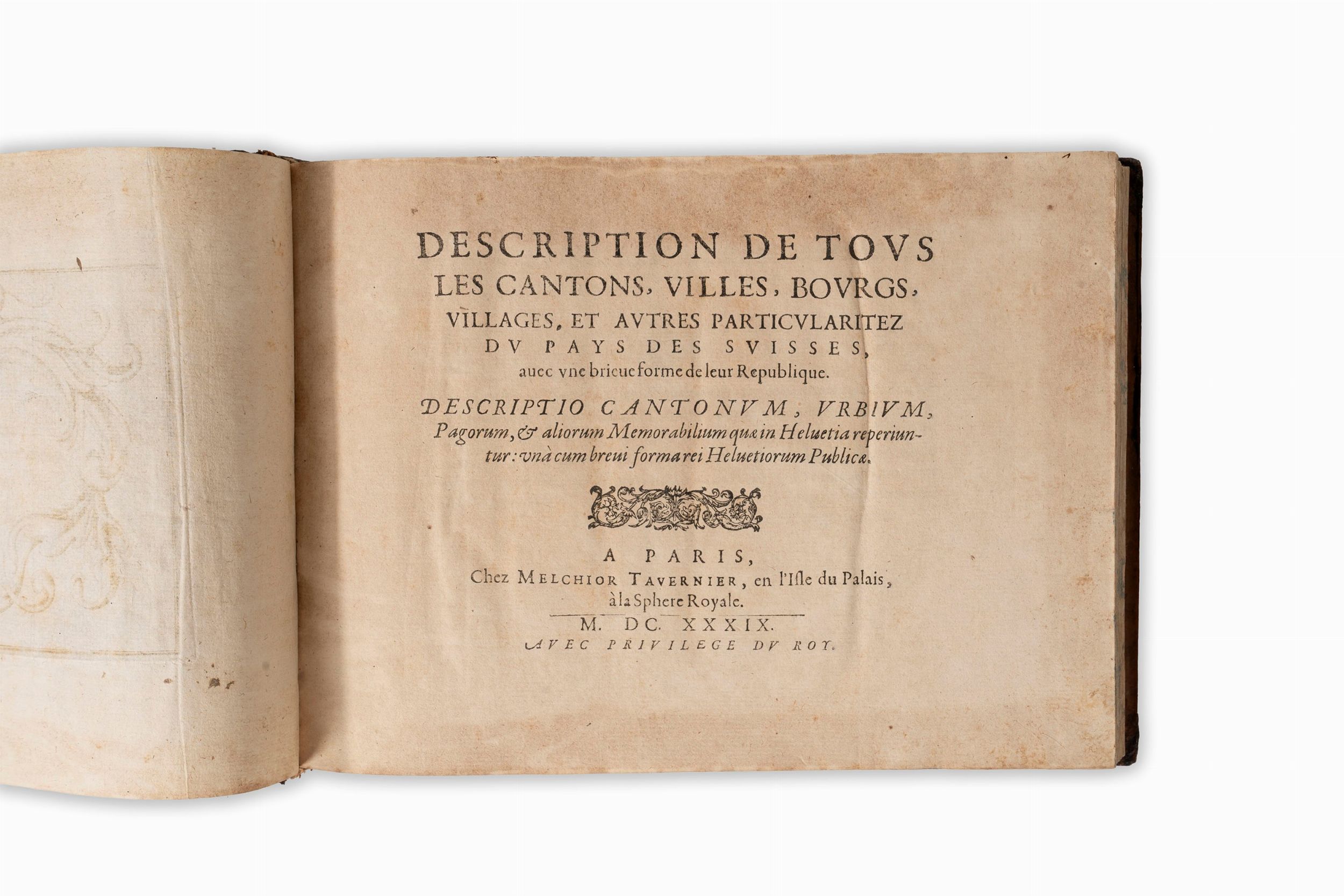 Parigi, Sebastien Cramoisy-Melchior Tavernier, 1638. In 4° oblungo in tutta pelle. Con filetti dorati ai piatti. 40pp, (5cc), 45 tavole incise; 27 tavole incise; 28 tavole; 18 tavole; 17 tavole; 2+52 tavole; 28 tavole; 44pp, 3 tavole +22 tavole; 40 tavole; 19 tavole; 5 tavole; 48 tavv; 7 tavv; 23 tavv; 26 tavv; 19 tavv; 18 tavv. Per un totale di 452 tavole. Leggera brunitura, più intensa su alcune carte, lieve gora d'acqua ai primi fascicoli, legatura coeva in pelle, impressioni in oro al piatto, autore in oro al dorso a 5 nervi, lievi difetti. Insieme nel lotto Tassin, Christophe Nicolas, Description de tous les cantons, villes, et autres particularitez du Pays des Suisses. Parigi, Melchior Tavernier, 1639 1638 In 4° oblungo in tutta pelle. Con filetti dorati ai piatti.(1cc), 64pp, 1cc+35 tavole incise dei cantoni della Svizzera; 2cc+52 tavole incise dei Regni e Province dell’Alta e Bassa Alemagna; 3cc+68 tavole incise di tutte le Province di Francia e di Spagna. Per un totale di 161 tavole. Leggera brunitura ai primi fascicoli, lievi fioriture, legatura coeva in pelle, impressioni in oro al piatto, autore in oro al dorso a 5 nervi, lievi difetti.