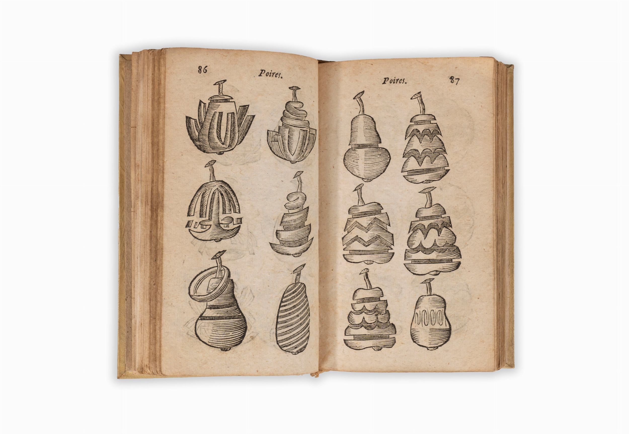 Parigi, Jean Ribou, 1682.In 12°. Con numerose incisioni di tavolate e intagli di carne e frutta, testate e finali xilografici e iniziali decorative, leggera brunitura, legatura dell'epoca in pergamena.