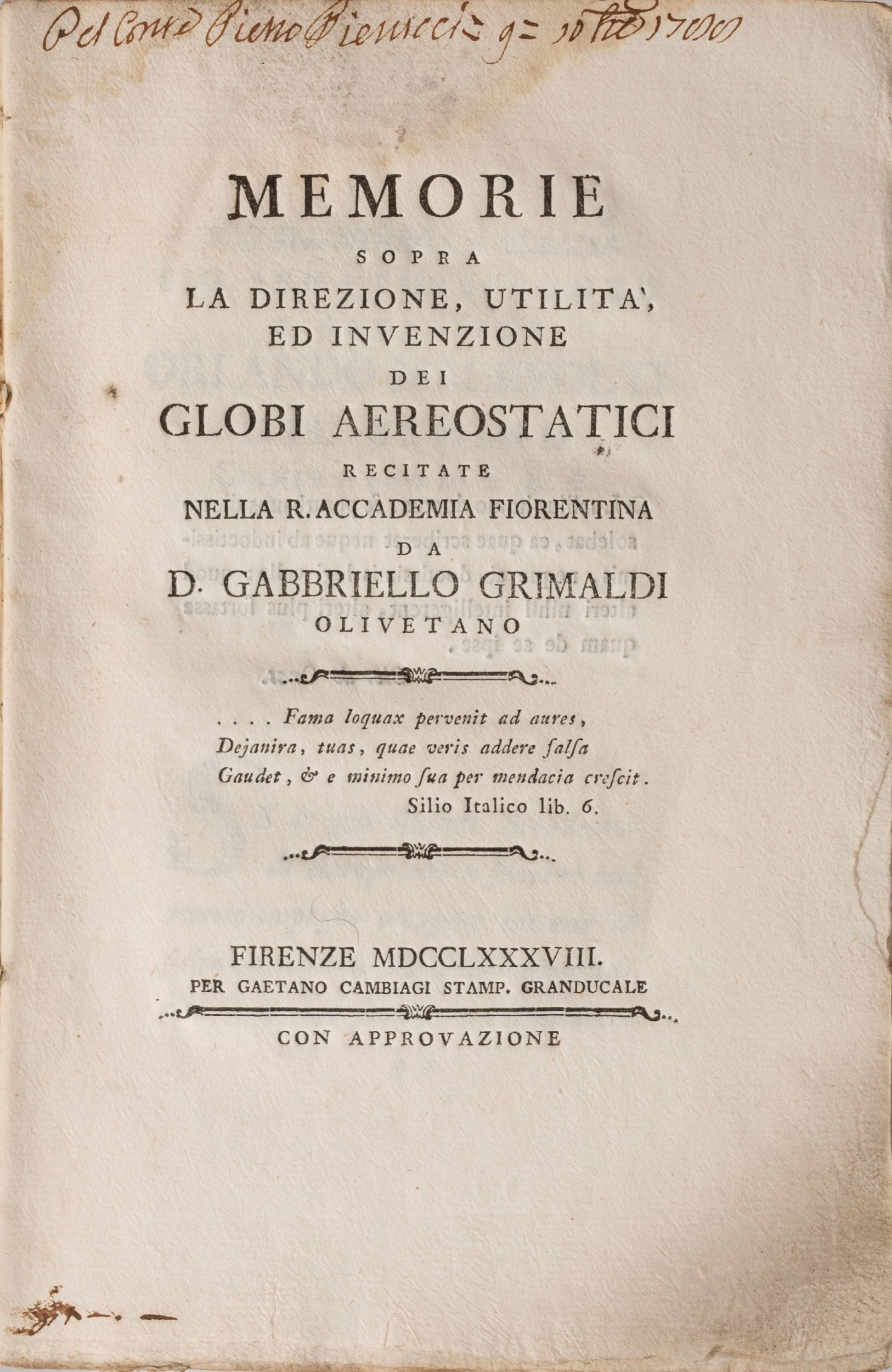 1788 Firenze, Gaetano Cambiagi, 1788. In-8°, 88pp., gora di umidità, più intensa alle prime carte, legatura coeva in cartoncino, piccole mancanze al dorso, tracce di umidità, lievi difetti. Firma al frontespizio.