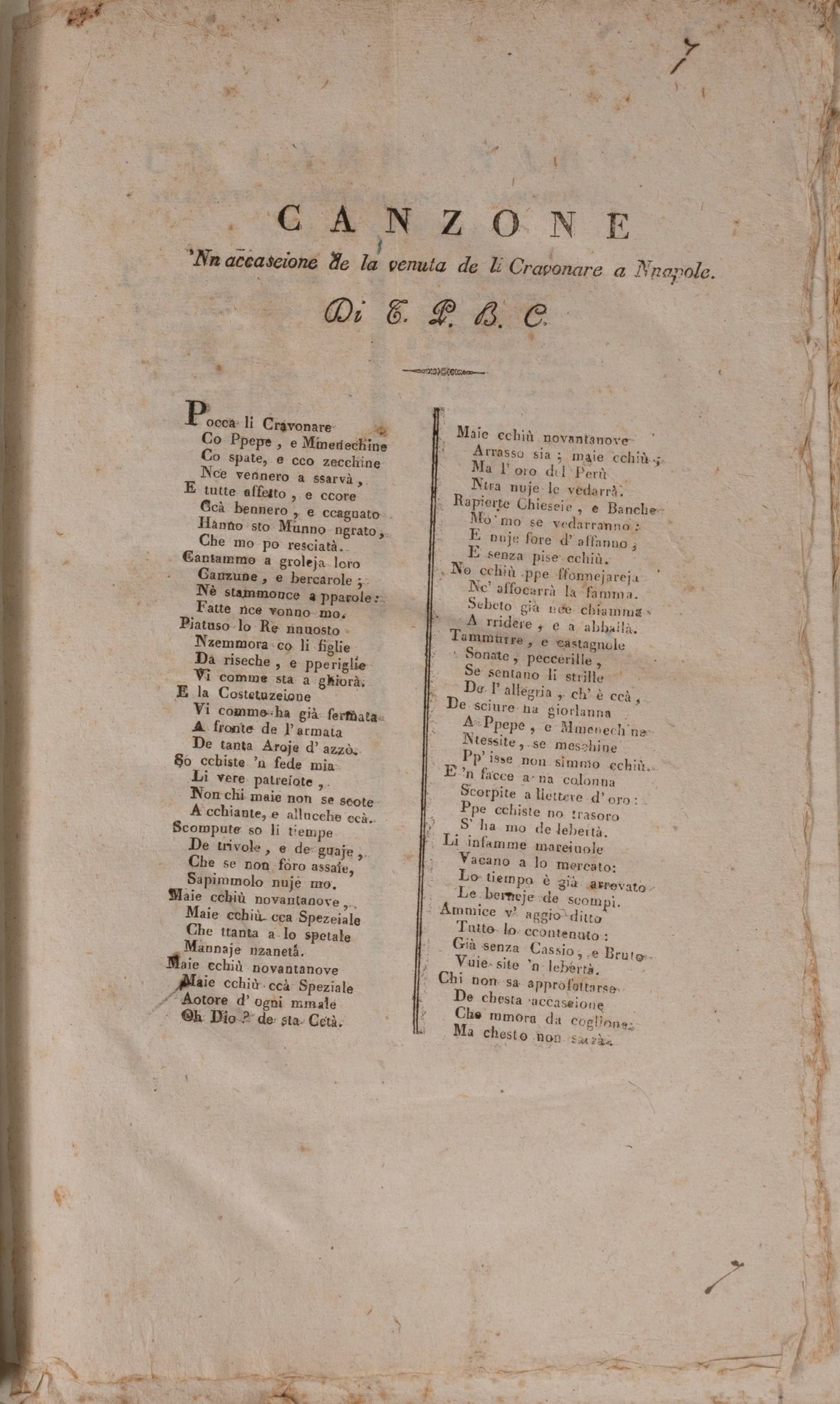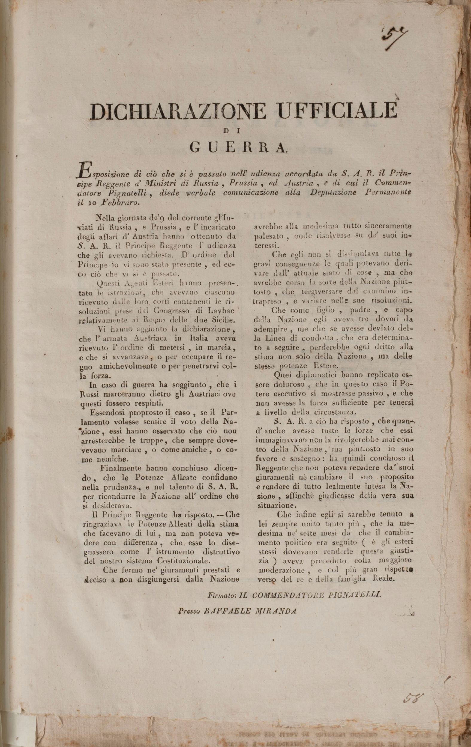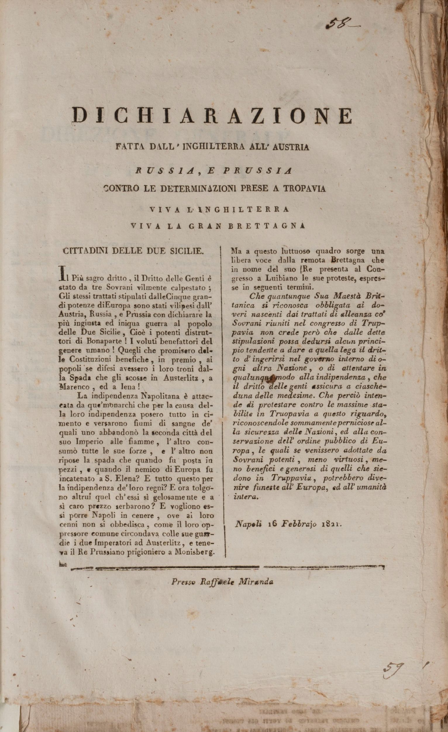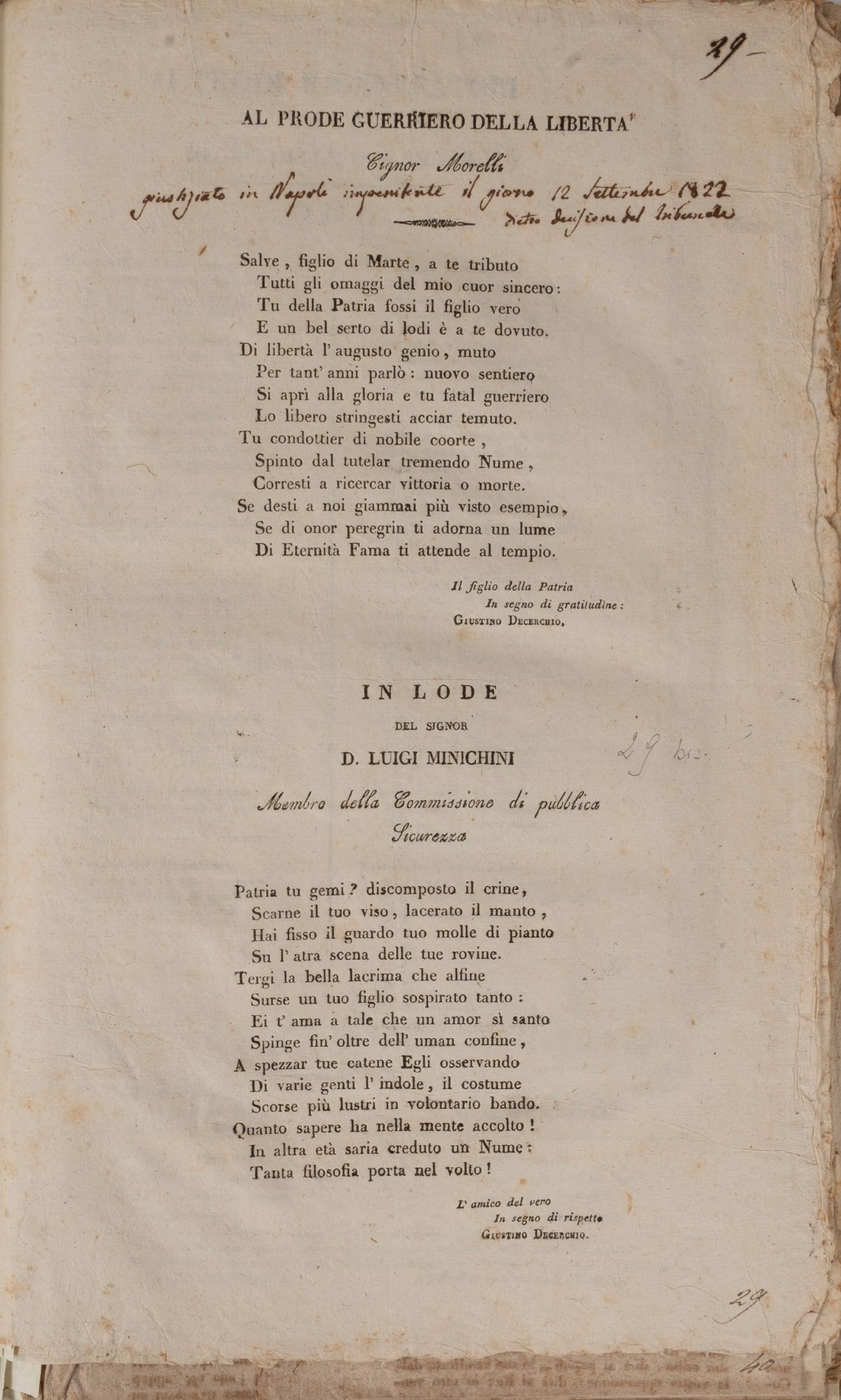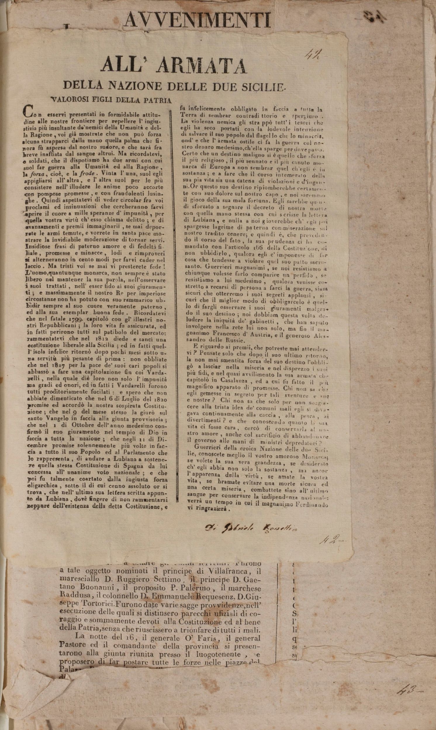 Napoli, 1820 - 1821. Folio, 159 manifesti, alcuni in dialetto, di vario formato (il più piccolo cm. 18 x 26, il più grande cm. 54 x 77,5), alcuni di due o più pagine e alcuni stampati fronte retro con testi e date diverse; più un indice manoscritto di due pagine. In fine 8 decreti del periodo di Giuseppe Napoleone presenti nell'indice ma non legati. La raccolta non è in ordine cronologico. Qualche restauro, leggera brunitura più intensa su poche carte, qualche fioritura. Legatura del tempo in mz. pergamena, tassello con titolo e fregi in oro al dorso.