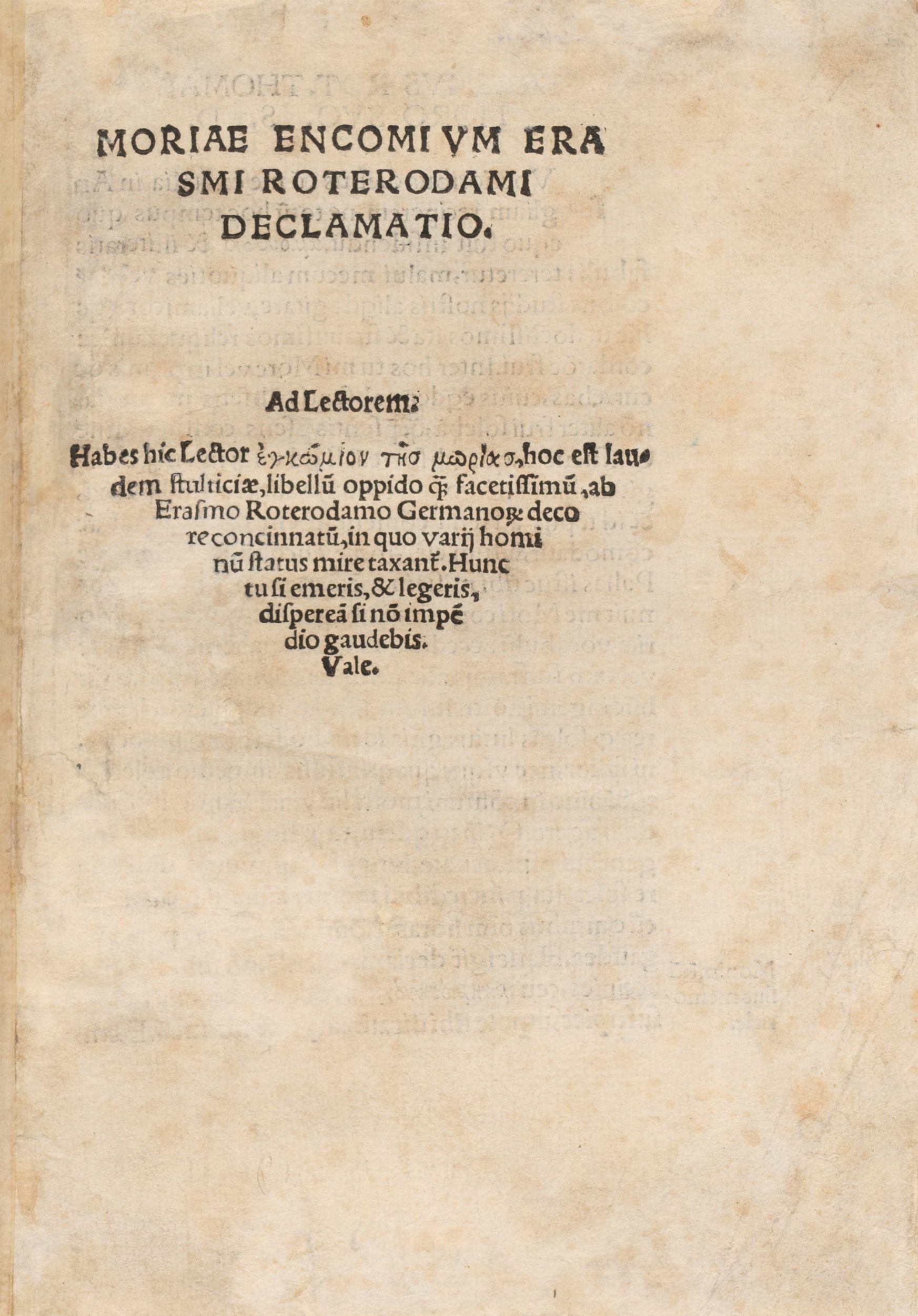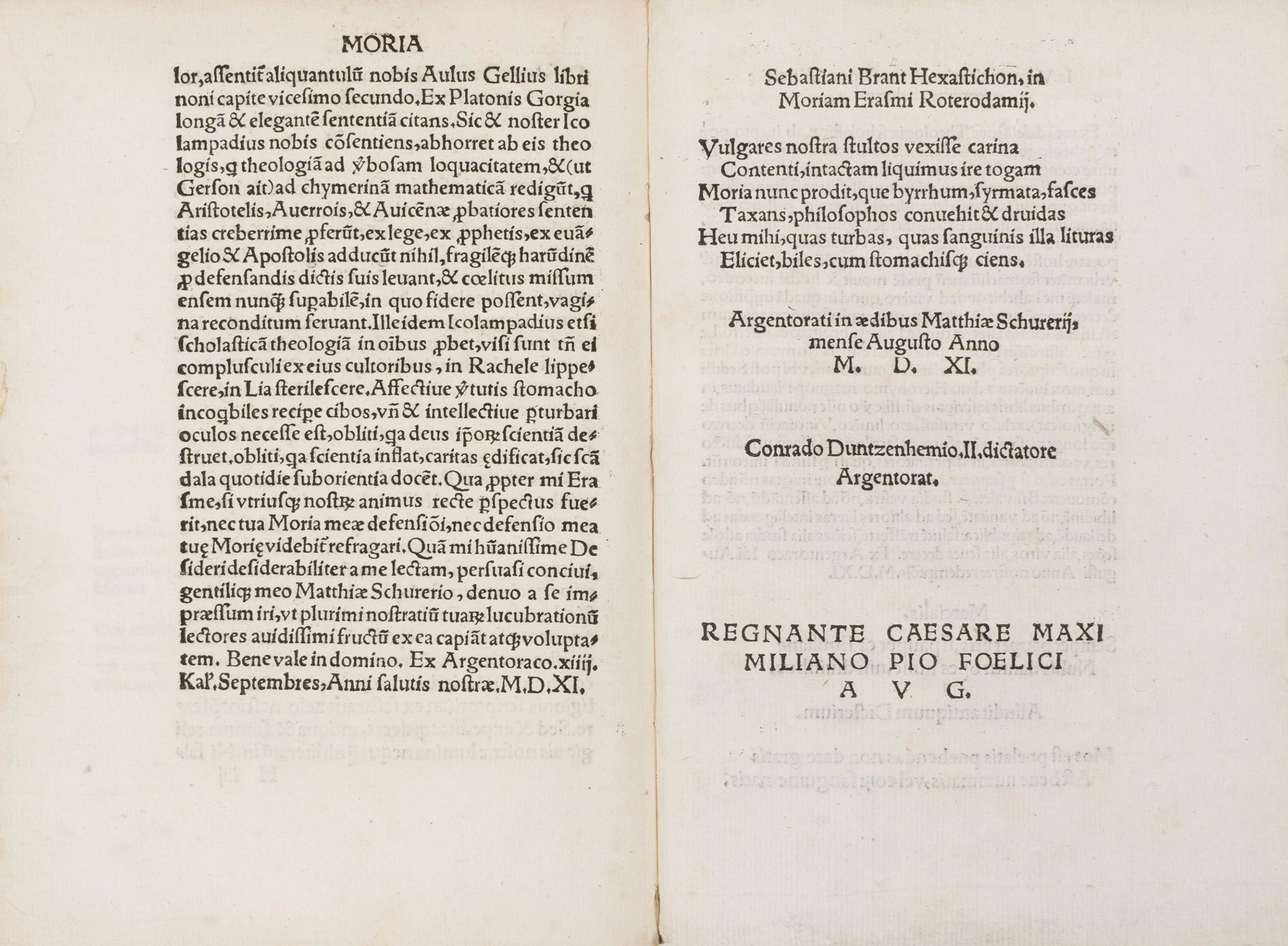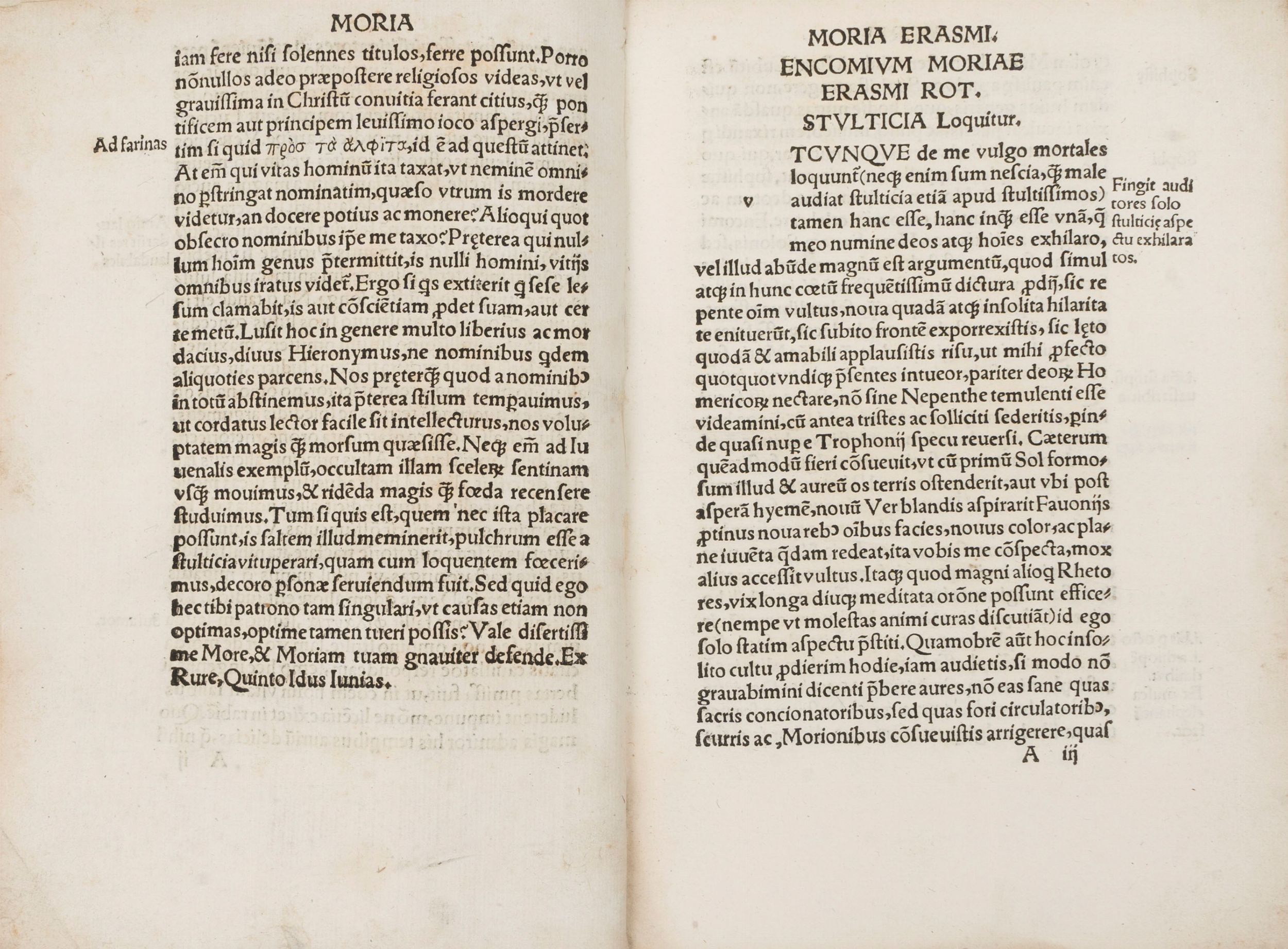 1511 Strassburg, Matthias Schurer, August 1511. In 4°. 202 x 140 mm. Caratteri romani, alcuni greci, spazi iniziali con lettera guida, presenti il raro foglio H4, H5 e soprattutto il rarissimo foglio bianco H6, copia dagli ampi margini, delicati restauri alla carta del titolo, rimontata, piccole riparazioni marginali a c. A8, senza perdite. Legatura in pergamena floscia del sec.XVI con titolo al dorso.