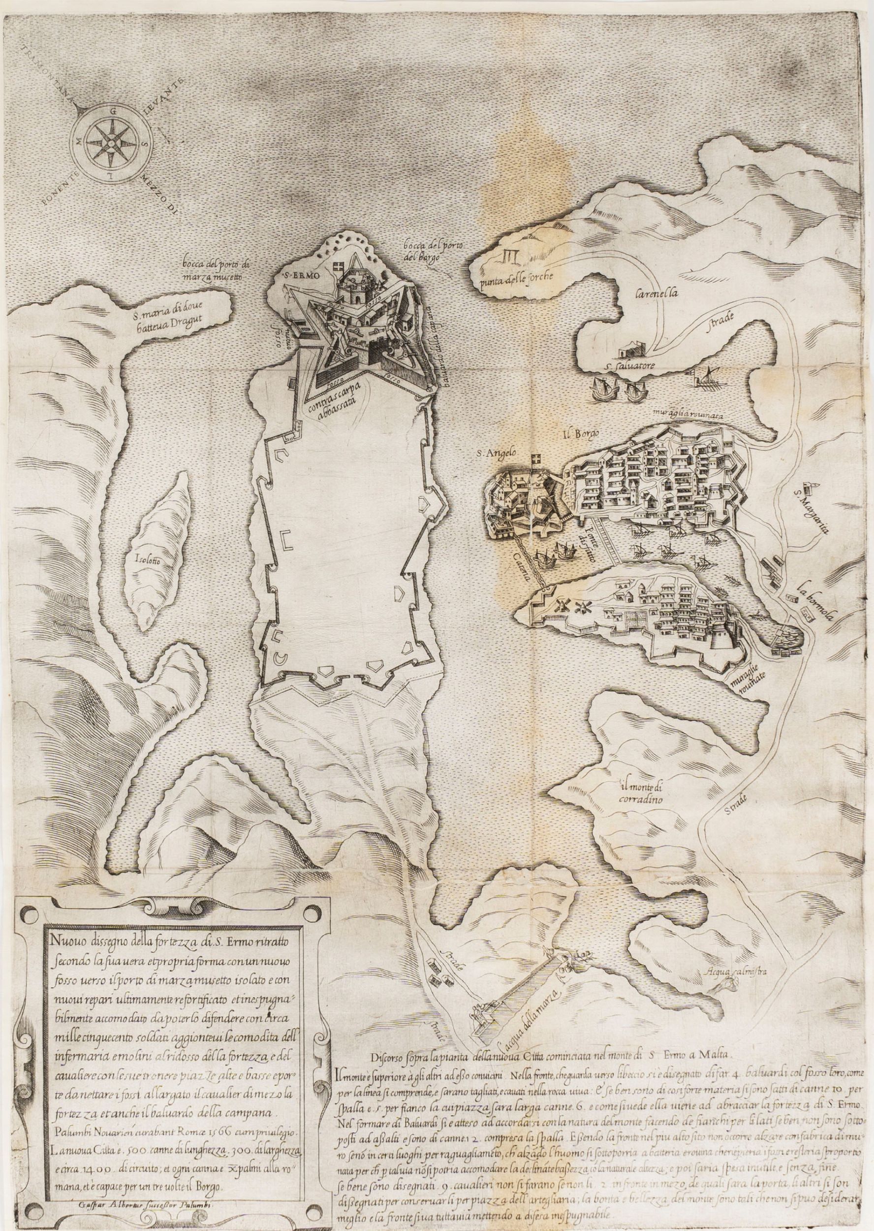 Incisione su rame all'acquaforte. Misura cm. 31,5 x 44,5, rifilata alla battitura del rame. In alto a sinistra Rosa dei Venti. In basso accurato testo descrittivo della nuova città in costruzione.