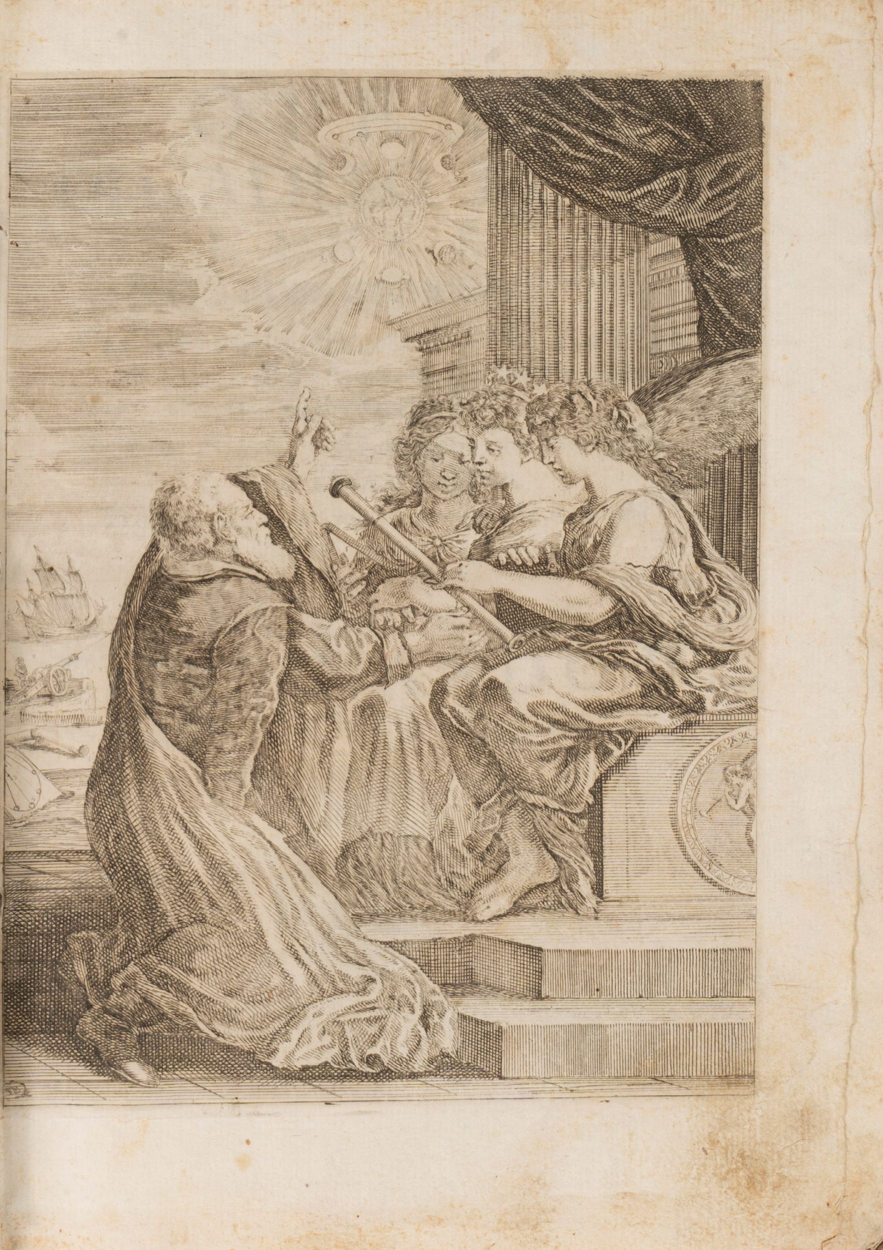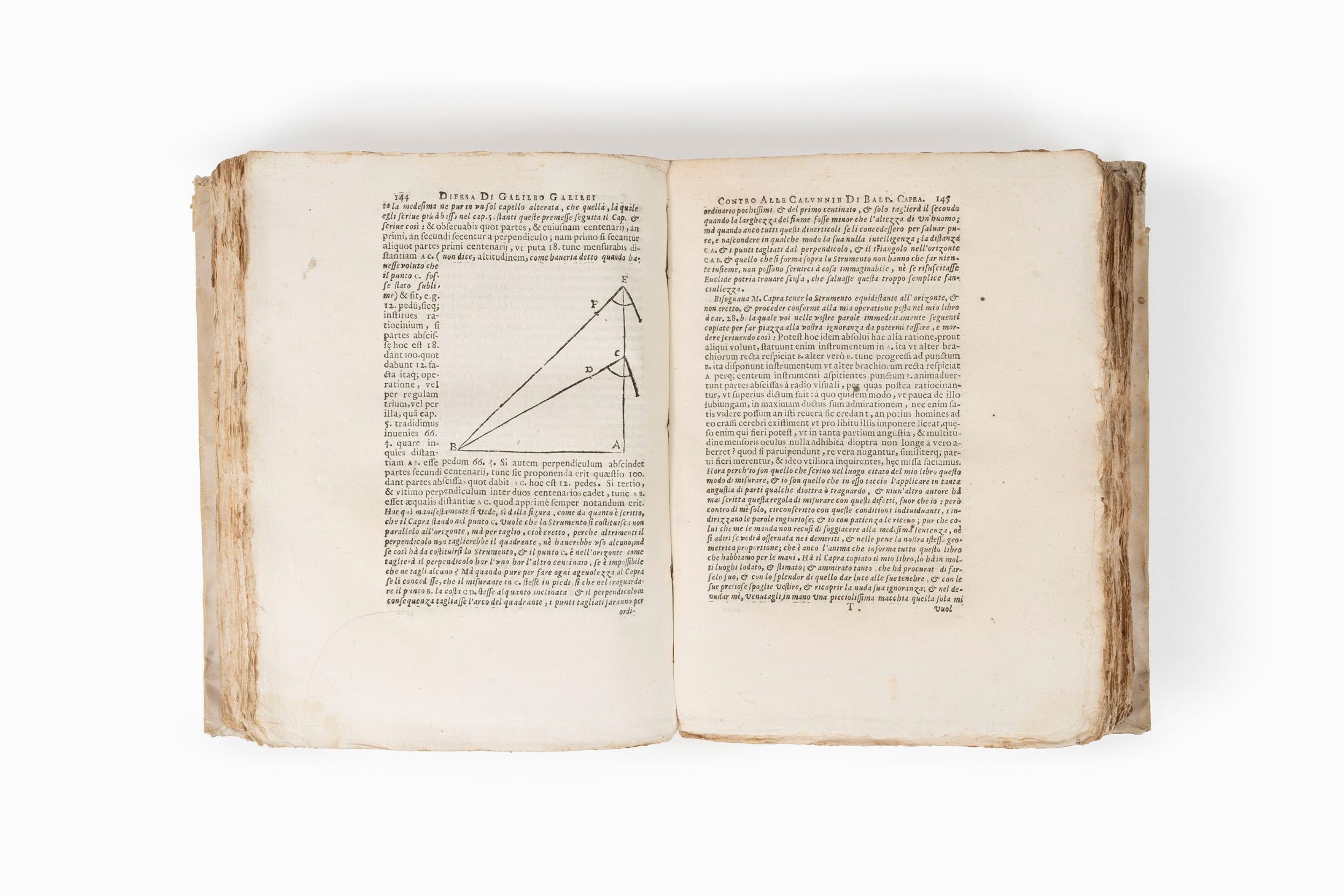 1656 Bologna, per gli HH, del Dozzi, 1655-1656. 4°, voll. 2; volume primo: 13 ff. compresa l’antiporta di Stefano Della Bella e il il ritratto di Galilei inciso su rame da Francesco Villamena; 48 pp., 48 pp., (4) ff., 160 pp., (2) ff., 68, 127 pp., (2) ff., 264, 43 pp; volume II: (1) f., 60 pp., (8) ff., 104 pp., (2) ff., 105-156, 48 pp., (4) ff., 179, (1) pp., (1) ff., 53-106 pp., (1) f., 103-126 pp., (4) ff., 238 [i.e., 242] pp., (3) ff.; manca la tavola raffigurante il compasso. Alcune bruniture e fioriture, rare gore d'acqua. Legatura coeva in piena pergamena coeva, titolo calligrafico, mancanze, sciupata. Esemplare intonso a pieni margini.