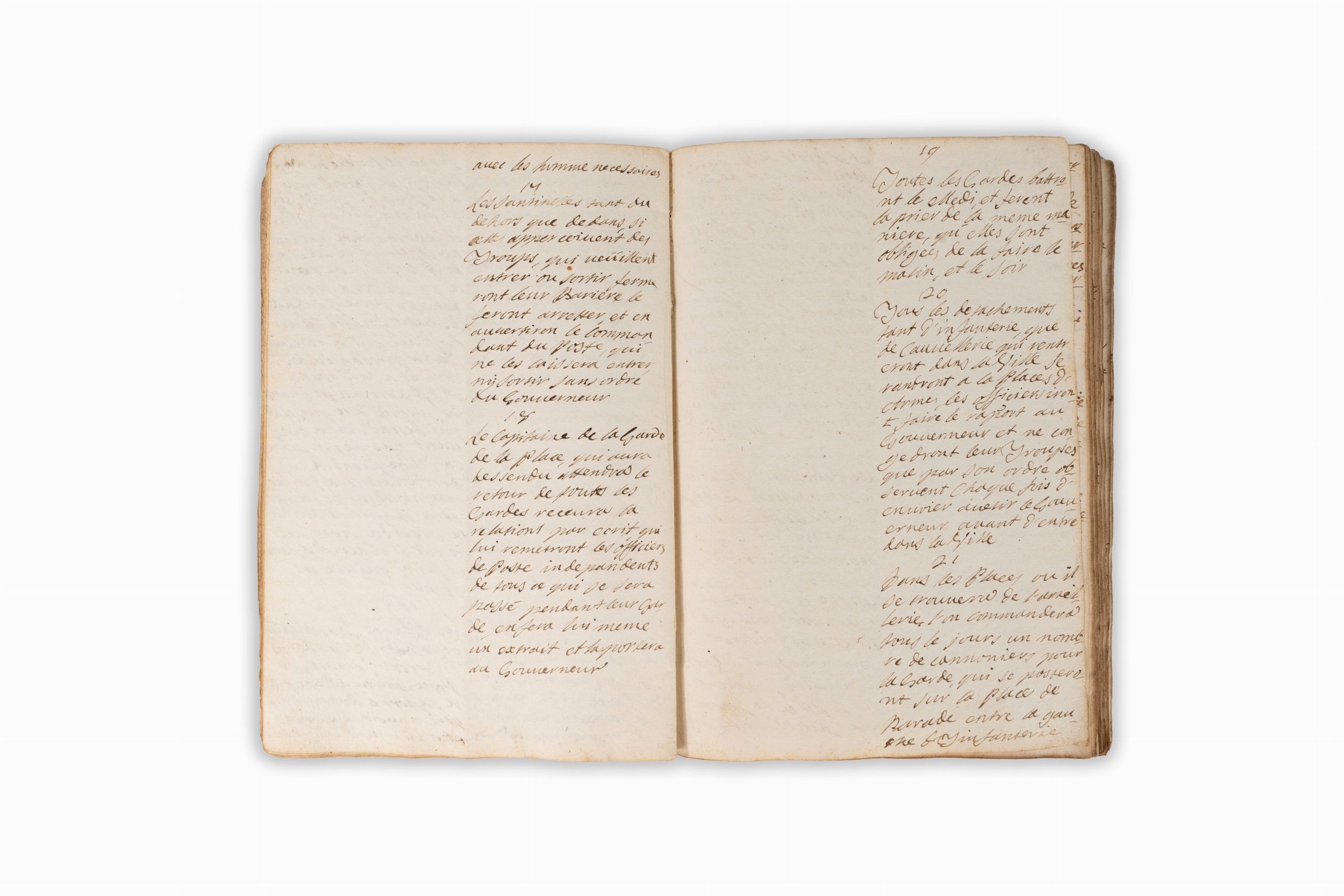 1724 Diario/taccuino manoscritto vergato da un'unica mano, 252 x 170 mm., contenente nella prima parte la serie delle Ordinanze emanate da Vittorio Amedeo di Savoia (in francese), annotate su una colonna per pagina, a seguire la trascrizione di numerose lettere, quindi alcune pagine di calcoli/conti, un testo letterario dal titolo Satire XI Du Sieur sviluppato per sette pagine e in fine una paginetta di annotazioni relative alle nascite di alcuni nobili di casa Savoia. Tutto da studiare.