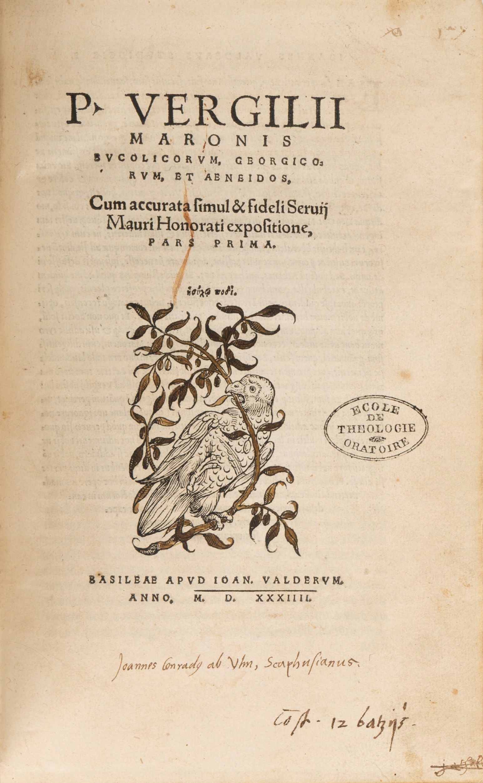 1534 Basilea, apud Ioan. Valderum, 1534. In 4°. incisione raffigurante un uccello al frontespizio con un ramoscello in bocca, capilettera abitati. marginali fioriture, splendida legatura coeva in pelle di scrofa con impressioni a secco, sul piatto superiore si legge la data 1540, un fermaglio metallico conservato, sciupata. Diverse note di possesso al contropiatto, al foglio di guardia e al frontespizio, di epoche diverse.